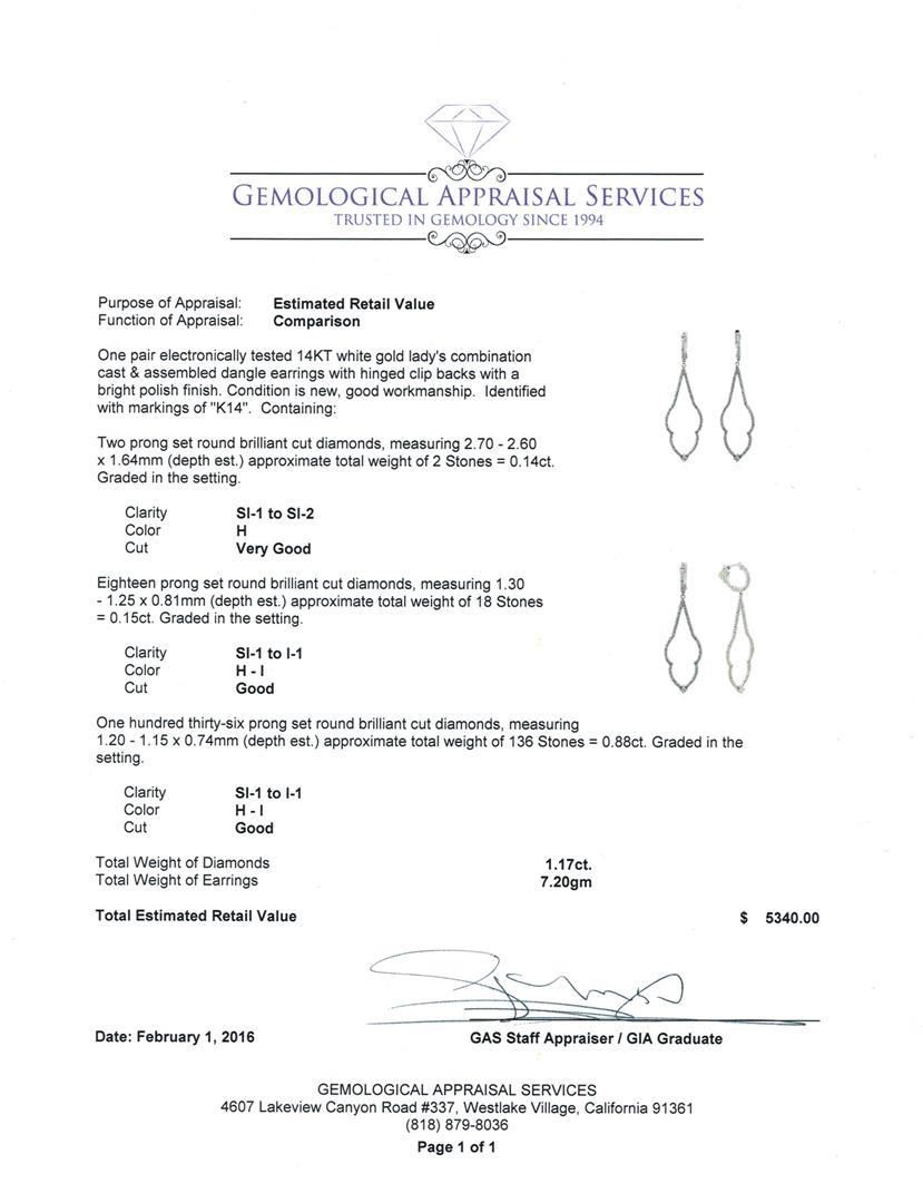 One pair electronically tested 14KT white gold lady's combination cast & assembled dangle earrings with hinged clip backs with a bright polish finish. Identified with markings of "K14". Condition is new, good workmanship. Containing: Two prong set round brilliant cut diamonds, measuring 2.70 - 2.60 x 1.64mm (depth est.) approximate total weight of 2 Stones = 0.14ct. Graded in the setting. Clarity: SI-1 to SI-2. Color: Very Good Eighteen prong set round brilliant cut diamonds, measuring 1.30 - 1.25 x 0.81mm (depth est.) approximate total weight of 18 Stones = 0.15ct. Graded in the setting. Clarity: SI-1 to I-1. Color: H - I. Cut Good One Hundred Thirty-Six prong set round brilliant cut diamonds, measuring 1.20 - 1.15 x 0.74mm (depth est.) approximate total weight of 136 Stones = 0.88ct. Graded in the setting. Clarity: SI-1 to I-1. Color: H - I. Cut Good. Total Weight of Diamonds 1.17ct. Total Weight of Earrings 7.20gm. GAS Appraised.