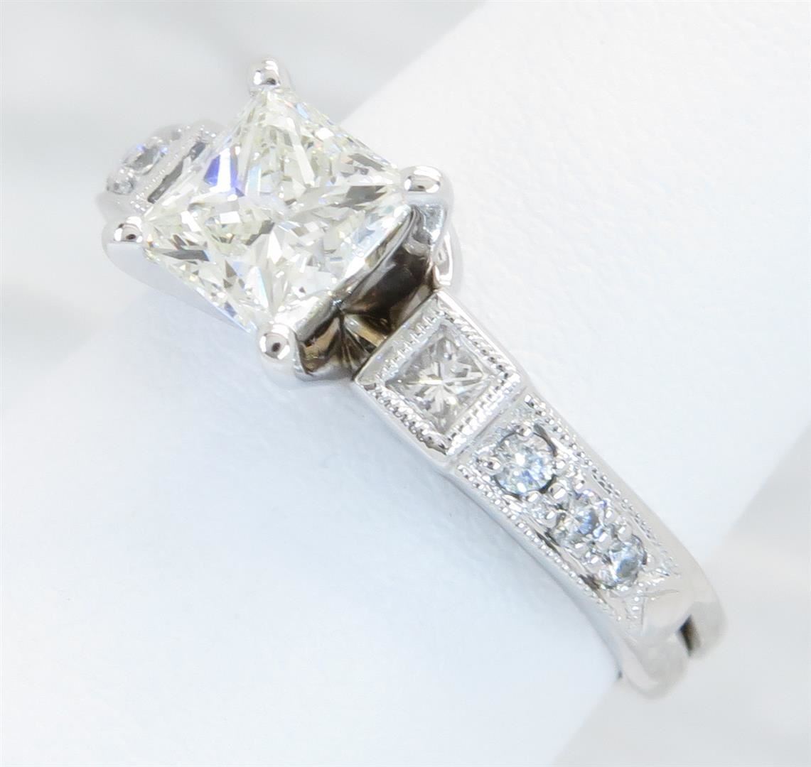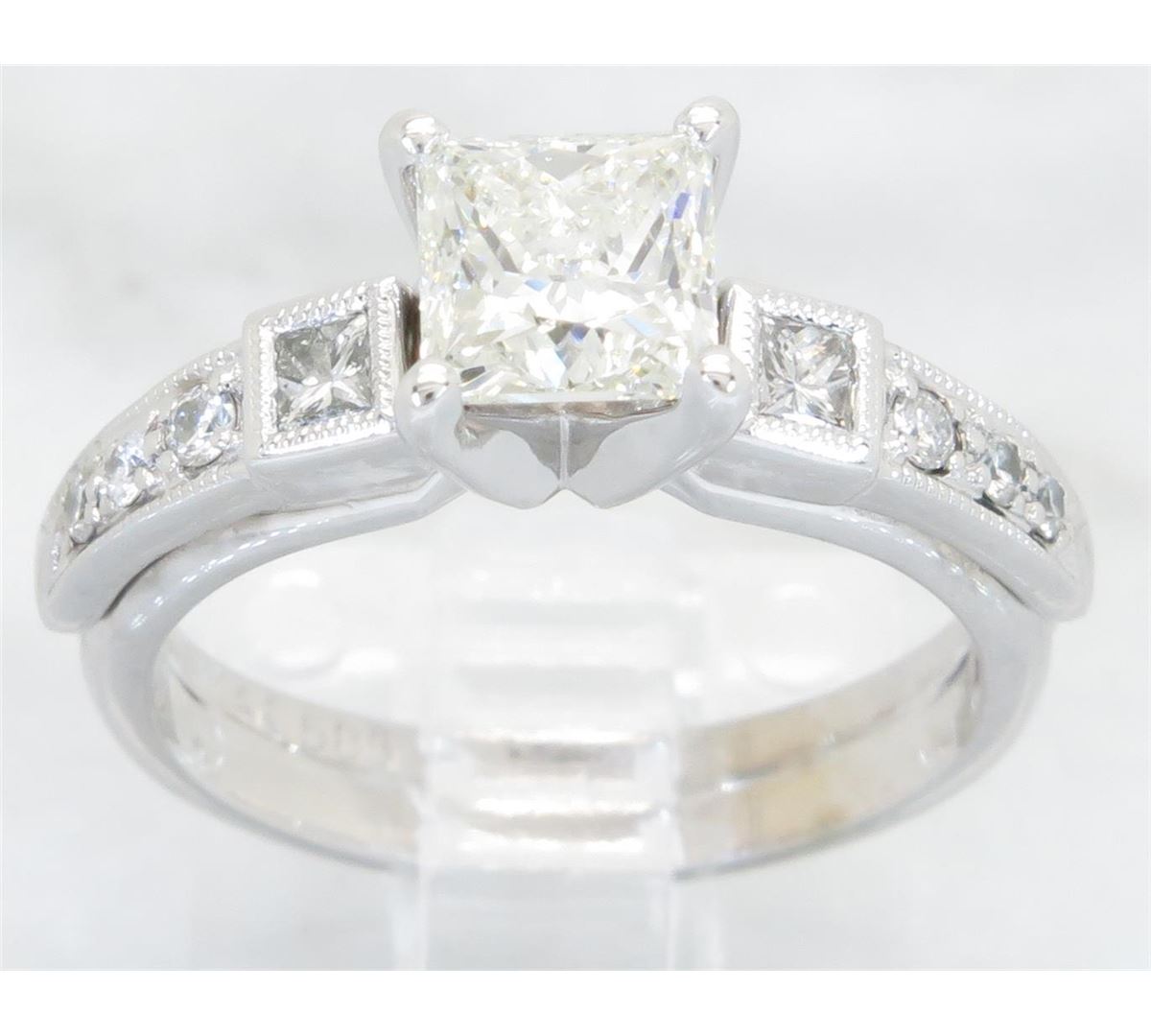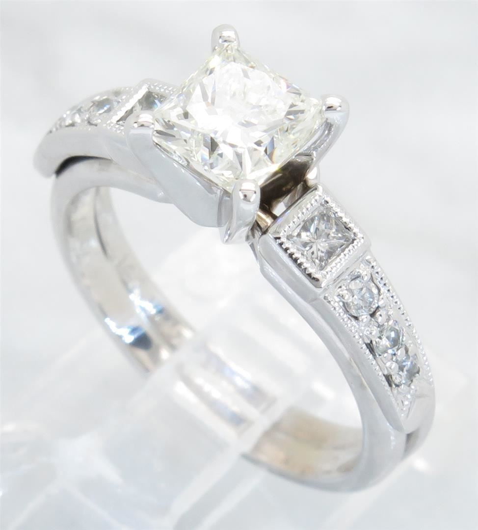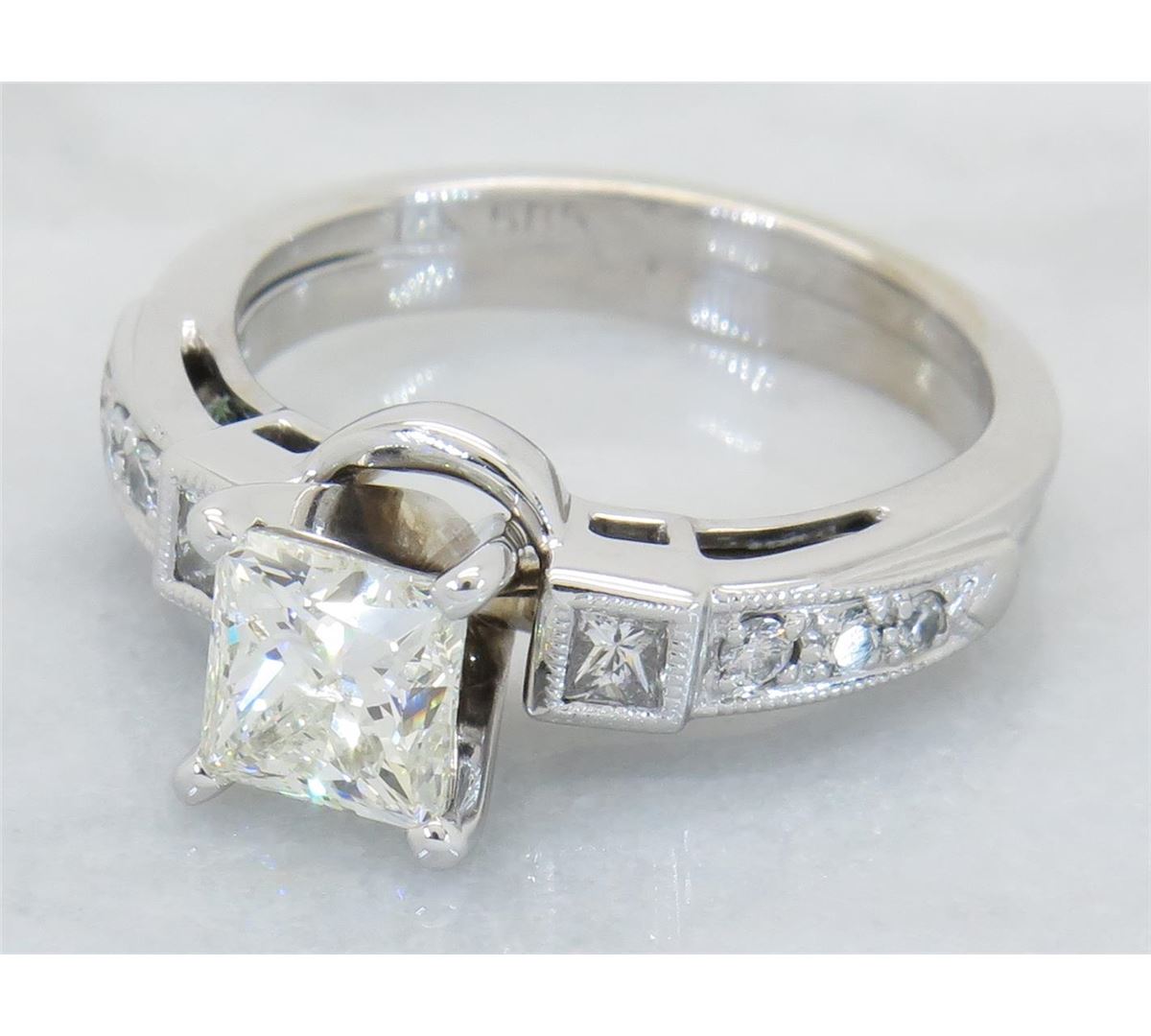 One tested 14K white gold diamond ring. Containing: One Princess Cut Diamond. Approximate Size: .92CT, Clarity: I, Color: H-I. Approximate total diamond weight: 1.17CTW. All diamonds are graded in the mounting unless otherwise stated. Weight of ring: 4.4 grams, Size: 4.5. This ring is a solitaire diamond ring with an enhancer soldered together.