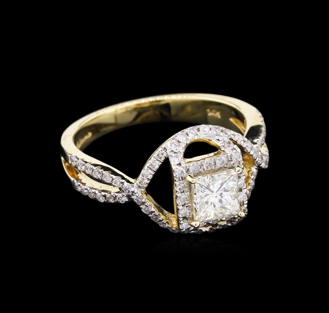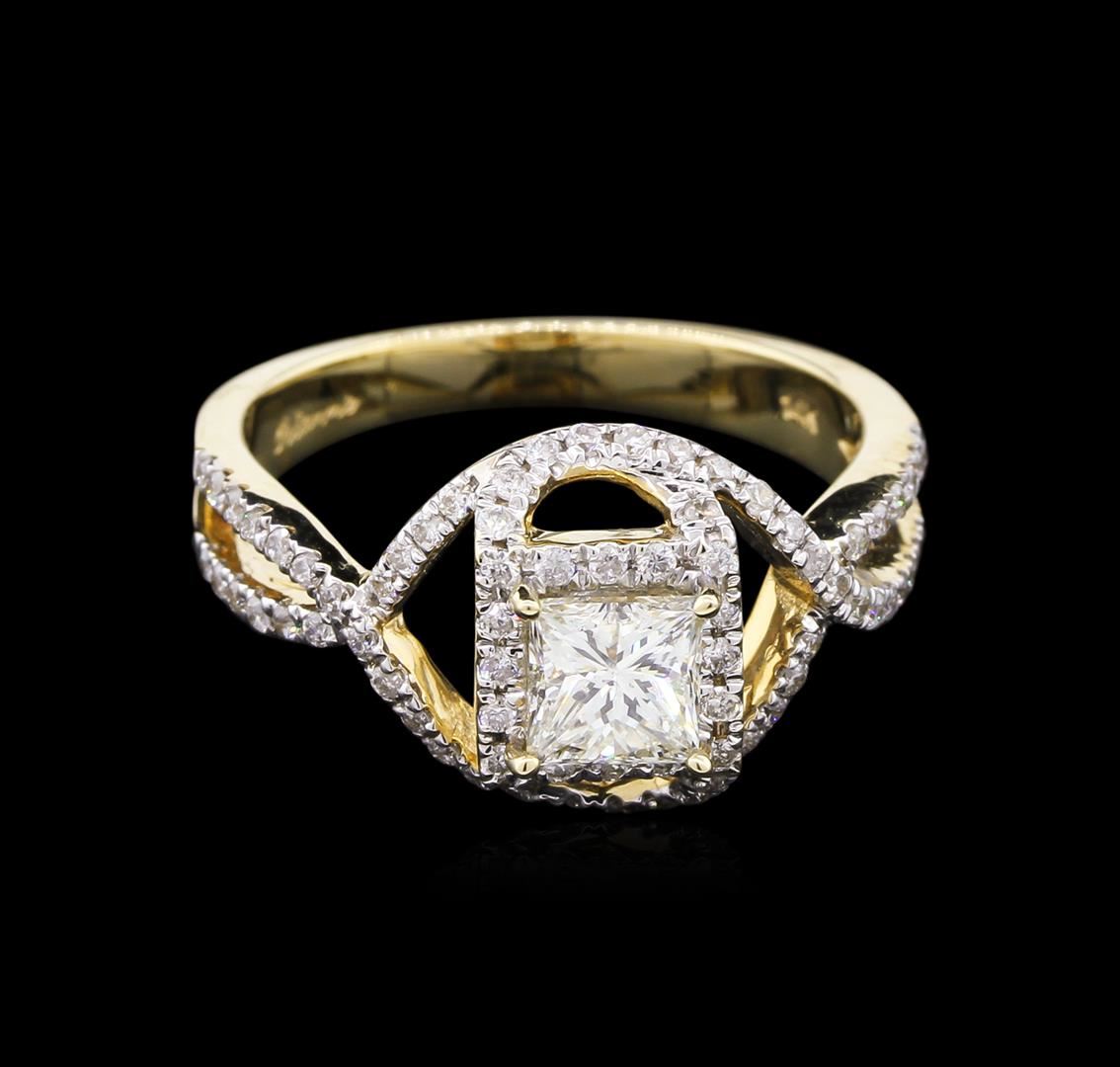 One electronically tested 14KT yellow gold ladies cast diamond unity ring. The featured diamond is set within a diamond bezel supported by intertwining diamond set shoulders, completed by a two and one-half millimeter wide band. Bright polish finish with rhodium accents. Trademark is Orianne. Identified with markings of "14K". Condition is new, good workmanship. Containing: One prong set Square Modified Brilliant cut diamond, measuring 4.90 x 4.79 x 3.83mm exact weight 0.76ct with a strong blue fluorescence. GIA Diamond Dossier Report attached. Graded loose prior to setting in the GIA Laboratory, Report #2151326002. Clarity: SI-2. Color: L. Depth 79.9%. Table 81.0%. Seventy-Four prong set round brilliant cut diamonds, measuring 1.20 - 1.10 x 0.69mm (depth est.) approximate total weight of 74 Stones = 0.41ct. Graded in the setting. Clarity: SI-1 to I-1. Color: H - J. Total Weight of Diamonds 1.17ct. AIG Appraised at $6,850.00.