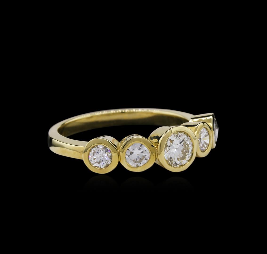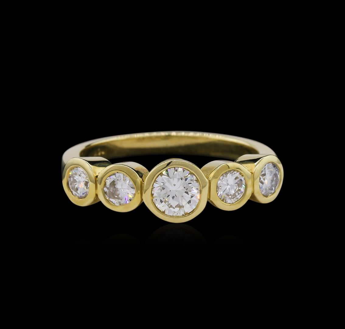 One electronically tested 14KT yellow gold lady's cast 5-stone ring with a straight line with a bright polish finish. The featured lady's ring has a shank measuring 2.41 millimeters wide. Identified with markings of "14K". Condition is new, good workmanship. Containing: One bezel set round brilliant cut diamond, measuring 5.50 - 5.40 x 2.96mm (depth est.) approximate weight of 0.57ct. Graded in the setting. Clarity: SI-1. Color: Very Good Four bezel set round brilliant cut diamonds, measuring 3.40 - 3.35 x 2.16mm (depth est.) approximate total weight of 4 Stones = 0.60ct. Graded in the setting. Clarity: SI-1 to SI-2. Color: H - I. Cut Good. Total Weight of Diamonds 1.17ct. Total Weight of Ring 4.70gm. GAS Appraised at $7,285.00.