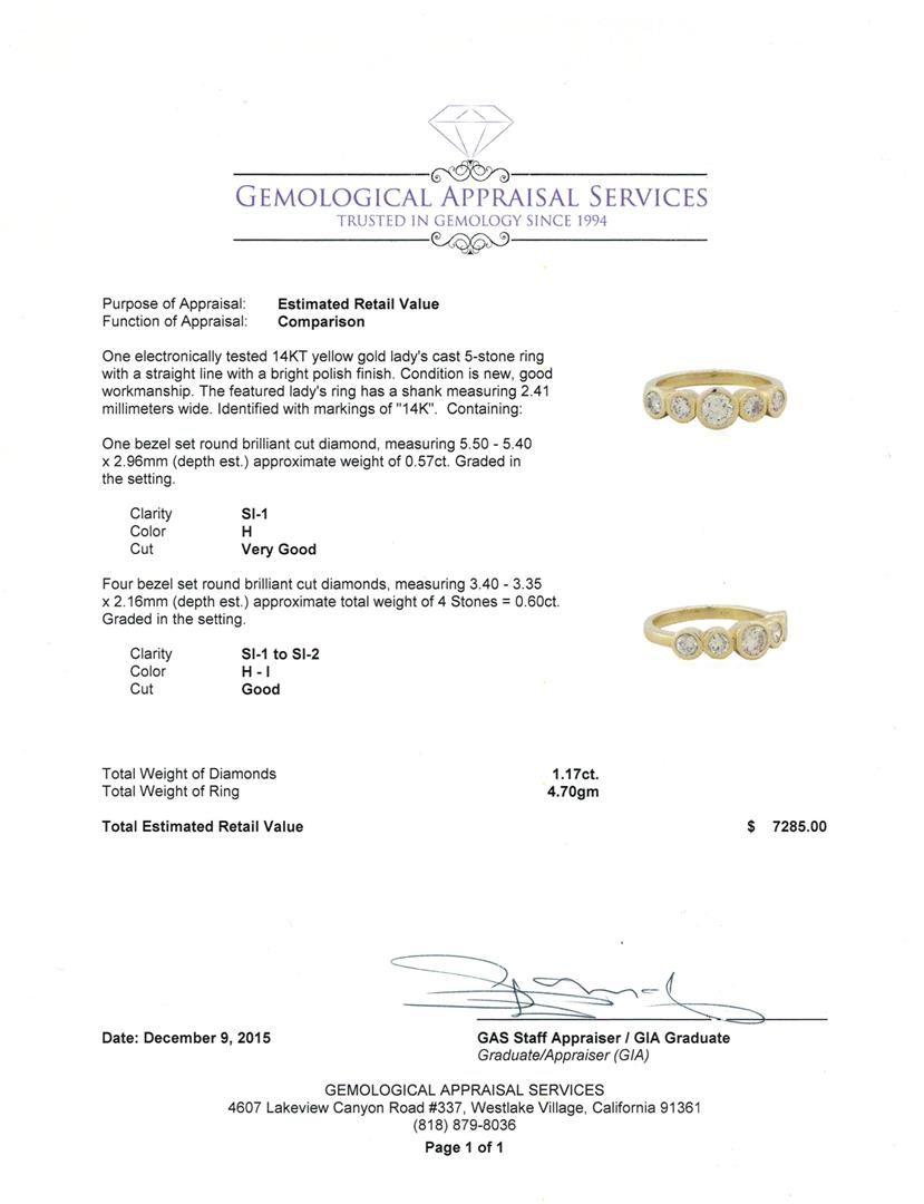 One electronically tested 14KT yellow gold lady's cast 5-stone ring with a straight line with a bright polish finish. The featured lady's ring has a shank measuring 2.41 millimeters wide. Identified with markings of "14K". Condition is new, good workmanship. Containing: One bezel set round brilliant cut diamond, measuring 5.50 - 5.40 x 2.96mm (depth est.) approximate weight of 0.57ct. Graded in the setting. Clarity: SI-1. Color: Very Good Four bezel set round brilliant cut diamonds, measuring 3.40 - 3.35 x 2.16mm (depth est.) approximate total weight of 4 Stones = 0.60ct. Graded in the setting. Clarity: SI-1 to SI-2. Color: H - I. Cut Good. Total Weight of Diamonds 1.17ct. Total Weight of Ring 4.70gm. GAS Appraised at $7,285.00.