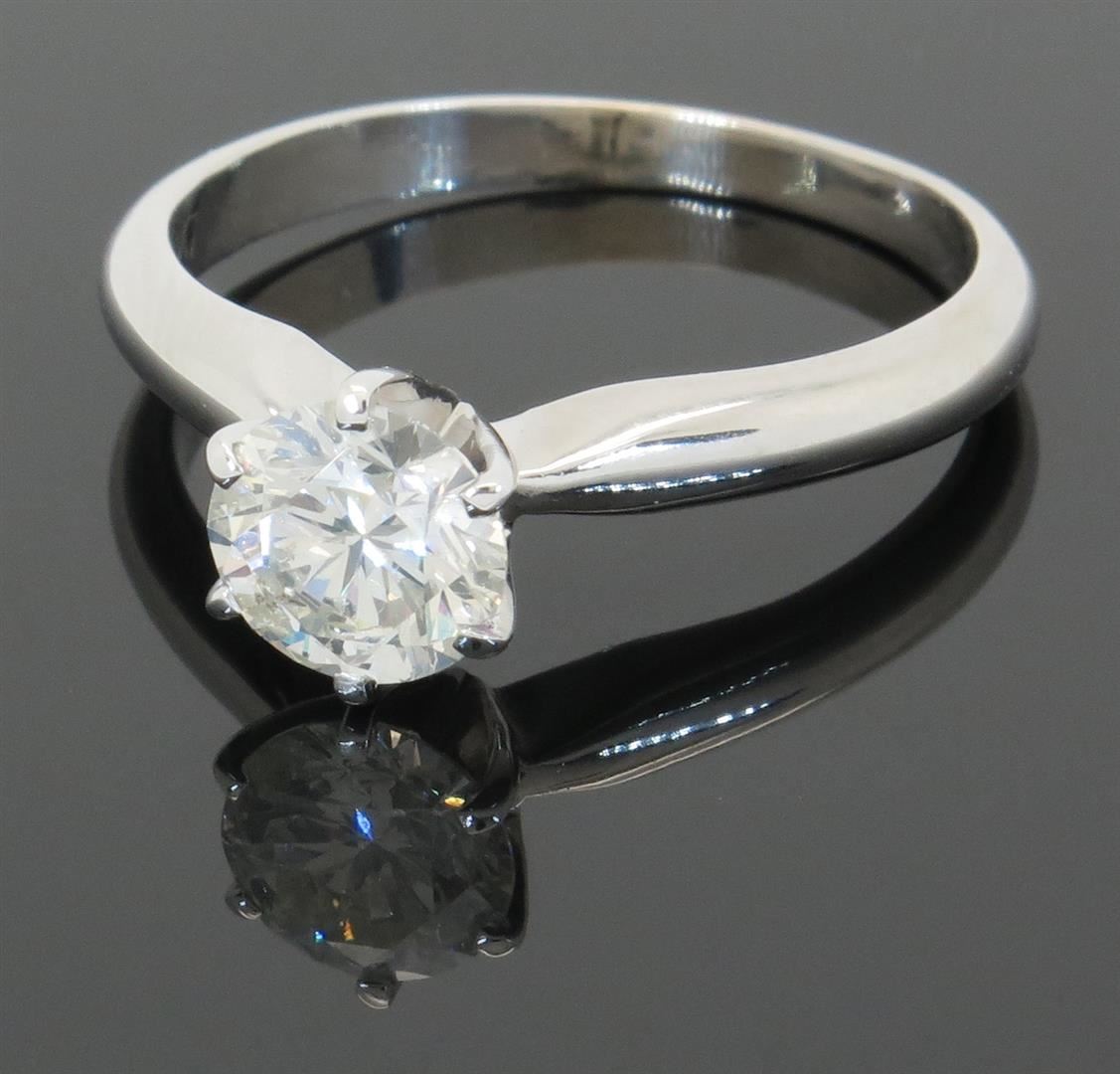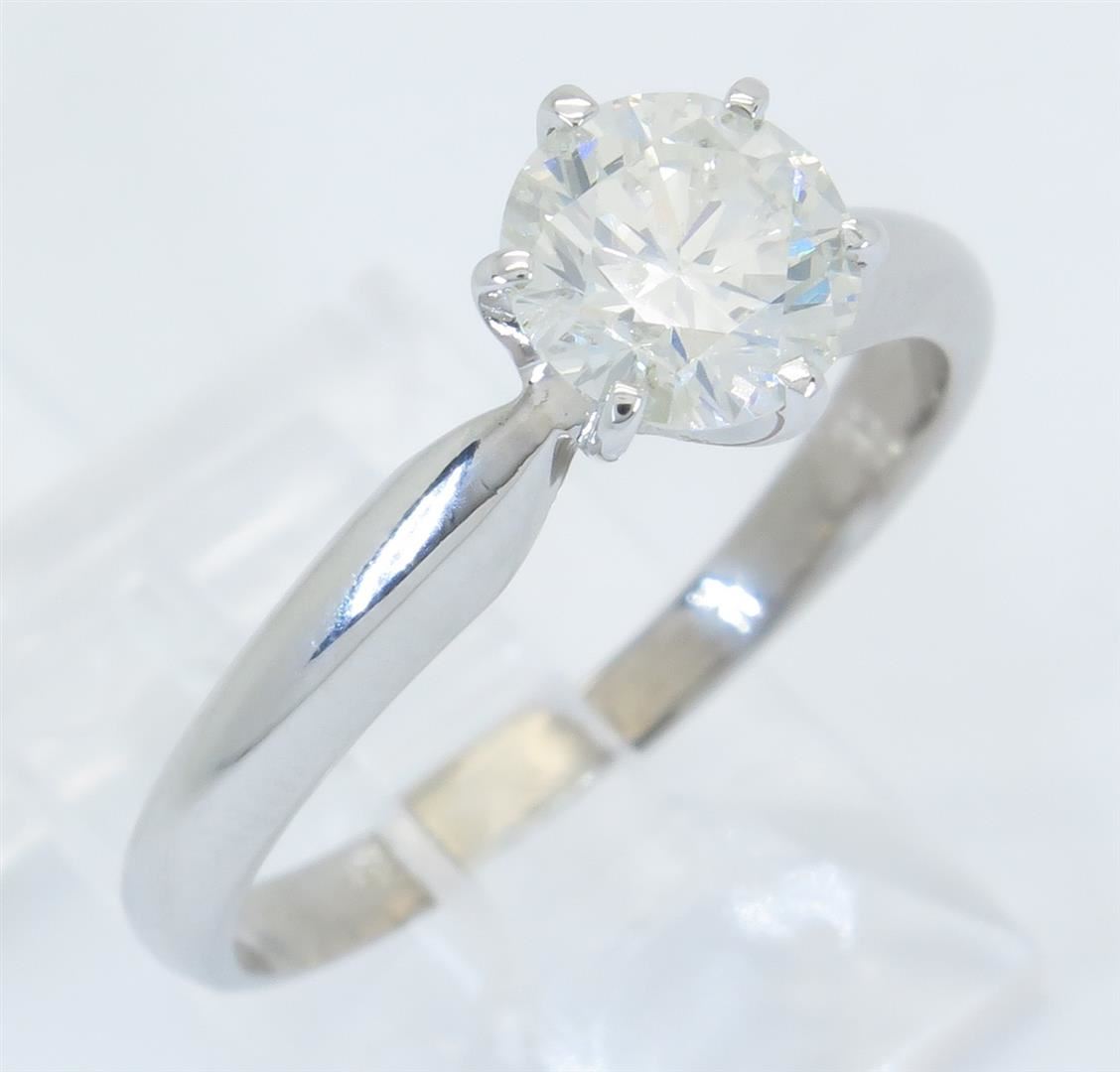 One tested 14K white gold certified diamond ring. Containing: One IGI Certified Round Brilliant Cut Diamond. Approximate size: 1.17CT, Clarity: I1-I2, Color: H-I. Diamonds are graded in the mounting, unless otherwise stated. Weight: 3.6 grams. Size: 8.5 IGI Appraised at $4,425.00.