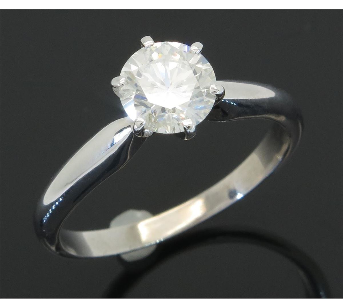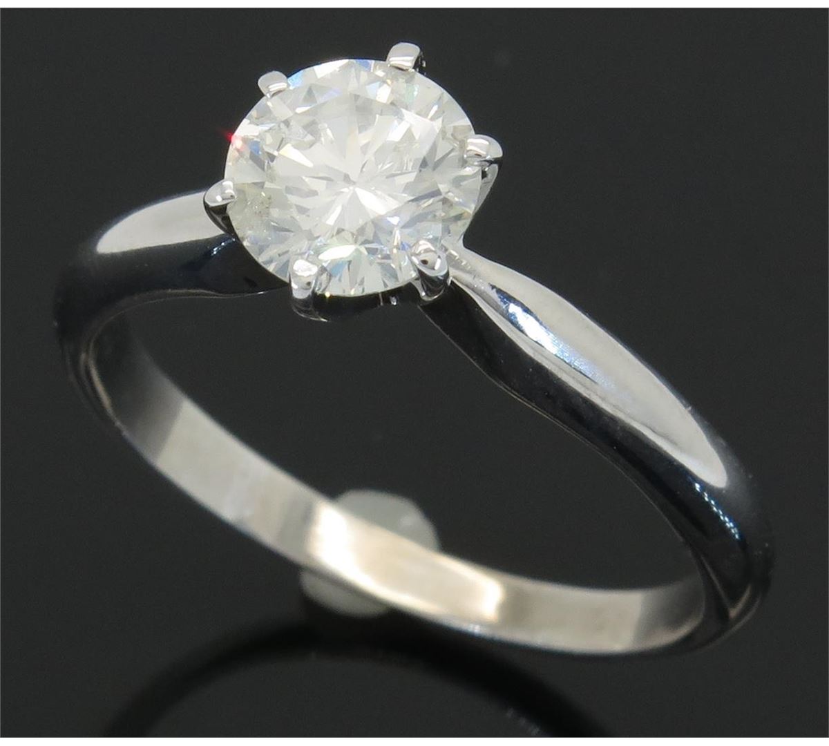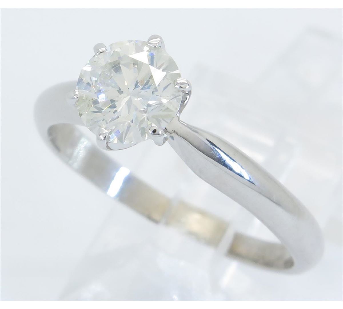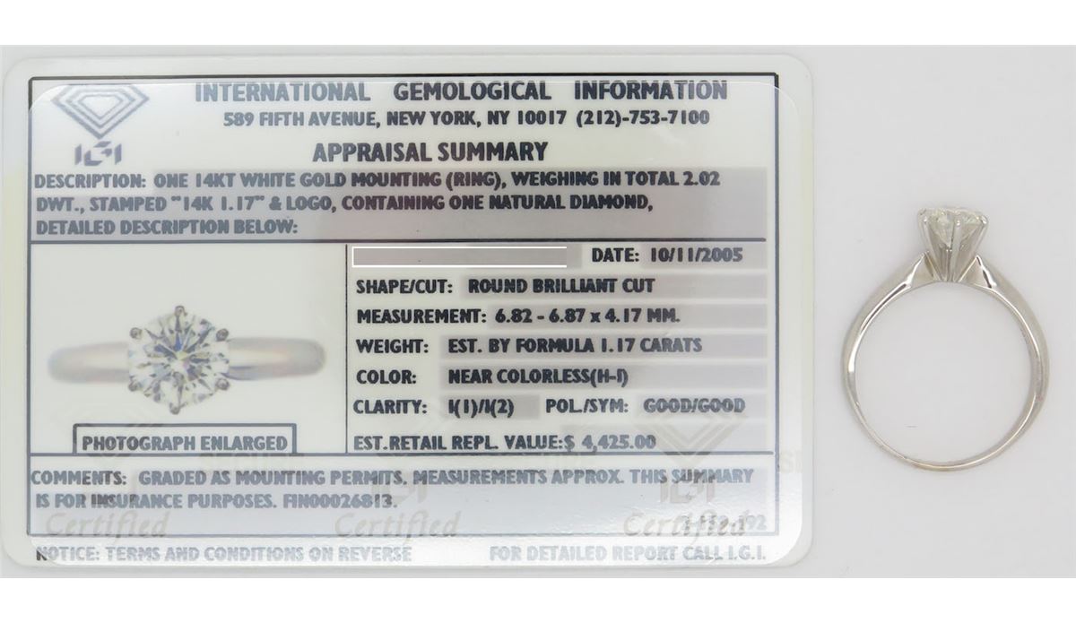 One tested 14K white gold certified diamond ring. Containing: One IGI Certified Round Brilliant Cut Diamond. Approximate size: 1.17CT, Clarity: I1-I2, Color: H-I. Diamonds are graded in the mounting, unless otherwise stated. Weight: 3.6 grams. Size: 8.5 IGI Appraised at $4,425.00.