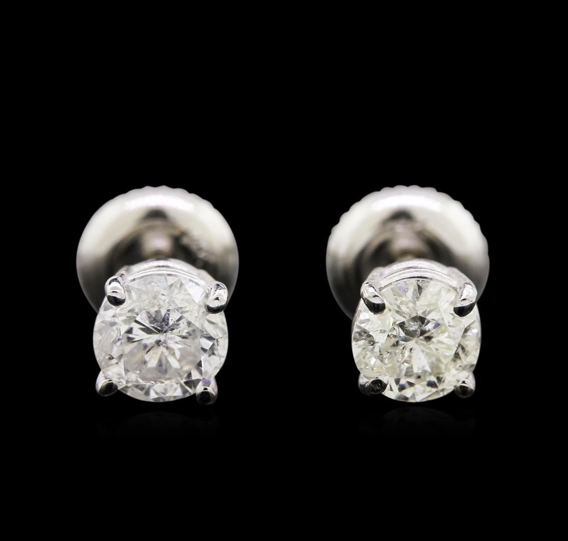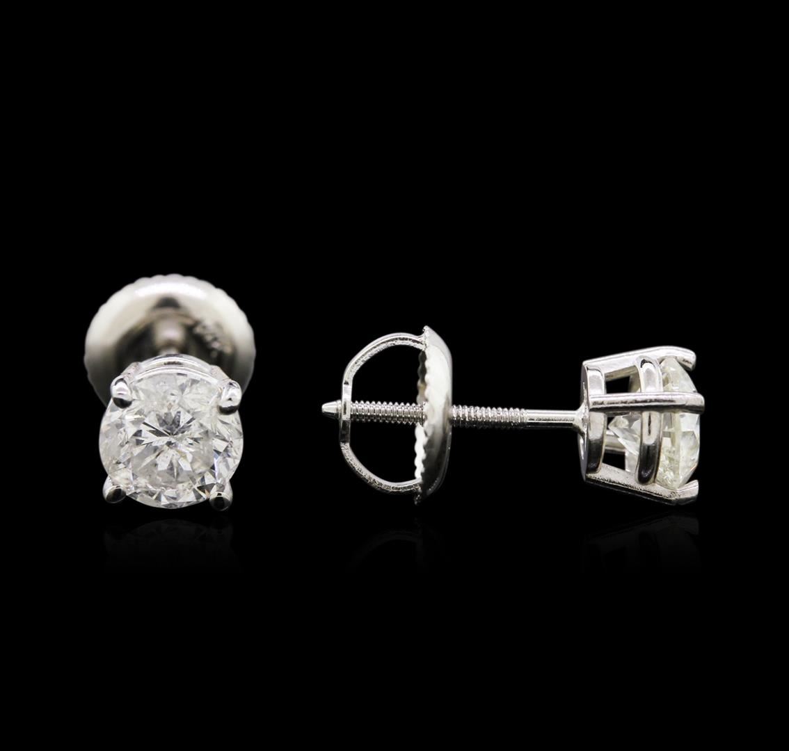 One pair electronically tested 14KT white gold lady's combination cast & assembled stud earrings with threaded posts and screw-on/screw-off backs with a basket setting with a bright polish finish. Identified with markings of "14K". Condition is new, good workmanship. Containing: Two prong set round brilliant cut diamonds, measuring 5.25 - 5.01 x 3.41mm (depth est.) , 5.00% GTCF approximate total weight of 2 Stones = 1.17ct. Graded in the setting. Clarity: I-1. Color: H - Good. Total Weight of Diamonds 1.17ct. Total Weight of Earrings 1.10gm. GAS Appraised at $5,520.00.