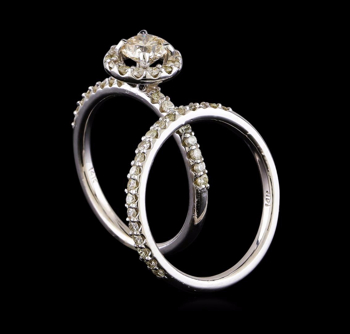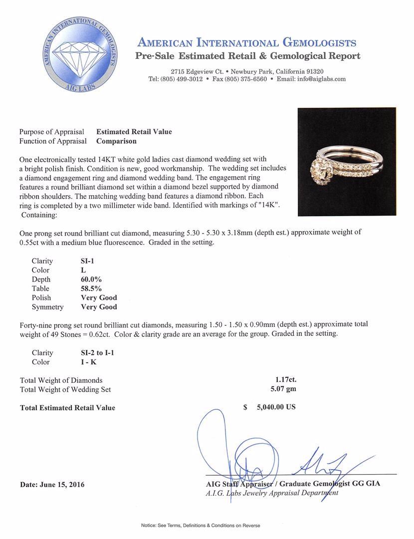 One electronically tested 14KT white gold ladies cast diamond wedding set with a bright polish finish. The wedding set includes a diamond engagement ring and diamond wedding band. The engagement ring features a round brilliant diamond set within a diamond bezel supported by diamond ribbon shoulders. The matching wedding band features a diamond ribbon. Each ring is completed by a two millimeter wide band. Identified with markings of "14K". Condition is new, good workmanship. Containing: One prong set round brilliant cut diamond, measuring 5.30 - 5.30 x 3.18mm (depth est.) approximate weight of 0.55ct with a medium blue fluorescence. Graded in the setting. Clarity: SI-1. Color: L. Depth 60.0%. Table 58.5%. Forty-Nine prong set round brilliant cut diamonds, measuring 1.50 - 1.50 x 0.90mm (depth est.) approximate total weight of 49 Stones = 0.62ct. Color & clarity grade are an average for the group. Graded in the setting. Clarity: SI-2 to I-1. Color: I - K. Total Weight of Diamonds 1.17ct. Total Weight of Wedding Set 5.07gm. AIG Appraised at $5,040.00.