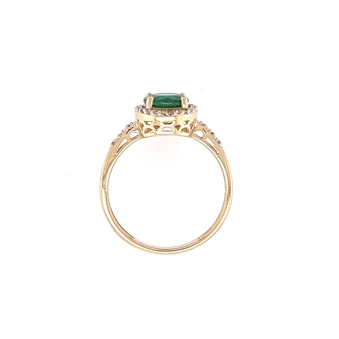 One electronically tested 14KT yellow gold lady's cast fashion halo ring with a cathedral shank with a bright polish finish. Condition is new, good workmanship. The featured lady's ring has a shank measuring 2.00 millimeters wide. Identified with markings of "14K". Containing: One prong set round modified mixed cut natural emerald, measuring 6.95 - 6.85 x 4.50 mm, (depth est.) approximate weight of 1.17ct., clarity is moderately included, medium, moderately strong, green color, (GIA G 5/4), cut is good. Transmitting light somewhat diffusely, transparent to translucent. Naturally occurring internal & external characteristics are present. Indications of oil residue. Colored gemstones are presumed to have been subjected to commonly used enhancement processes. Graded in the setting. Thirty prong set single cut diamonds, measuring 1.15 - 1.10 x 0.68mm (depth est.) approximate total weight of 30 Stones = 0.15ct. Graded in the setting. Color I - J Clarity VS-2 to SI-1 Cut Good Total Weight of Colored Stones Total Weight of Diamonds Total Weight of Ring 1.17ct. 0.15ct. 2.70gm Appraisal No: 000022197006 Total Estimated Retail Value $ 2940.00