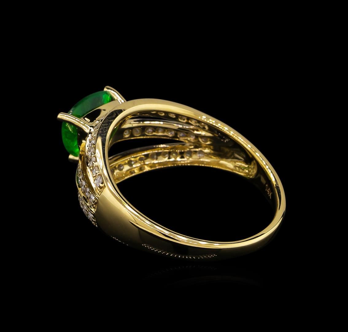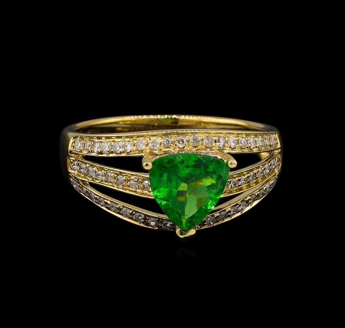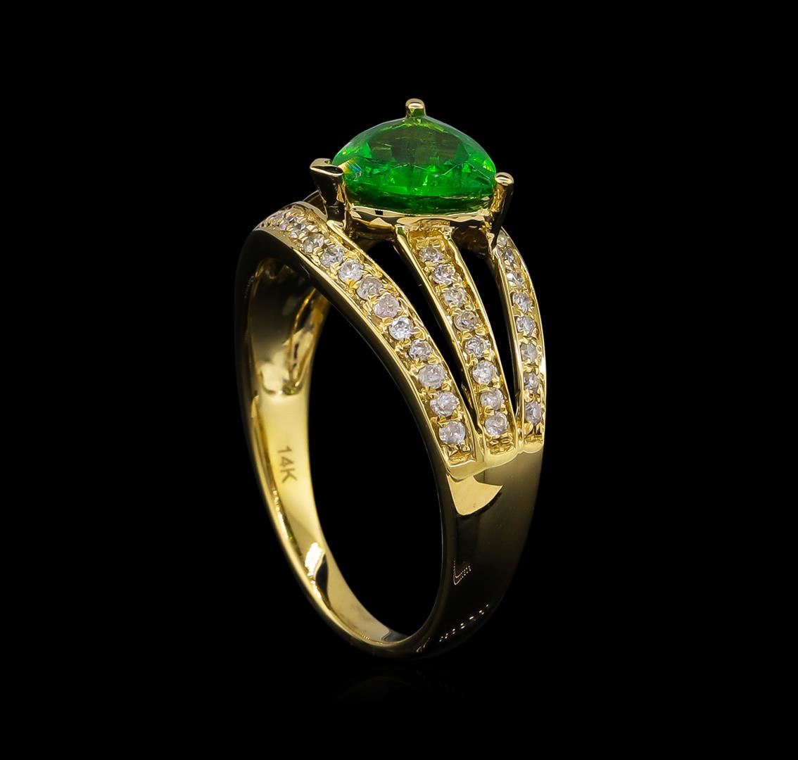 One electronically tested 14KT yellow gold lady's cast fashion ring with a three row wide band with a bright polish finish. The featured lady's ring has a shank measuring 2.18 millimeters wide. Trademark is Orianne. Identified with markings of "14K". Condition is new, good workmanship. Containing: One prong set triangle modified brilliant cut natural tsavorite garnet, measuring 7.48 x 7.43 x 3.33mm, approximate weight of 1.17ct., clarity is moderately included, type II, medium dark, moderately strong, slightly yellowish green color, (GIA slyG 6/4), cut is good. Transmitting light somewhat diffusely, transparent to translucent. Colored gemstones are presumed to have been subjected to commonly used enhancement processes. Graded in the setting. Fifty-Four bead set round brilliant cut diamonds, measuring 1.20 - 1.10 x 0.69mm (depth est.) approximate total weight of 54 Stones = 0.29ct. Graded in the setting. Clarity: I-1 to I-2. Color: G - I. Cut Good. Total Weight of Colored Stones 1.17ct. Total Weight of Diamonds 0.29ct. Total Weight of Ring 3.20gm. GAS Appraised at $3,810.00.