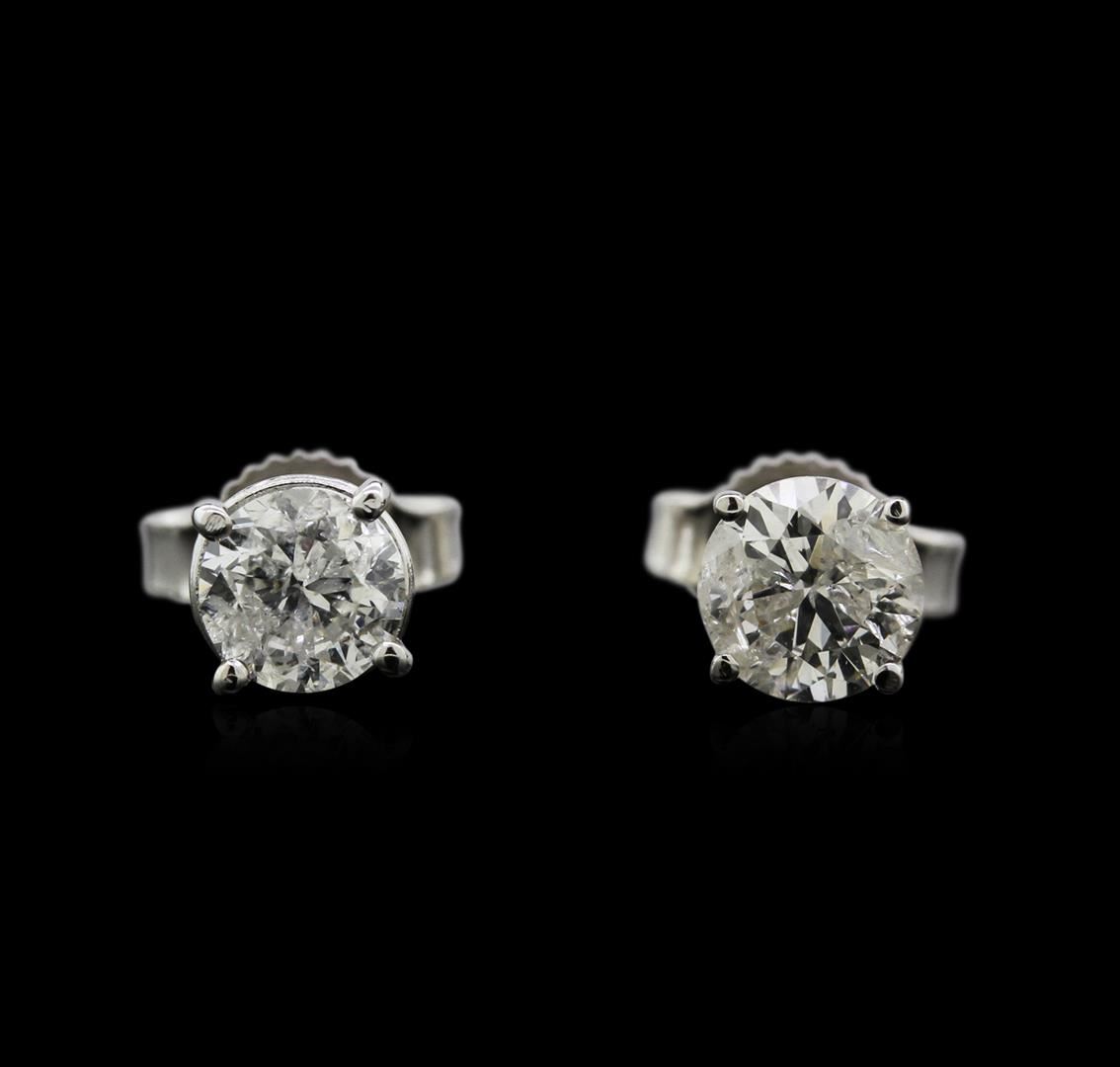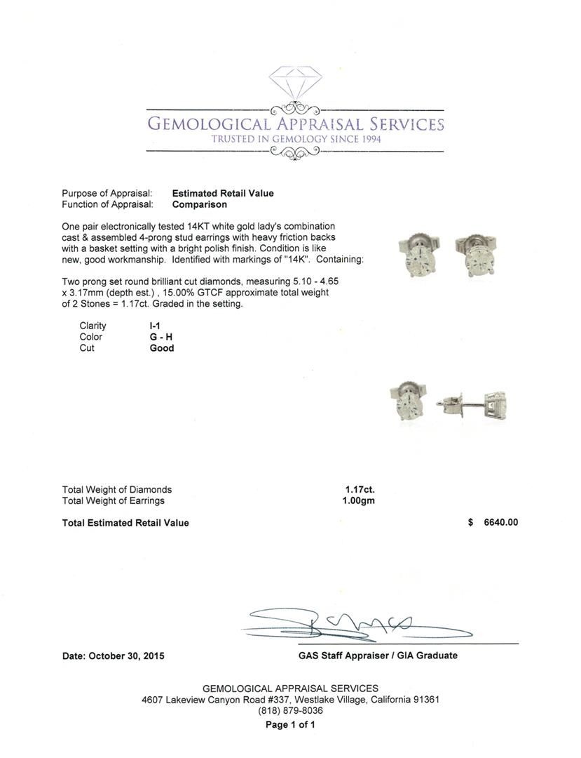 One pair electronically tested 14KT white gold lady's combination cast & assembled 4-prong stud earrings with heavy friction backs with a basket setting with a bright polish finish. Identified with markings of "14K". Condition is like new, good workmanship. Containing: Two prong set round brilliant cut diamonds, measuring 5.10 - 4.65 x 3.17mm (depth est.) , 15.00% GTCF approximate total weight of 2 Stones = 1.17ct. Graded in the setting. Clarity: I-1. Color: G - Good. Total Weight of Diamonds 1.17ct. Total Weight of Earrings 1.00gm. GAS Appraised.