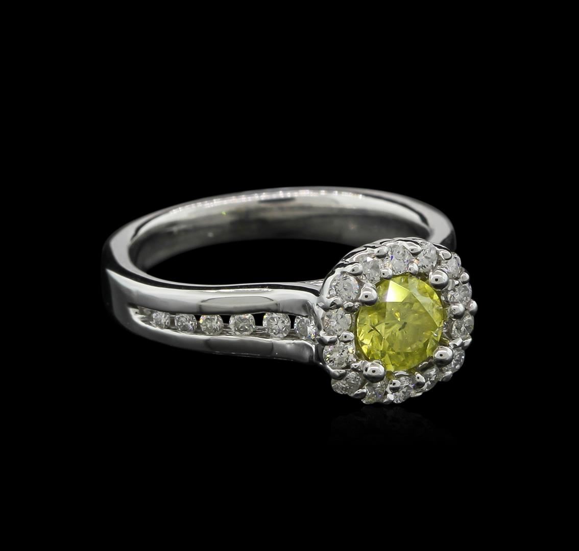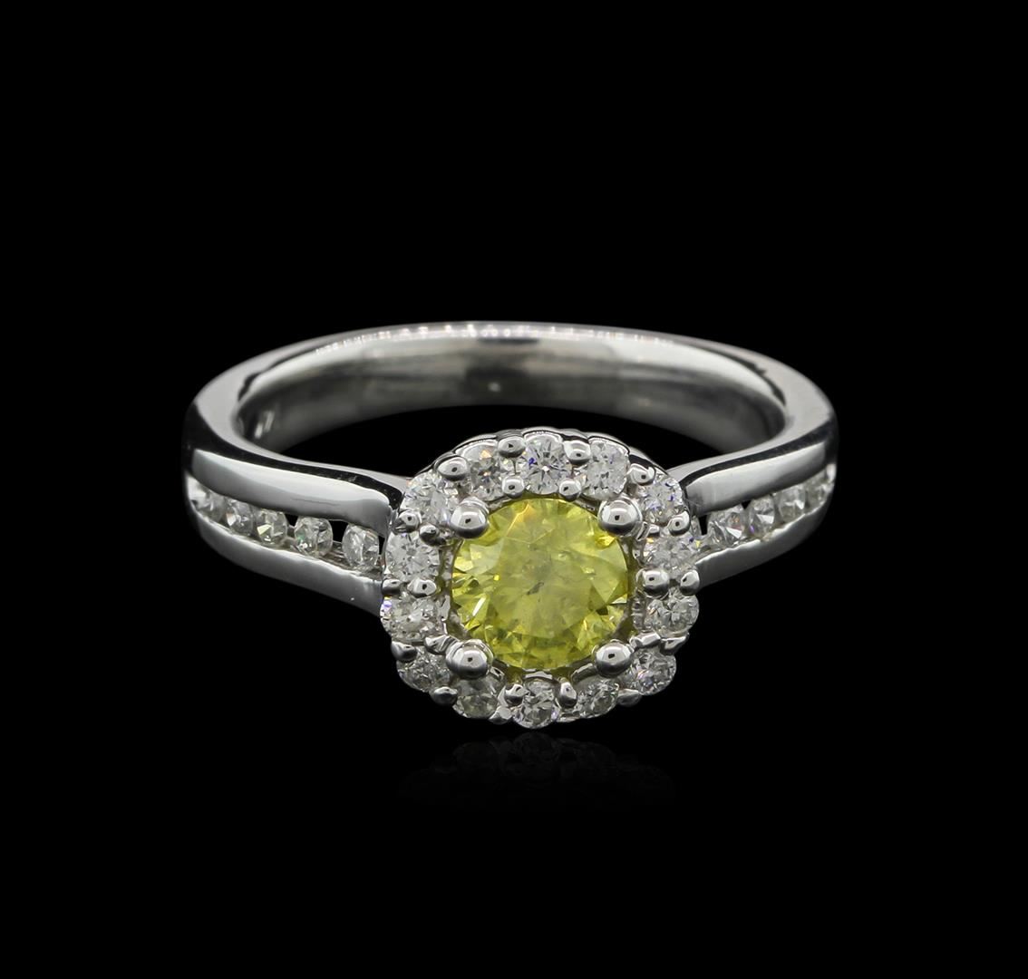 One electronically tested 14KT white gold ladies cast diamond ring with a bright polish finish. The featured diamond is set within a diamond bezel supported by diamond set shoulders, completed by a two and one-half millimeter wide band. Identified with markings of "14K". Condition is new, good workmanship. Containing: One prong set round brilliant cut diamond, measuring 5.40 - 5.30 x 3.21mm approximate weight of 0.56ct with a strong yellow fluorescence. Indications of laboratory irradiated enhanced color. Graded in the setting. Clarity I-2 Depth 60.0%. Table 57.9%. Thirty prong & channel set round brilliant cut diamonds approximate total weight of 30 Stones = 0.61ct. Graded in the setting. Clarity I-1 to I-2 Color G - I. Total Weight of Diamonds 1.17ct. Total Weight of Ring 4.38 grams. AIG Appraised at $3,275.00.