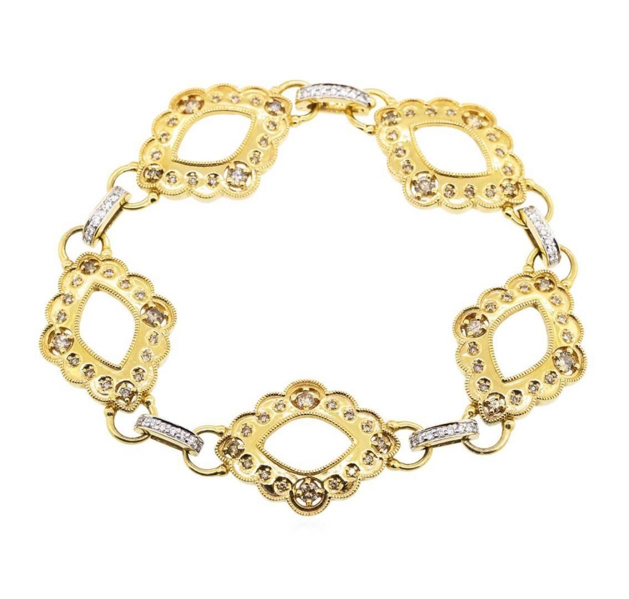 One electronically tested 18KT yellow gold lady's combination cast & assembled fashion bracelet with a foldover clasp with a bright polish with milgrain detailing finish. The featured lady's bracelet measures approximately eight inches in length. Trademark is Badgley Mischka. Identified with markings of '18K'. Condition is new, good workmanship. Containing: Ten prong set round brilliant cut diamonds, measuring 2.90 - 2.80 x 1.77mm (depth est.) approximate total weight of 10 Stones = 0.88ct. Graded in the setting. Color Fancy Light Brown Clarity VS-2 to SI-2 Cut Good Ten prong set round brilliant cut diamonds, measuring 2.00 - 1.95 x 1.23mm (depth est.) approximate total weight of 10 Stones = 0.30ct. Graded in the setting. Color Fancy Brown Clarity VS-2 to SI-2 Cut Very Good Sixty prong set round brilliant cut diamonds, measuring 1.50 - 1.40 x 0.90mm (depth est.) approximate total weight of 60 Stones = 0.70ct. Graded in the setting. Color Fancy Brown Clarity VS-2 to SI-2 Cut Good Forty bead set round brilliant cut diamonds, measuring 1.50 - 1.45 x 0.92mm (depth est.) approximate total weight of 40 Stones = 0.50ct. Graded in the setting. Color H - I Clarity VS-2 to SI-2 Cut Very Good. Total Weight of Diamonds 2.38ct.. Total Weight of Bracelet 37.70gm GAS Appraised at $7000.00. GAS Appraised.