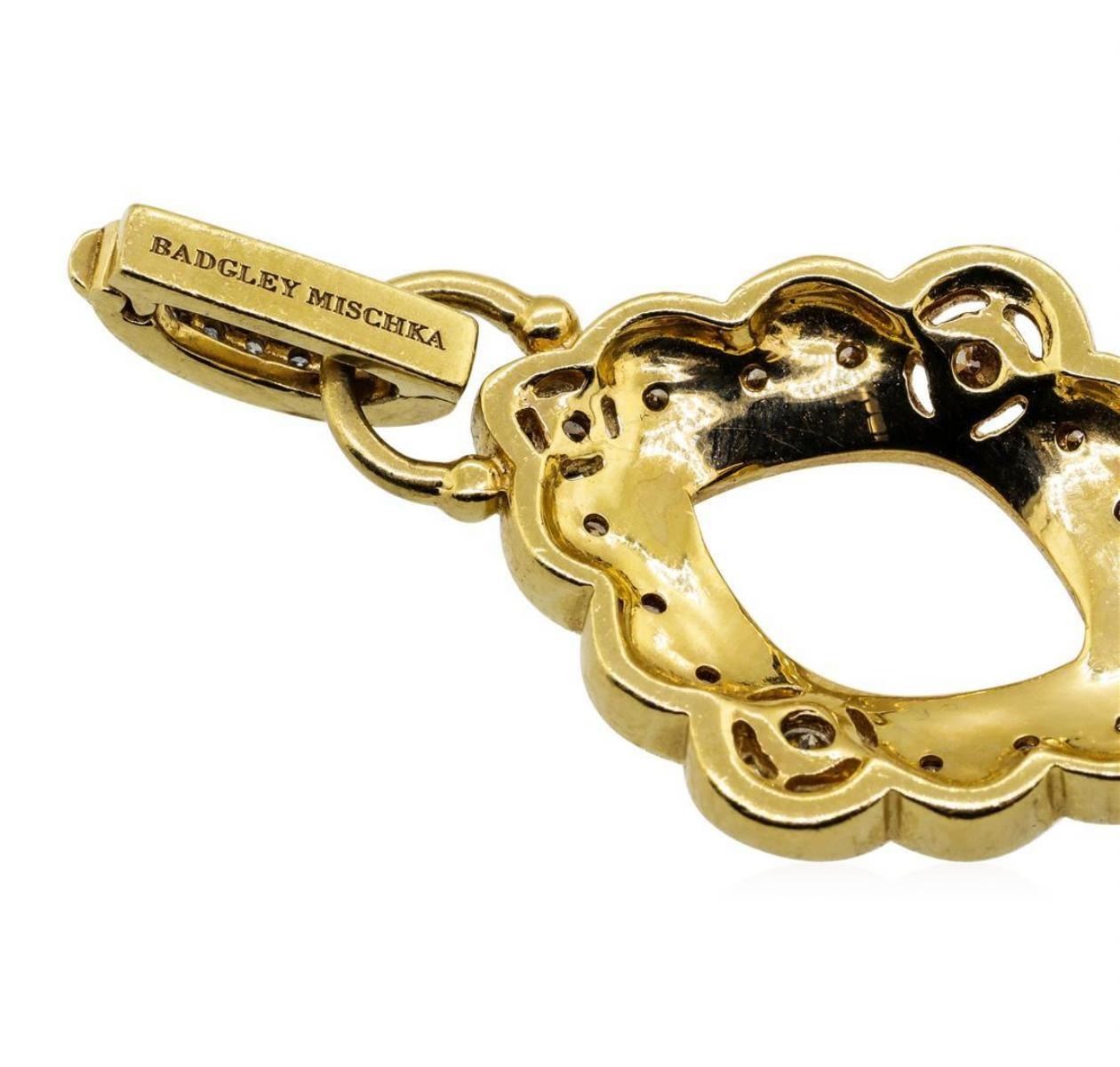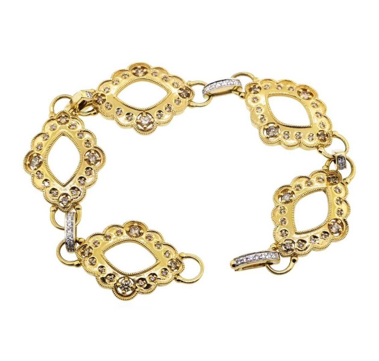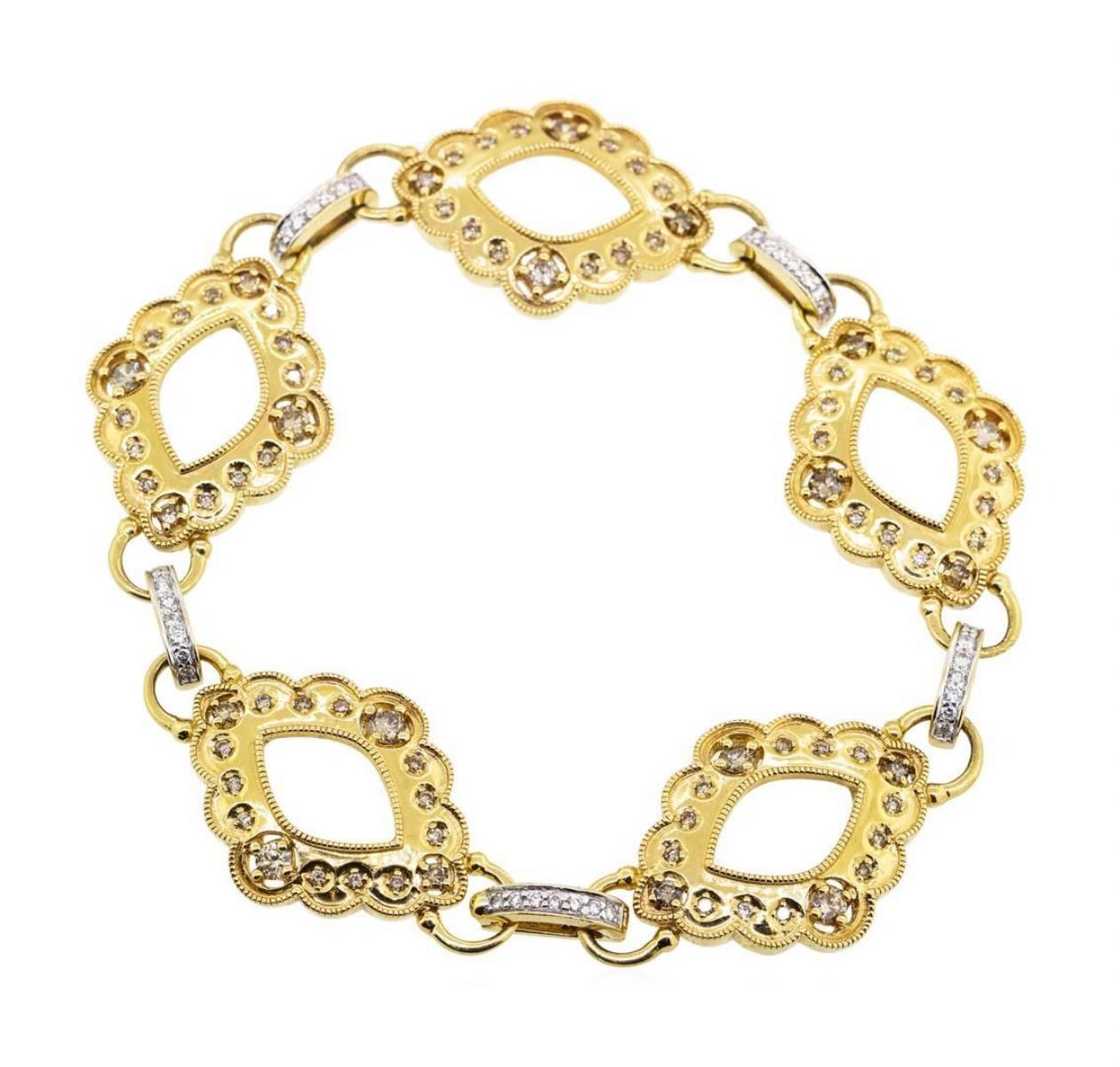 One electronically tested 18KT yellow gold lady's combination cast & assembled fashion bracelet with a foldover clasp with a bright polish with milgrain detailing finish. The featured lady's bracelet measures approximately eight inches in length. Trademark is Badgley Mischka. Identified with markings of '18K'. Condition is new, good workmanship. Containing: Ten prong set round brilliant cut diamonds, measuring 2.90 - 2.80 x 1.77mm (depth est.) approximate total weight of 10 Stones = 0.88ct. Graded in the setting. Color Fancy Light Brown Clarity VS-2 to SI-2 Cut Good Ten prong set round brilliant cut diamonds, measuring 2.00 - 1.95 x 1.23mm (depth est.) approximate total weight of 10 Stones = 0.30ct. Graded in the setting. Color Fancy Brown Clarity VS-2 to SI-2 Cut Very Good Sixty prong set round brilliant cut diamonds, measuring 1.50 - 1.40 x 0.90mm (depth est.) approximate total weight of 60 Stones = 0.70ct. Graded in the setting. Color Fancy Brown Clarity VS-2 to SI-2 Cut Good Forty bead set round brilliant cut diamonds, measuring 1.50 - 1.45 x 0.92mm (depth est.) approximate total weight of 40 Stones = 0.50ct. Graded in the setting. Color H - I Clarity VS-2 to SI-2 Cut Very Good. Total Weight of Diamonds 2.38ct.. Total Weight of Bracelet 37.70gm GAS Appraised at $7000.00. GAS Appraised.