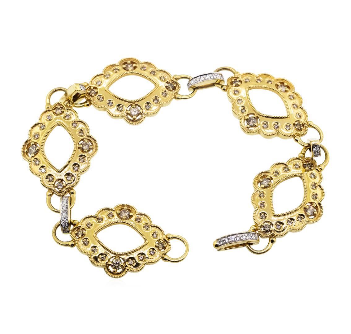 One electronically tested 18KT yellow gold lady's combination cast & assembled fashion bracelet with a foldover clasp with a bright polish with milgrain detailing finish. The featured lady's bracelet measures approximately eight inches in length. Trademark is Badgley Mischka. Identified with markings of '18K'. Condition is new, good workmanship. Containing: Ten prong set round brilliant cut diamonds, measuring 2.90 - 2.80 x 1.77mm (depth est.) approximate total weight of 10 Stones = 0.88ct. Graded in the setting. Color Fancy Light Brown Clarity VS-2 to SI-2 Cut Good Ten prong set round brilliant cut diamonds, measuring 2.00 - 1.95 x 1.23mm (depth est.) approximate total weight of 10 Stones = 0.30 ct. Graded in the setting. Color Fancy Brown Clarity VS-2 to SI-2 Cut Very Good Sixty prong set round brilliant cut diamonds, measuring 1.50 - 1.40 x 0.90mm (depth est.) approximate total weight of 60 Stones = 0.70 ct. Graded in the setting. Color Fancy Brown Clarity VS-2 to SI-2 Cut Good Forty bead set round brilliant cut diamonds, measuring 1.50 - 1.45 x 0.92mm (depth est.) approximate total weight of 40 Stones = 0.50 ct. Graded in the setting. Color H - I Clarity VS-2 to SI-2 Cut Very Good. Total Weight of Diamonds 2.38ct.. Total Weight of Bracelet 37.70gm GAS Appraised at $7000.00. GAS Appraised.
