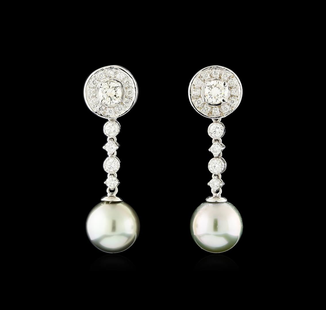 One pair electronically tested 14KT white gold lady's combination cast & assembled dangle earrings with friction posts with a bright polish finish. The featured lady's dangle earrings have a drop of 25 millimeters. Identified with markings of "14K". Condition is new, good workmanship. Containing: Two Tahitian pearls, 10.7mm in size to 10.2mm in size. The pearls are black in color, green overtone with a good luster, round, and clean with excellent matching. Graded in the setting. Two prong set round brilliant cut diamonds, measuring 4.33 - 4.19 x 2.64mm (depth est.) approximate total weight of 2 Stones = 0.58ct. Graded in the setting. Clarity: SI-1 to SI-2. Color: H - I. Cut Good Eight prong set round brilliant cut diamonds, measuring 2.50 - 2.10 x 1.45mm (depth est.) approximate total weight of 8 Stones = 0.38ct. Graded in the setting. Clarity: SI-1 to SI-2. Color: G - Good Twenty-Four prong set round brilliant cut diamonds, measuring 1.40 - 1.30 x 0.84mm (depth est.) approximate total weight of 24 Stones = 0.22ct. Graded in the setting. Clarity: SI-1 to SI-2. Color: G - Good. Total Weight of Diamonds 1.18ct. Total Weight of Earrings 8.50gm. GAS Appraised at $6,300.00.