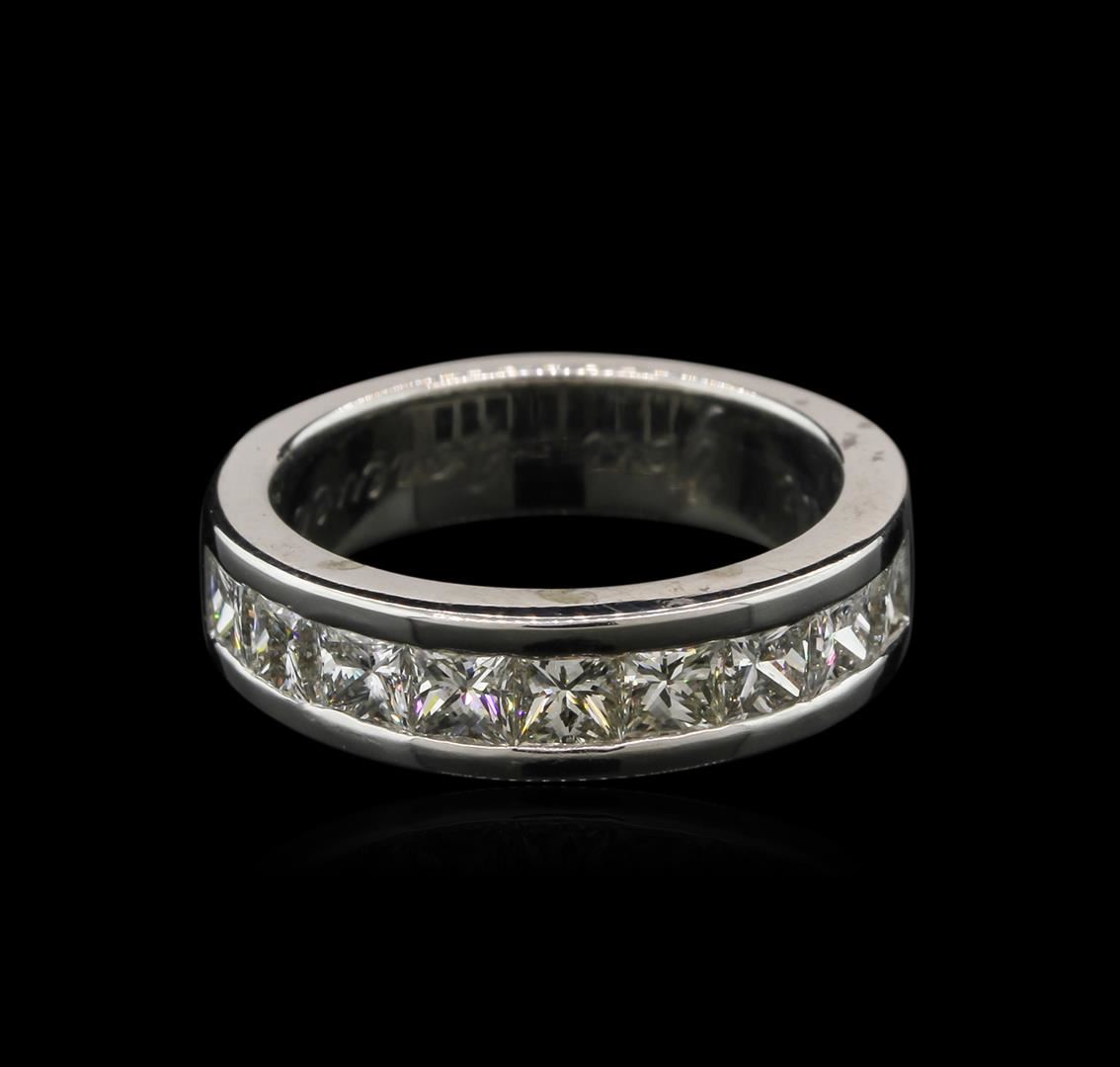 One electronically tested 14KT white gold ladies cast diamond wedding band with a bright polish finish. Identified with markings of "14K". Condition is very good. Containing: Nine channel set princess cut diamonds, measuring 3.20 x 3.20 x 2.40mm (depth est.) approximate total weight of 9 Stones = 1.18ct. Clarity: VS-2. Color: I - J, Cut is Very Good. Diamonds are graded in the mounting, unless otherwise stated. Total Weight of Diamonds 1.18ct. Total Weight of Wedding Band 5.00 grams. GGL Appraised at $3,620.00.