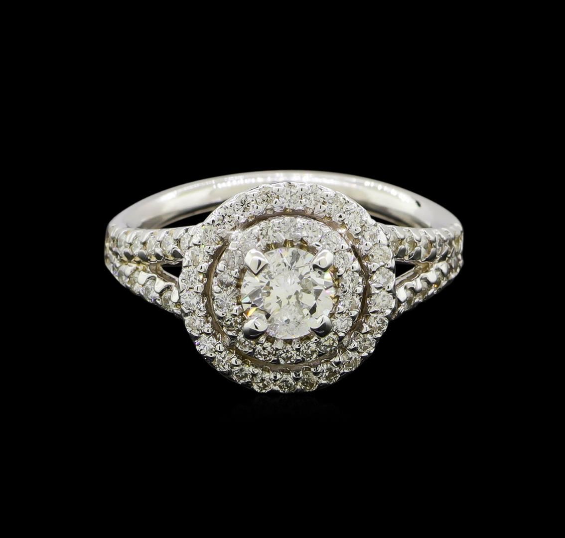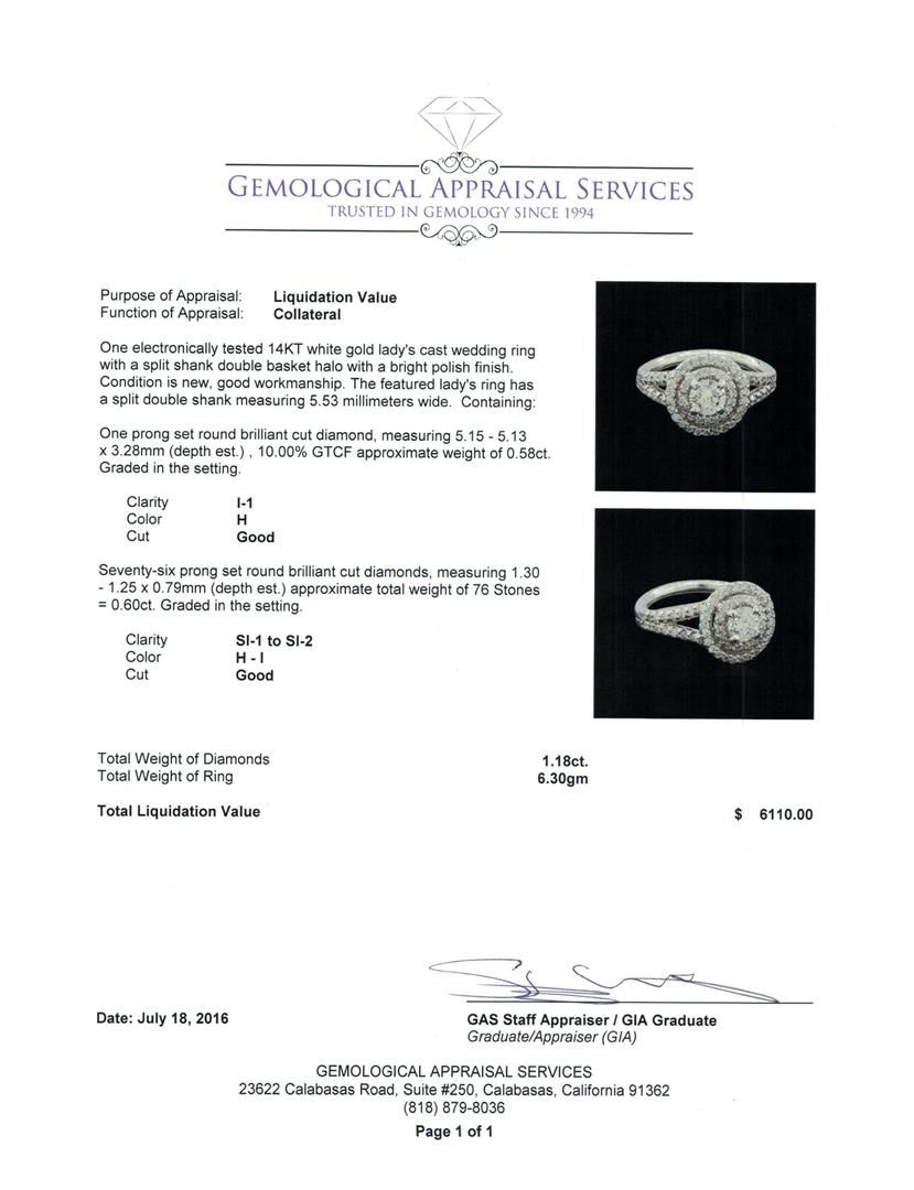 One electronically tested 14KT white gold lady's cast wedding ring with a split shank double basket halo with a bright polish finish. The featured lady's ring has a split double shank measuring 5.53 millimeters wide. Condition is new, good workmanship. Containing: One prong set round brilliant cut diamond, measuring 5.15 - 5.13 x 3.28mm (depth est.) , 10.00.%. GTCF approximate weight of 0.58ct. Graded in the setting. Clarity I-1. Color: H Cut Good Seventy-Six prong set round brilliant cut diamonds, measuring 1.30 - 1.25 x 0.79mm (depth est.) approximate total weight of 76 Stones = 0.60ct. Graded in the setting. Clarity SI-1 to SI-2. Color: H - I Cut Good. Total Weight of Diamonds 1.18ct.. Total Weight of Ring 6.30gm Liquidation Value $6110.00.. GAS Appraised at $5,465.00.