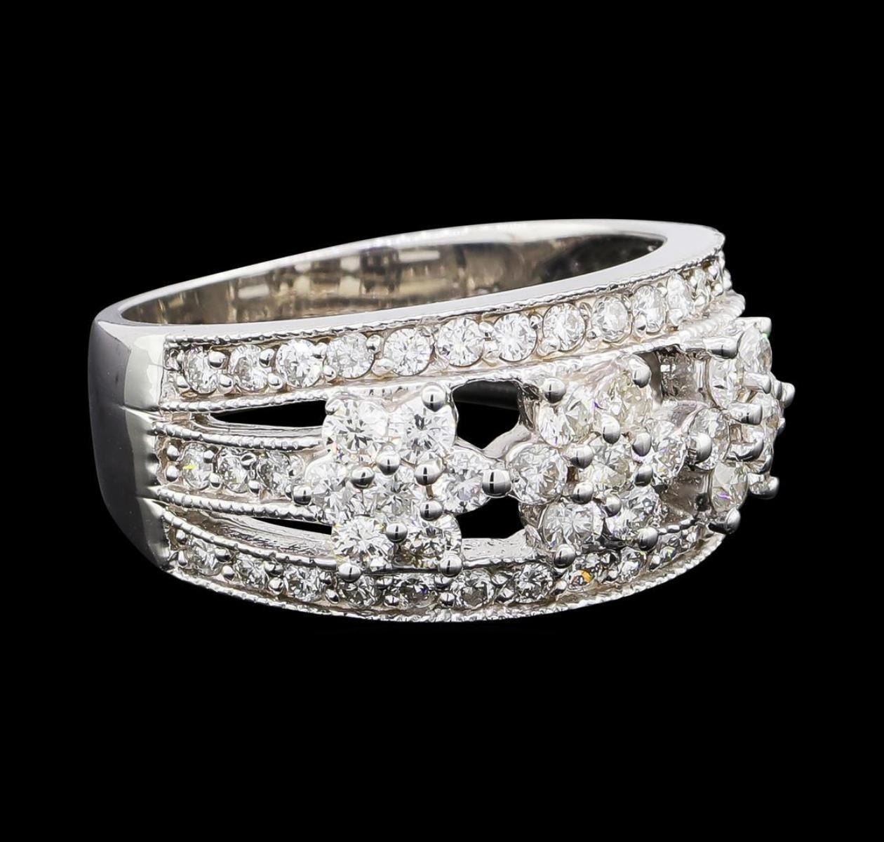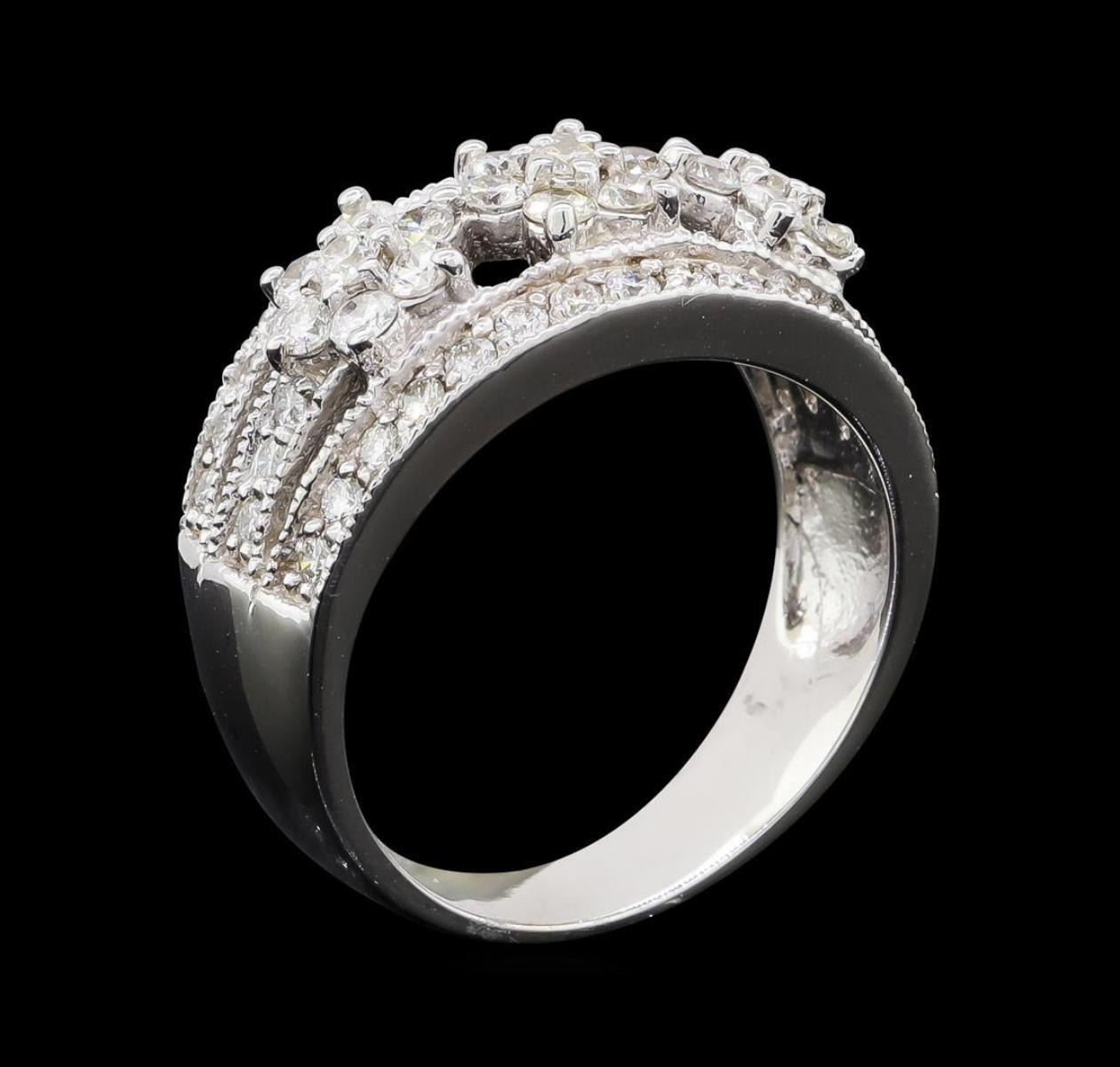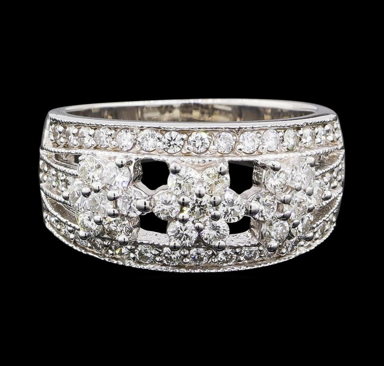 One electronically tested 14KT white gold lady's cast fashion ring with a three row tapered shank with a bright polish with milgrain detailing finish. The featured lady's ring has a shank measuring 4.25 millimeters wide. Identified with markings of '14K'. Condition is new, good workmanship. Containing: Twenty-One prong set round brilliant cut diamonds, measuring 2.10 - 2.05 x 1.27mm (depth est.) approximate total weight of 21 Stones = 0.70ct. Graded in the setting. Clarity SI-1 to I-1. Color: G - H Cut Good Thirty-Six prong set round brilliant cut diamonds, measuring 1.60 - 1.50 x 0.93mm (depth est.) approximate total weight of 36 Stones = 0.48ct. Graded in the setting. Clarity SI-1 to I-1. Color: H - I Cut Good. Total Weight of Diamonds 1.18ct.. Total Weight of Ring 6.30gm. GAS Appraised.