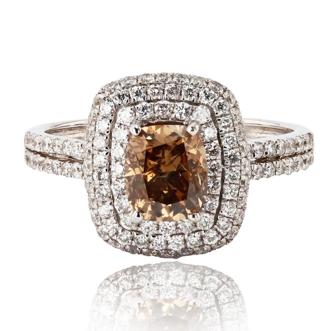 One electronically tested 18KT white gold ladies cast diamond ring with a bright polish finish. Condition is new, good workmanship. The featured diamond is set within tiered diamond bezels supported by a diamond set lattice under gallery and diamond set split shoulders, completed by a two millimeter wide band. Trademark is Orianne. Identified with markings of "18K". Containing: One prong set cushion cut diamond, measuring 6.40mm x 5.42mm x 3.70mm (depth est.), 6.00% GTCF approximate weight of 1.18ct with a faint yellow fluorescence. Graded in the setting. Clarity I1 Color Fancy Brown Depth 68.3% Table 59.6% Polish Very Good Symmetry Good One hundred twenty-four prong set round brilliant cut diamonds, measuring 1.20mm to 1.20mm x 0.78mm (depth est.), 5.00% GTCF approximate total weight of 124 Stones = 0.93ct. Graded in the setting. Clarity SI2 to I2 Color G - 1 Total Weight of Diamonds 2.11ct. Total Weight of Ring 4.17 gm Size: 7