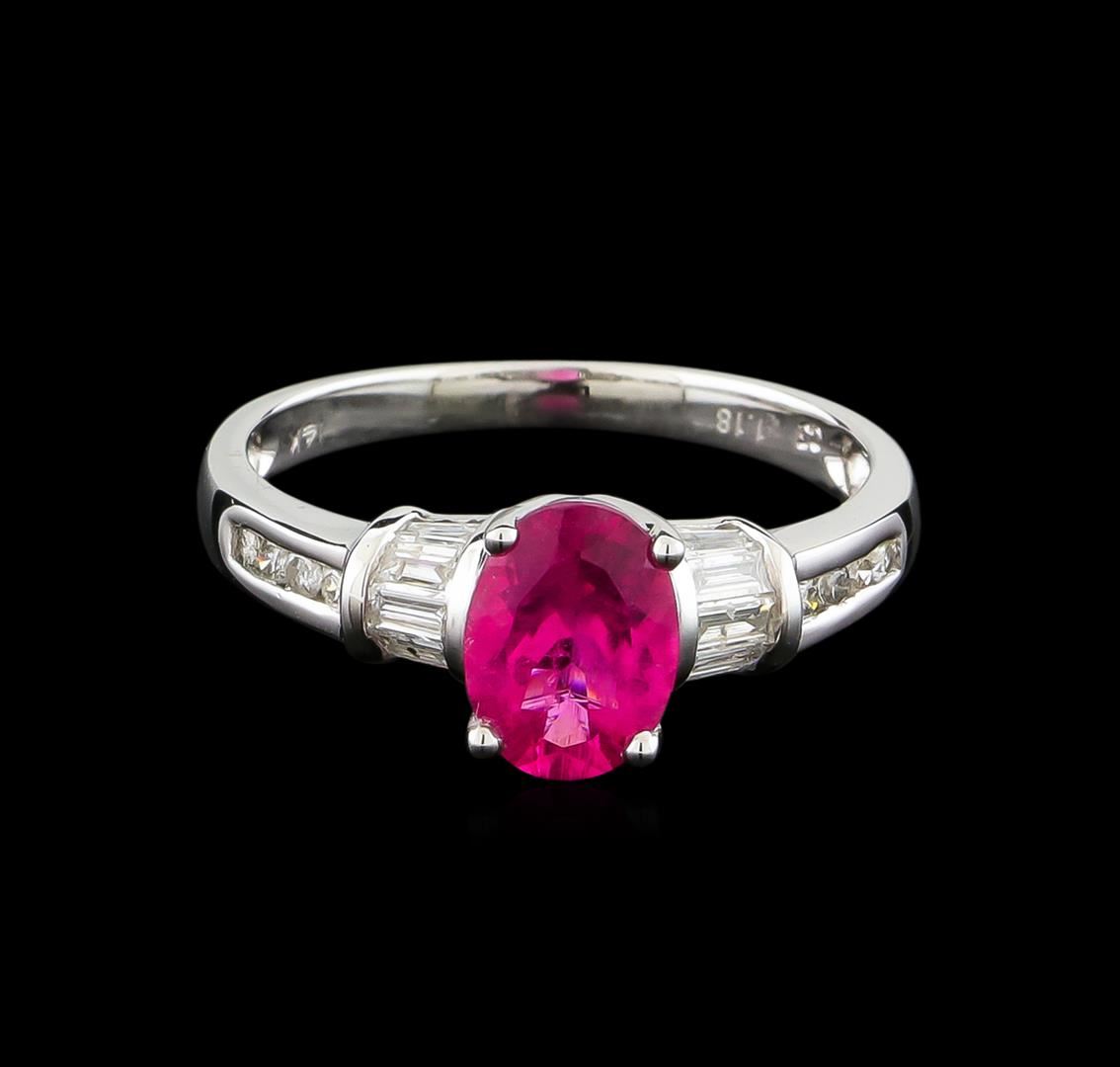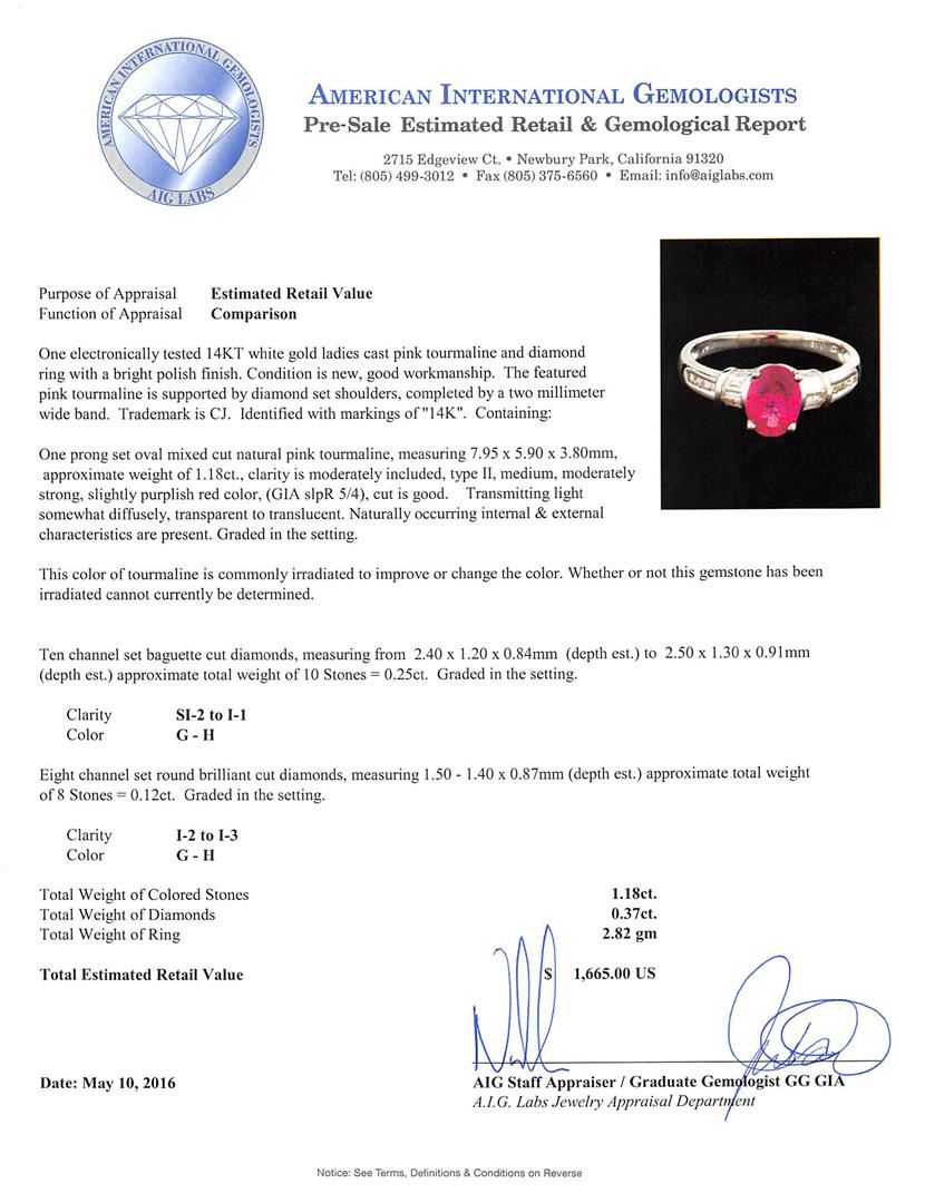 One electronically tested 14KT white gold ladies cast pink tourmaline and diamond ring with a bright polish finish. The featured pink tourmaline is supported by diamond set shoulders, completed by a two millimeter wide band. Trademark is CJ. Identified with markings of "14K". Condition is new, good workmanship. Containing: One prong set oval mixed cut natural pink tourmaline, measuring 7.95 x 5.90 x 3.80mm, approximate weight of 1.18ct., clarity is moderately included, type II, medium, moderately strong, slightly purplish red color, (GIA slpR 5/4), cut is good. Transmitting light somewhat diffusely, transparent to translucent. Naturally occurring internal & external characteristics are present. Graded in the setting. This color of tourmaline is commonly irradiated to improve or change the color. Whether or not this gemstone has been irradiated cannot currently be determined. Ten channel set baguette cut diamonds, measuring from 2.40 x 1.20 x 0.84mm (depth est.) to 2.50 x 1.30 x 0.91mm (depth est.) approximate total weight of 10 Stones = 0.25ct. Graded in the setting. Clarity: SI-2 to I-1. Color: G - H Eight channel set round brilliant cut diamonds, measuring 1.50 - 1.40 x 0.87mm (depth est.) approximate total weight of 8 Stones = 0.12ct. Graded in the setting. Clarity: I-2 to I-3. Color: G - H. Total Weight of Colored Stones 1.18ct. Total Weight of Diamonds 0.37ct. Total Weight of Ring 2.82gm. AIG Appraised at $1,665.00.