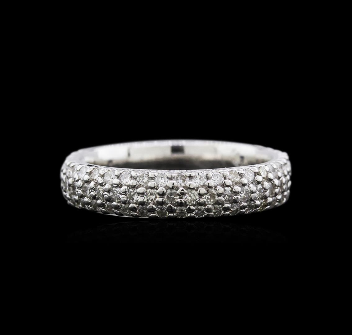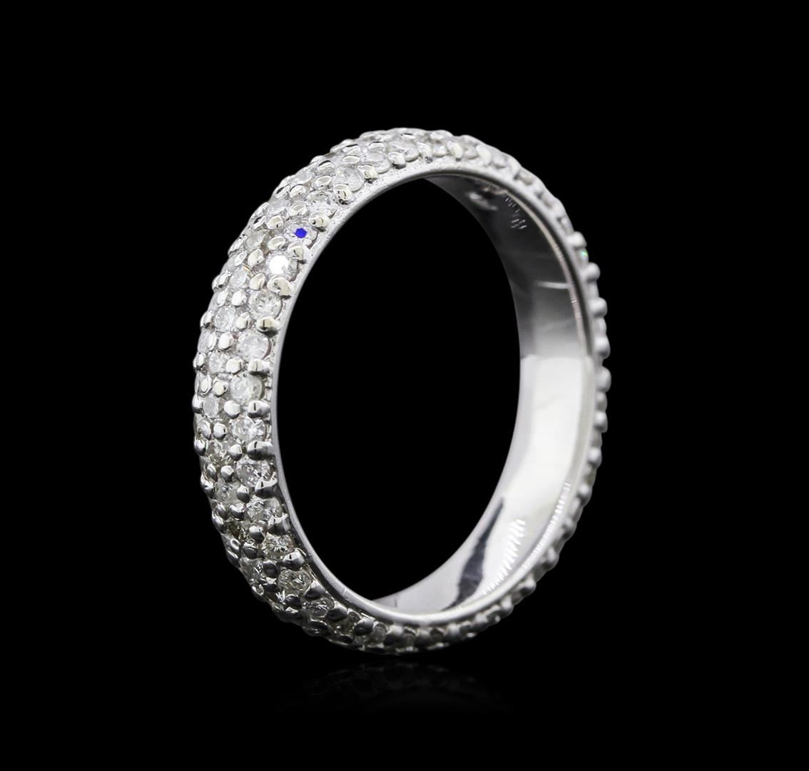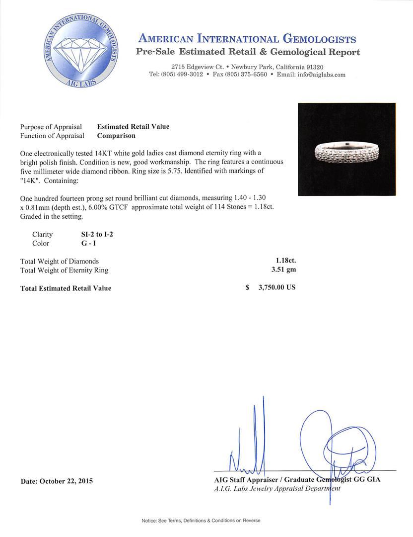 One electronically tested 14KT white gold ladies cast diamond eternity ring with a bright polish finish. The ring features a continuous five millimeter wide diamond ribbon. Ring size is 5.75. Identified with markings of "14K". Condition is new, good workmanship. Containing: One Hundred Fourteen prong set round brilliant cut diamonds, measuring 1.40 - 1.30 x 0.81mm (depth est.), 6.00% GTCF approximate total weight of 114 Stones = 1.18ct. Graded in the setting. Clarity: SI-2 to I-2. Color: G - I. Total Weight of Diamonds 1.18ct. Total Weight of Eternity Ring 3.51gm. AIG Appraised at $3,750.00.