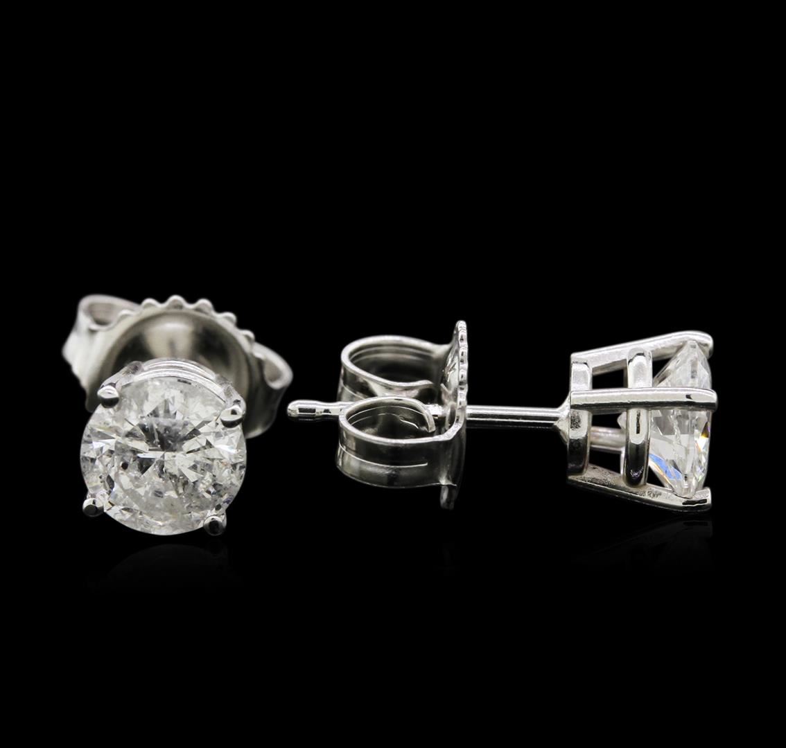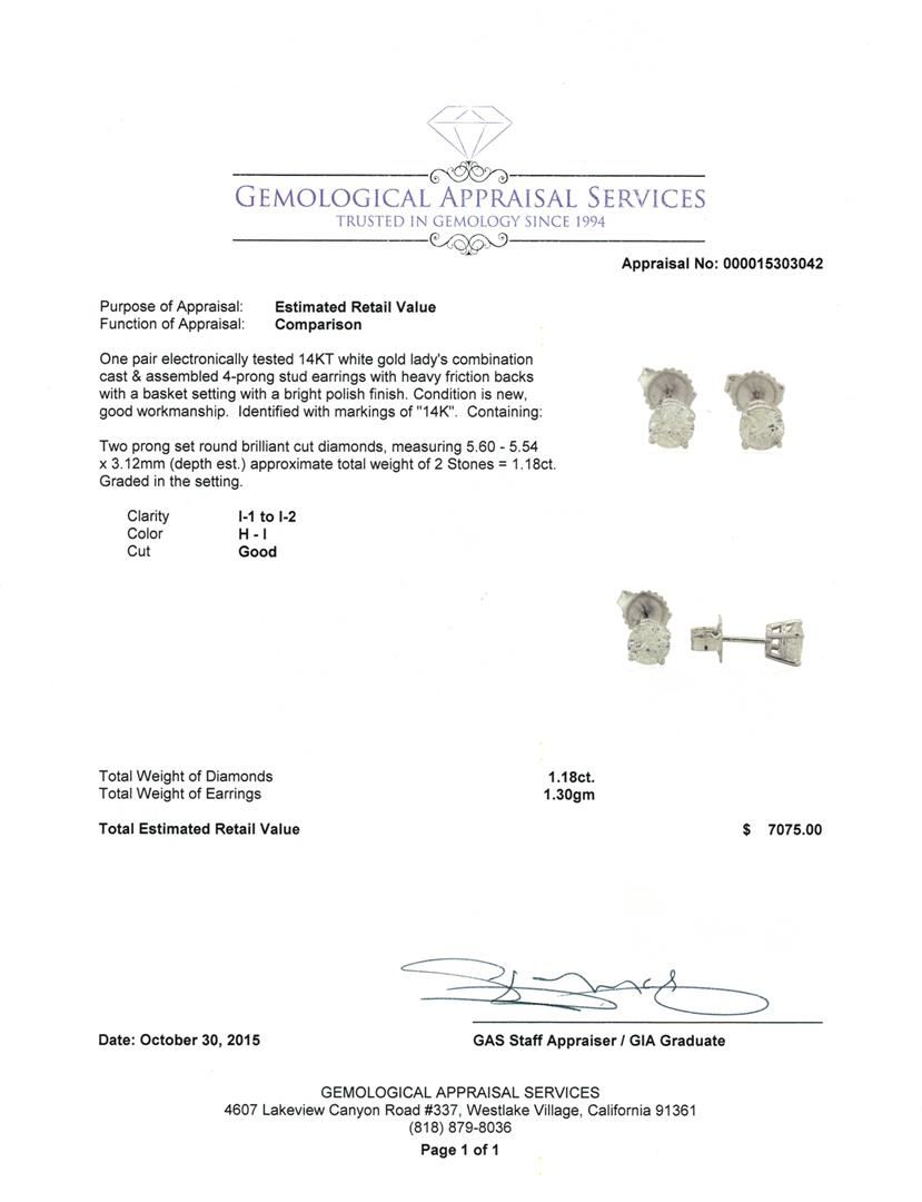 One pair electronically tested 14KT white gold lady's combination cast & assembled 4-prong stud earrings with heavy friction backs with a basket setting with a bright polish finish. Identified with markings of "14K". Condition is new, good workmanship. Containing: Two prong set round brilliant cut diamonds, measuring 5.60 - 5.54 x 3.12mm (depth est.) approximate total weight of 2 Stones = 1.18ct. Graded in the setting. Clarity: I-1 to I-2. Color: H - I. Cut Good. Total Weight of Diamonds 1.18ct. Total Weight of Earrings 1.30gm. GAS Appraised.