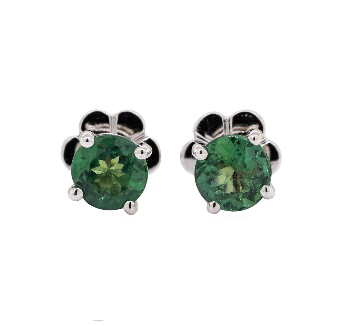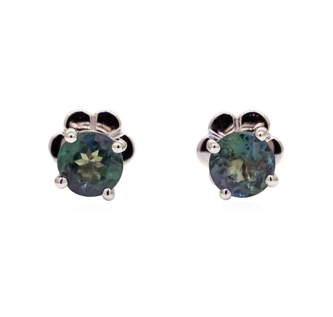 One pair electronically tested 14KT white gold lady's combination cast & assembled fashion stud earrings with heavy friction backs with a bright polish finish. Identified with markings of '14K'. Condition is new, good workmanship. Containing: Two prong set round modified brilliant cut natural alexandrites, measuring 5.02 - 4.93 x 3.24 mm, (depth est.) approximate total weight of 1.19ct., clarity is slightly included, medium, slightly grayish, slightly yellowish green color, (GIA slyG 5/2) to medium light, very slightly grayish, slightly purplish red, (GIA slpR 4/3), cut is good. Transmitting light with a minimum of distortion, transparent. Colored gemstones are presumed to have been subjected to commonly used enhancement processes. Graded in the setting. Total Weight of Colored Stones 1.19ct.. Total Weight of Earrings 1.70gm GAS Appraised at $7645.00. GAS Appraised at $7,645.00.