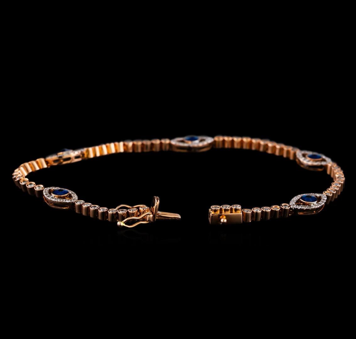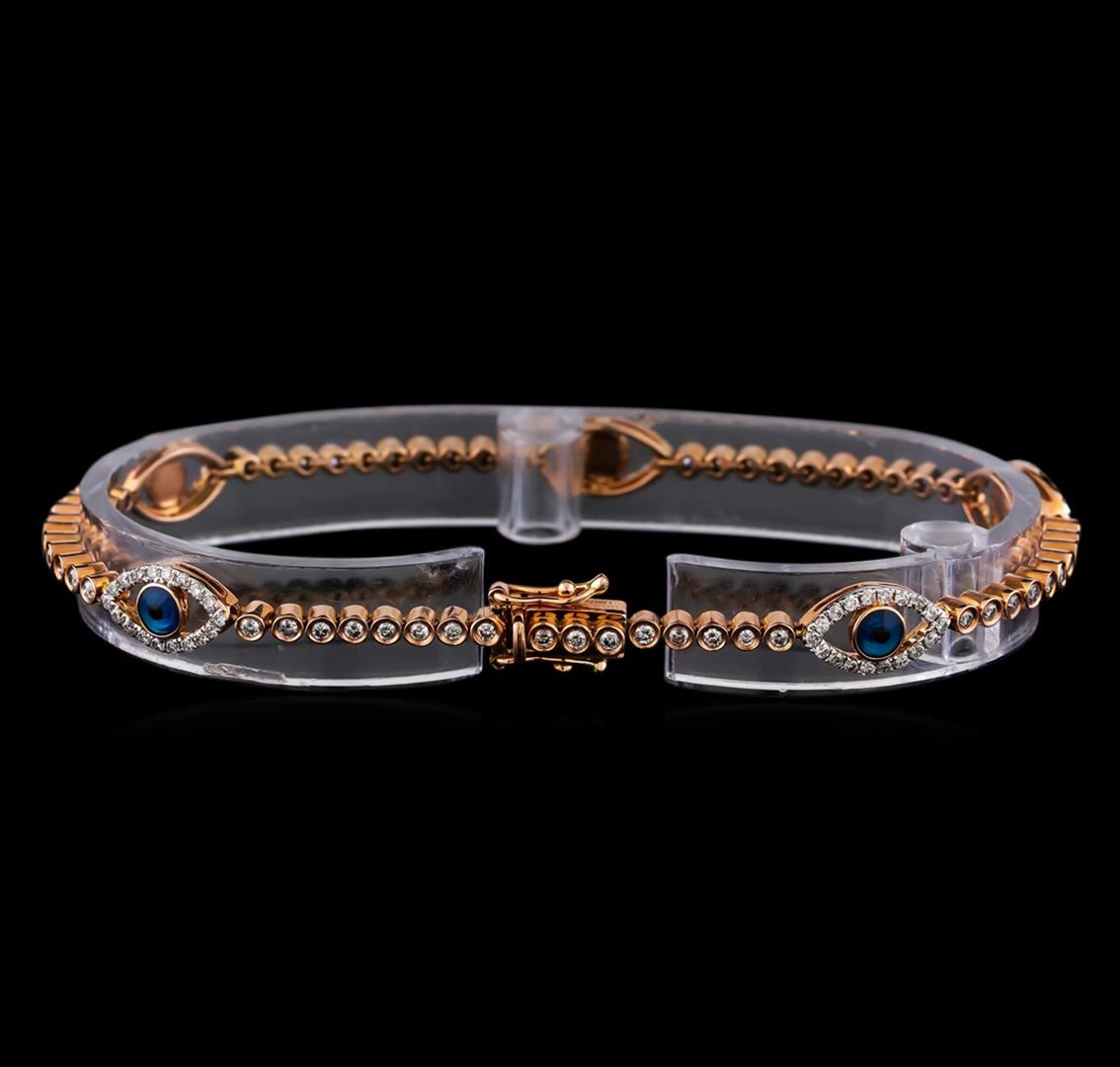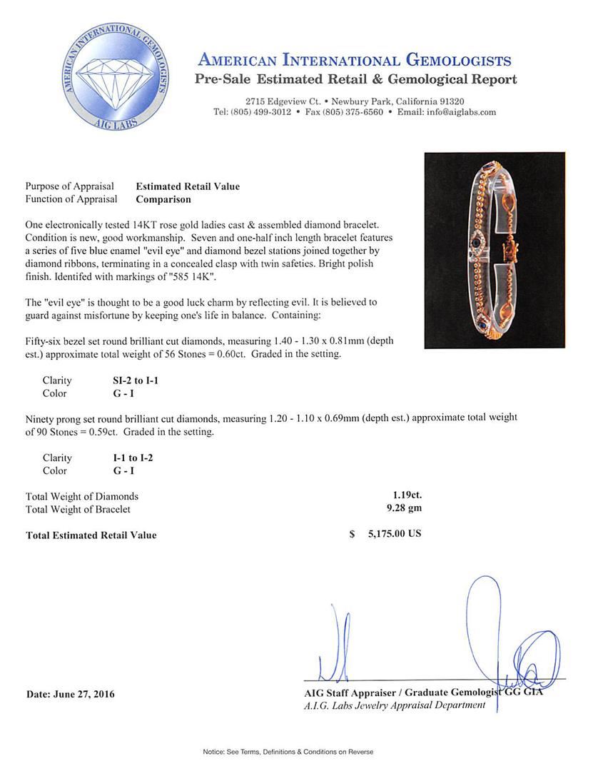 One electronically tested 14KT rose gold ladies cast & assembled diamond bracelet. Seven and one-half inch length bracelet features a series of five blue enamel "evil eye" and diamond bezel stations joined together by diamond ribbons, terminating in a concealed clasp with twin safeties. Bright polish finish. Identified with markings of "585 14K". The "evil eye" is thought to be a good luck charm by reflecting evil. It is believed to guard against misfortune by keeping one's life in balance. Condition is new, good workmanship. Containing: Fifty-Six bezel set round brilliant cut diamonds, measuring 1.40 - 1.30 x 0.81mm (depth est.) approximate total weight of 56 Stones = 0.60ct. Graded in the setting. Clarity: SI-2 to I-1. Color: G - I Ninety prong set round brilliant cut diamonds, measuring 1.20 - 1.10 x 0.69mm (depth est.) approximate total weight of 90 Stones = 0.59ct. Graded in the setting. Clarity: I-1 to I-2. Color: G - I. Total Weight of Diamonds 1.19ct. Total Weight of Bracelet 9.28gm. AIG Appraised at $5,175.00.