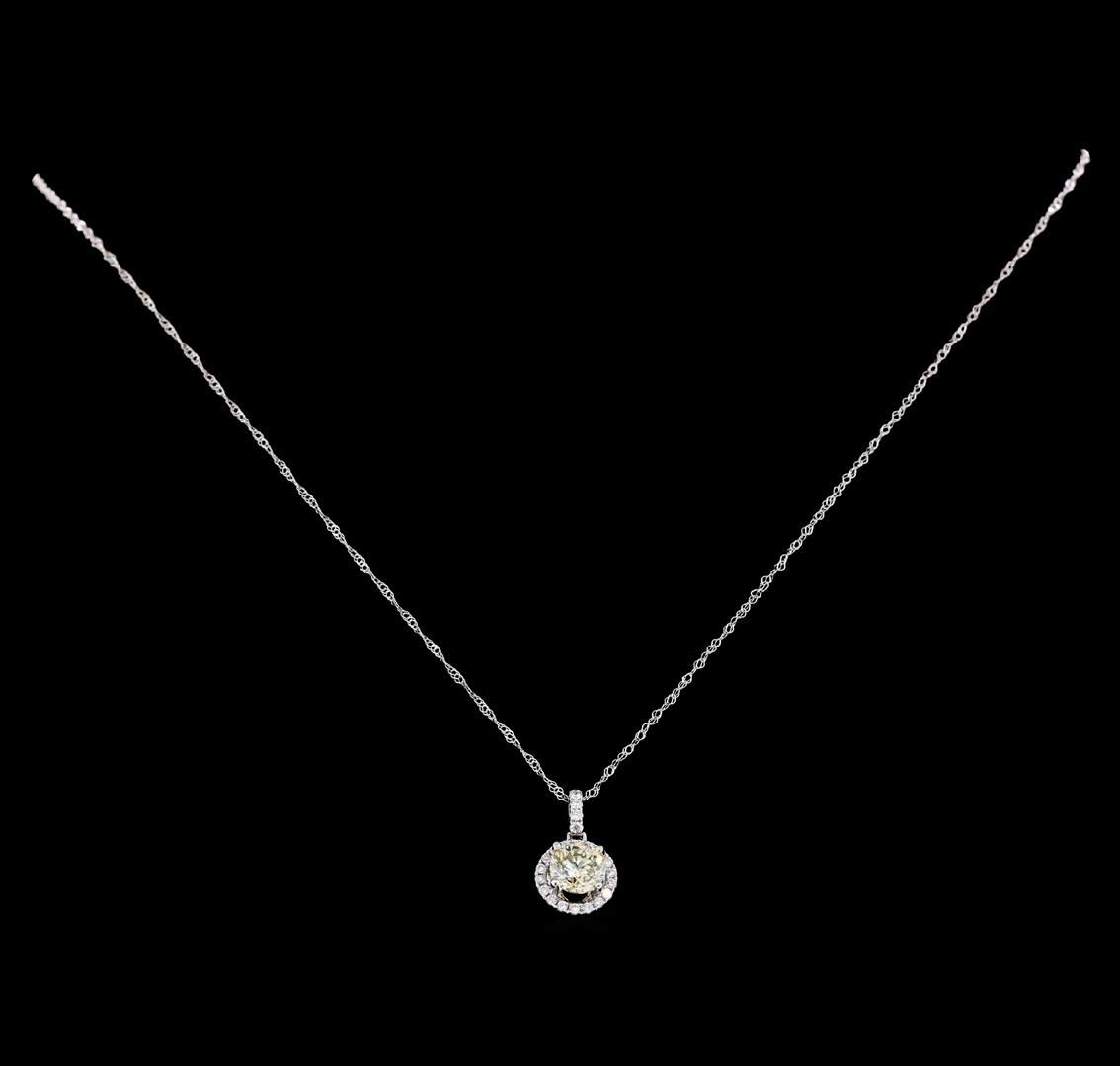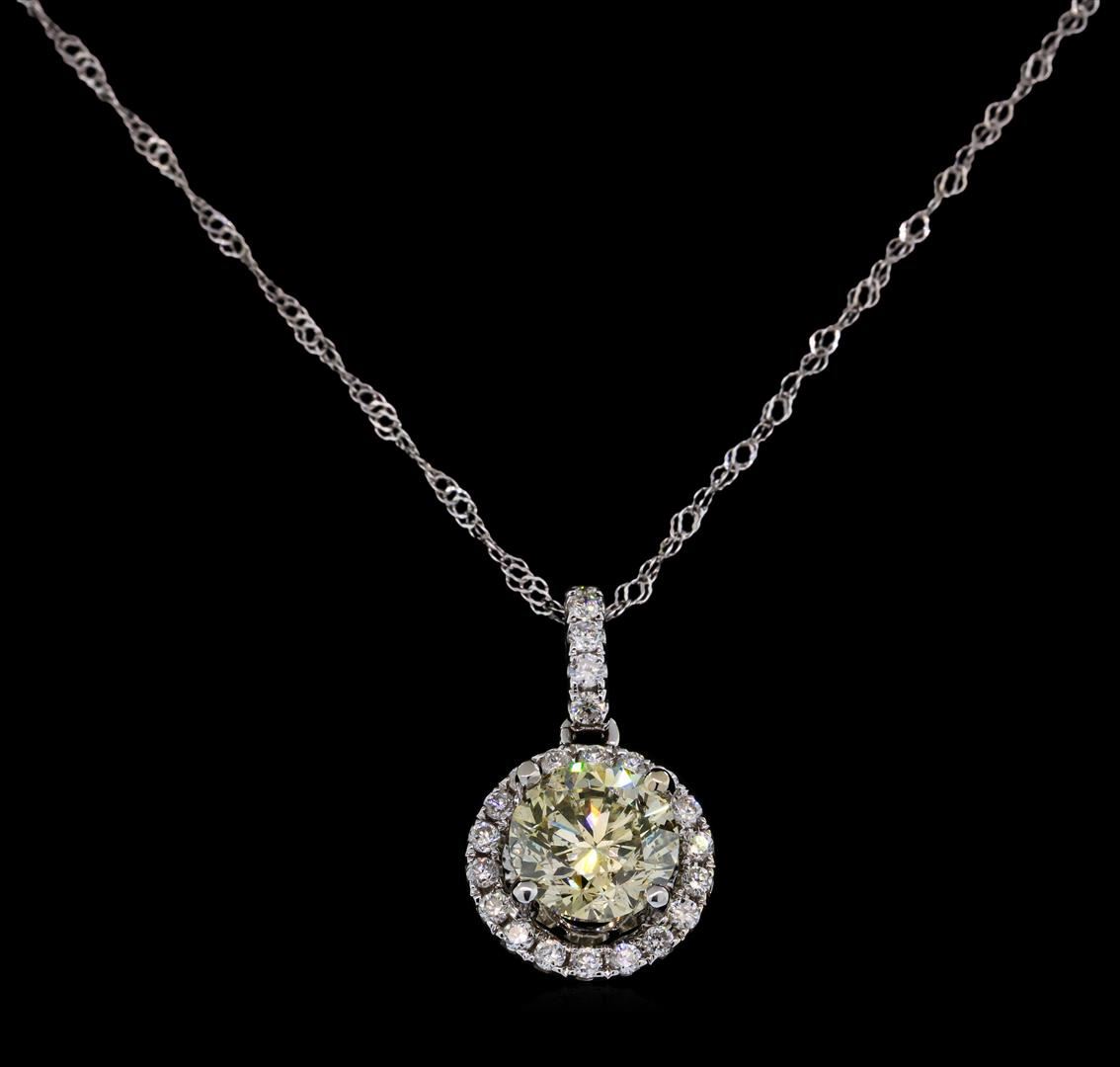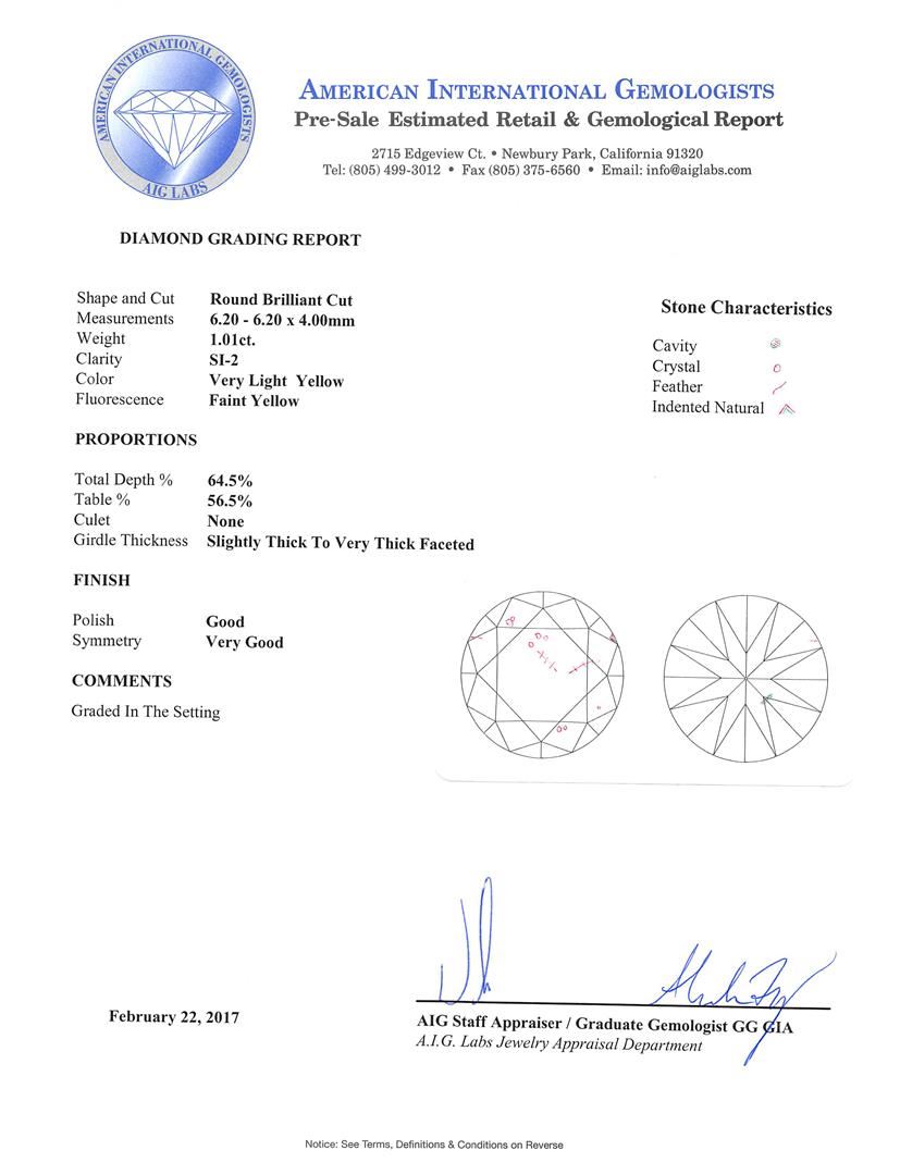 One electronically tested 14KT white gold ladies cast & assembled diamond pendant with chain. The pendant features a diamond set within a diamond bezel completed by a diamond set bail. The pendant is supported by an eighteen inch length 14KT white gold designer style chain, terminating in a spring ring clasp. Bright polish finish. Trademark is CEC. Identified with markings of '14K 585'. Condition is good. Containing: One prong set round brilliant cut diamond, measuring 6.20 - 6.20 x 4.00mm (depth est.), 5.00.%. GTCF approximate weight of 1.01ct with a faint yellow fluorescence. Diamond Grading Report attached. Graded in the setting. Clarity SI-2. Depth: 64.5%. Table: 56.5%. Five prong set round brilliant cut diamonds, measuring 1.30 - 1.30 x 0.78mm (depth est.) approximate total weight of 5 Stones = 0.05ct. Graded in the setting. Clarity SI-2 to I-1. Color: F - H Eighteen prong set round brilliant cut diamonds, measuring 1.20 - 1.20 x 0.72mm (depth est.) approximate total weight of 18 Stones = 0.13ct. Graded in the setting. Clarity SI-2 to I-2. Color: F - H. Total Weight of Diamonds 1.19ct.. Total Weight of Pendant With Chain 1.80gm. AIG Appraised at $7,850.00.