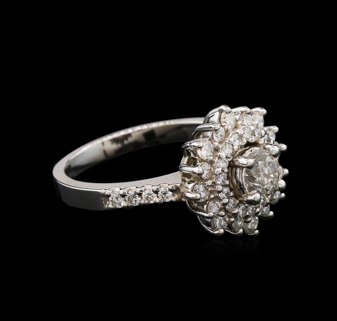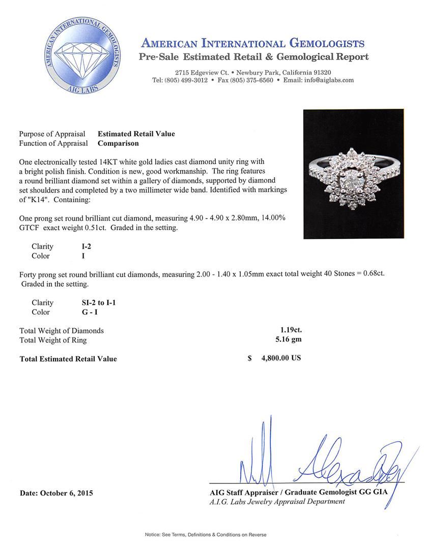 One electronically tested 14KT white gold ladies cast diamond unity ring with a bright polish finish. The ring features a round brilliant diamond set within a gallery of diamonds, supported by diamond set shoulders and completed by a two millimeter wide band. Identified with markings of "K14". Condition is new, good workmanship. Containing: One prong set round brilliant cut diamond, measuring 4.90 - 4.90 x 2.80mm, 14.00.%. GTCF exact weight 0.51ct. Graded in the setting. Clarity: I-2. Color: I Forty prong set round brilliant cut diamonds, measuring 2.00 - 1.40 x 1.05mm exact total weight 40 Stones = 0.68ct. Graded in the setting. Clarity: SI-2 to I-1. Color: G - I. Total Weight of Diamonds 1.19ct. Total Weight of Ring 5.16gm. AIG Appraised at $4,800.00.