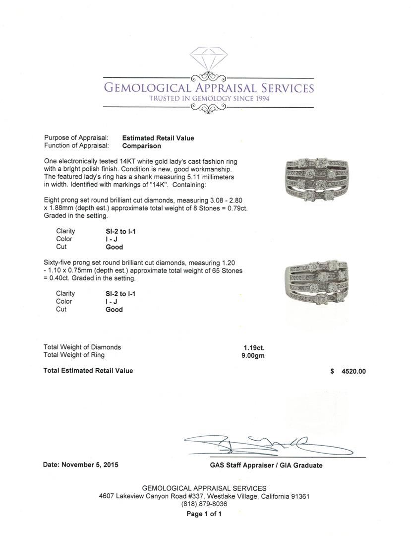 One electronically tested 14KT white gold lady's cast fashion ring with a bright polish finish. The featured lady's ring has a shank measuring 5.11 millimeters in width. Identified with markings of "14K". Condition is new, good workmanship. Containing: Eight prong set round brilliant cut diamonds, measuring 3.08 - 2.80 x 1.88mm (depth est.) approximate total weight of 8 Stones = 0.79ct. Graded in the setting. Clarity: SI-2 to I-1. Color: I - Good Sixty-Five prong set round brilliant cut diamonds, measuring 1.20 - 1.10 x 0.75mm (depth est.) approximate total weight of 65 Stones = 0.40ct. Graded in the setting. Clarity: SI-2 to I-1. Color: I - Good. Total Weight of Diamonds 1.19ct. Total Weight of Ring 9.00gm. GAS Appraised at $4,520.00.
