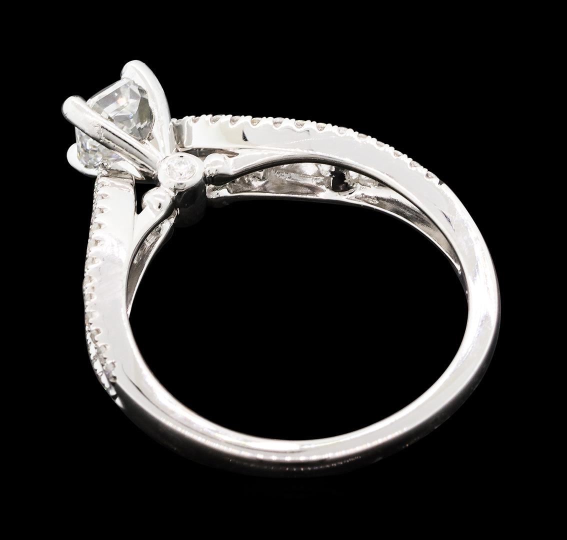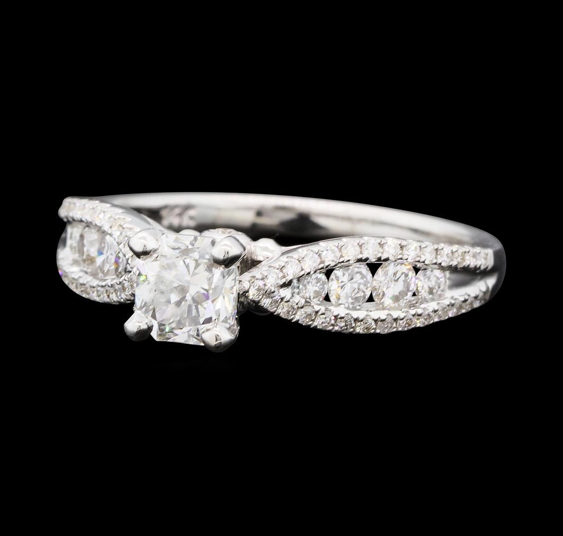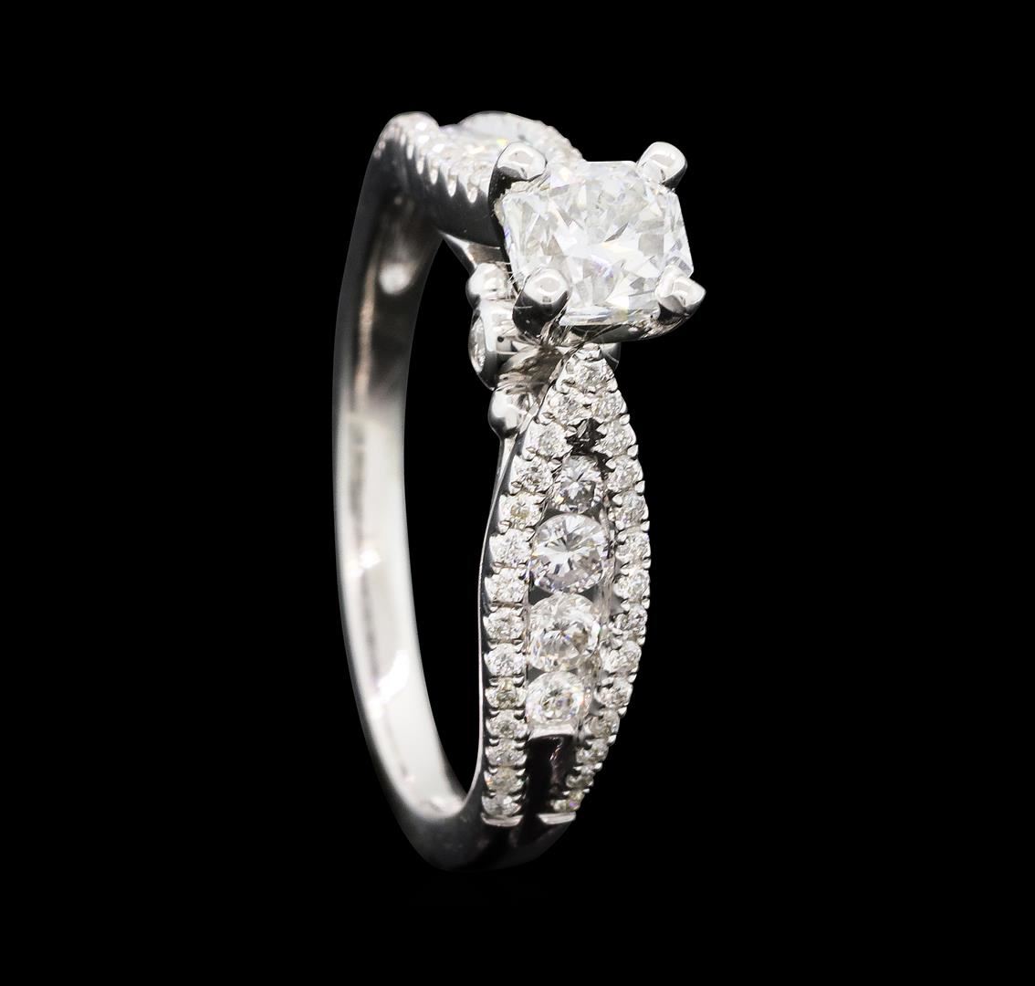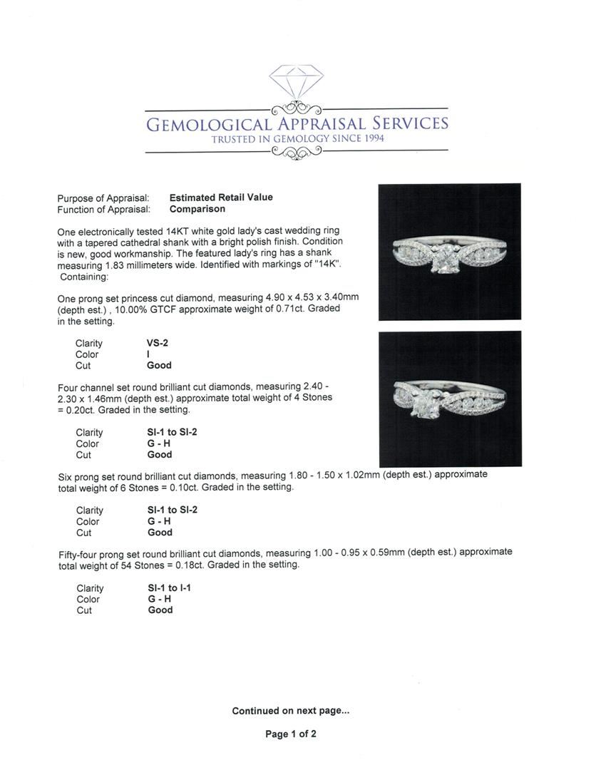 One electronically tested 14KT white gold lady's cast wedding ring with a tapered cathedral shank with a bright polish finish. The featured lady's ring has a shank measuring 1.83 millimeters wide. Identified with markings of '14K'. Condition is new, good workmanship. Containing: One prong set princess cut diamond, measuring 4.90 x 4.53 x 3.40mm (depth est.) , 10.00.%. GTCF approximate weight of 0.71ct. Graded in the setting. Color I Clarity VS-2 Cut Good Four channel set round brilliant cut diamonds, measuring 2.40 - 2.30 x 1.46mm (depth est.) approximate total weight of 4 Stones = 0.20ct. Graded in the setting. Color G - H Clarity SI-1 to SI-2 Cut Good Six prong set round brilliant cut diamonds, measuring 1.80 - 1.50 x 1.02mm (depth est.) approximate total weight of 6 Stones = 0.10ct. Graded in the setting. Color G - H Clarity SI-1 to SI-2 Cut Good Fifty-Four prong set round brilliant cut diamonds, measuring 1.00 - 0.95 x 0.59mm (depth est.) approximate total weight of 54 Stones = 0.18ct. Graded in the setting. Color G - H Clarity SI-1 to I-1 Cut Good. Total Weight of Diamonds 1.19ct.. Total Weight of Ring 3.30gm GAS Appraised at $7,150.00.