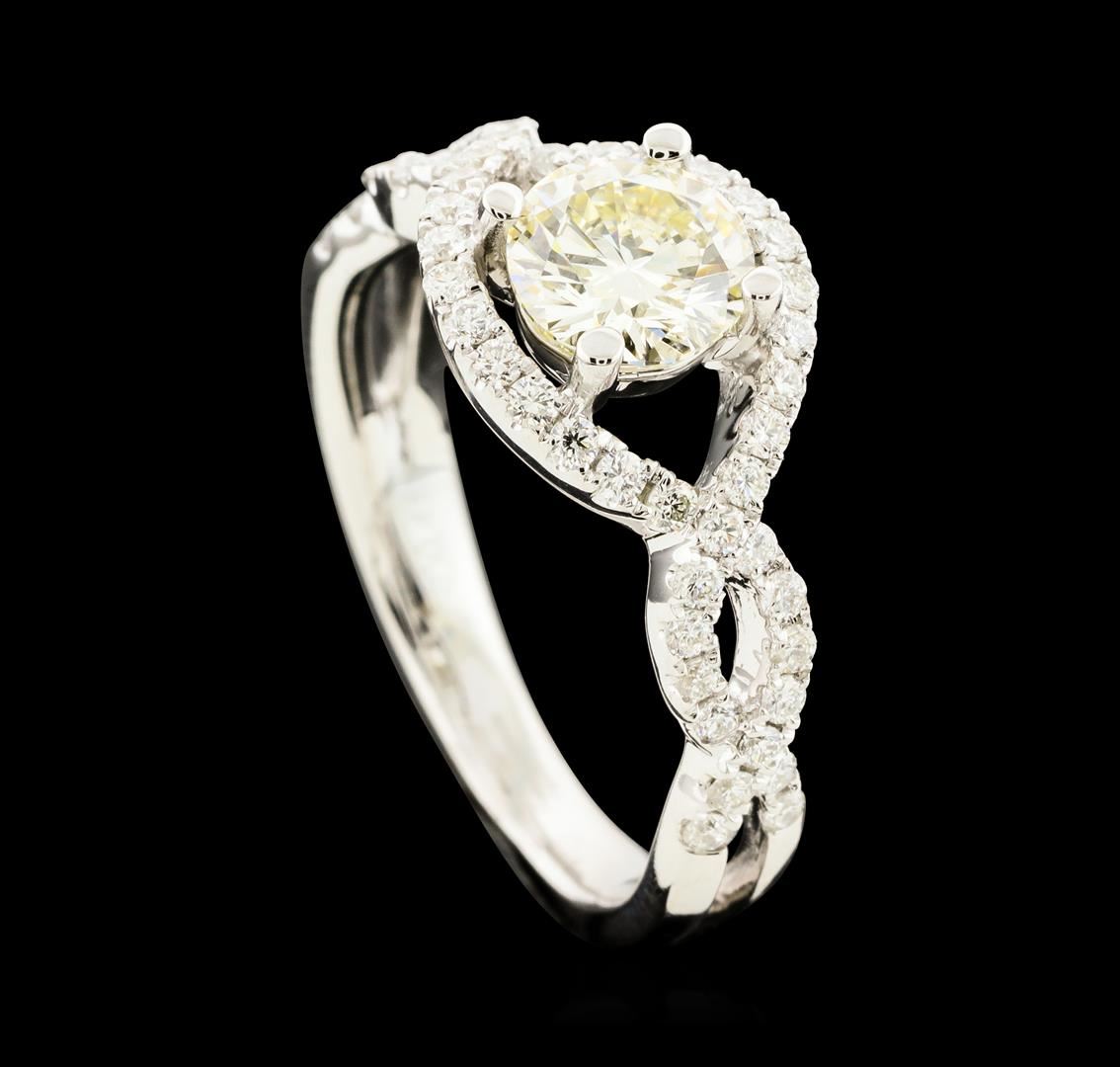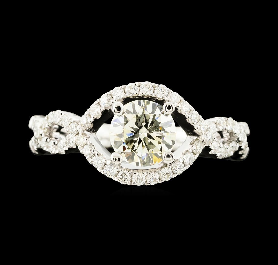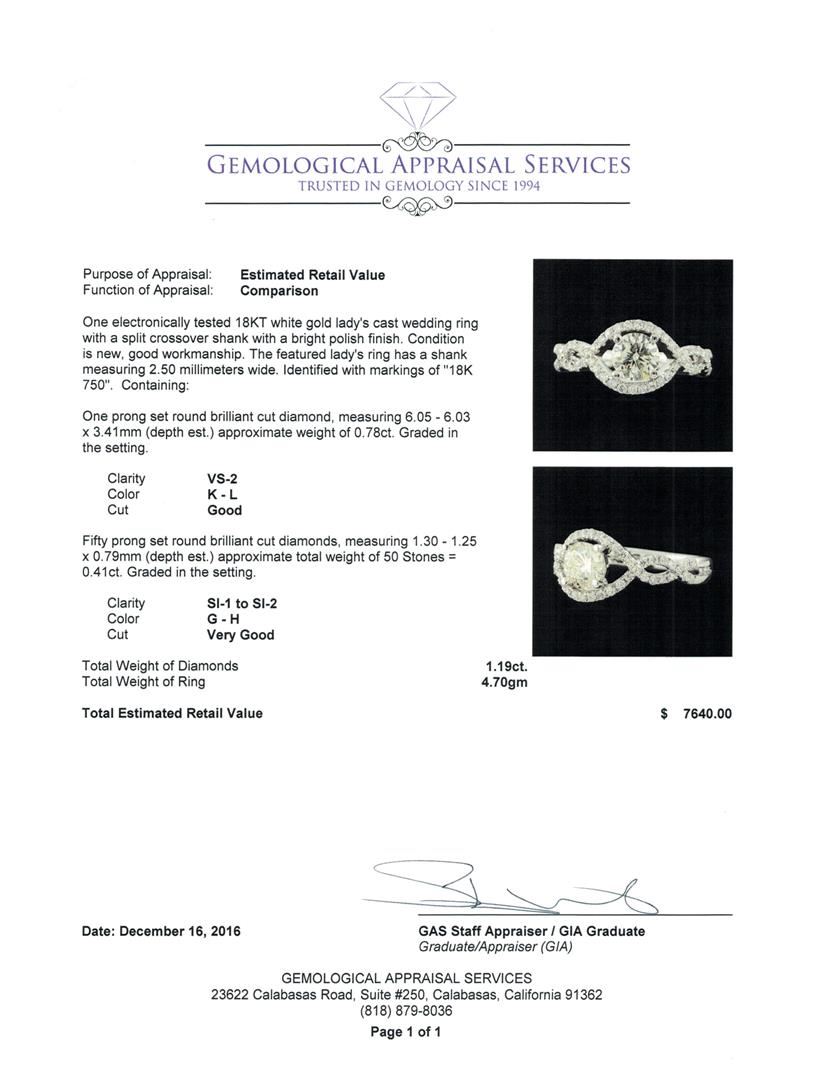 One electronically tested 18KT white gold lady's cast wedding ring with a split crossover shank with a bright polish finish. The featured lady's ring has a shank measuring 2.50 millimeters wide. Identified with markings of '18K 750'. Condition is new, good workmanship. Containing: One prong set round brilliant cut diamond, measuring 6.05 - 6.03 x 3.41mm (depth est.) approximate weight of 0.78ct. Graded in the setting. Clarity VS-2. Color: K - L Cut Good Fifty prong set round brilliant cut diamonds, measuring 1.30 - 1.25 x 0.79mm (depth est.) approximate total weight of 50 Stones = 0.41ct. Graded in the setting. Clarity SI-1 to SI-2. Color: G - H Cut Very Good. Total Weight of Diamonds 1.19ct.. Total Weight of Ring 4.70gm. GAS Appraised at $7,640.00.