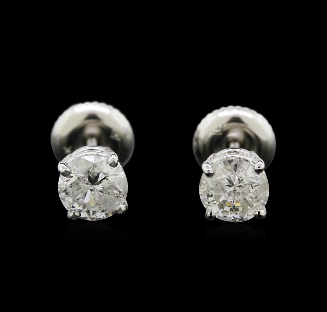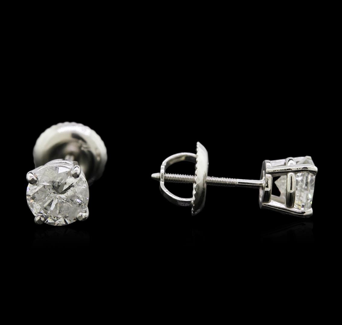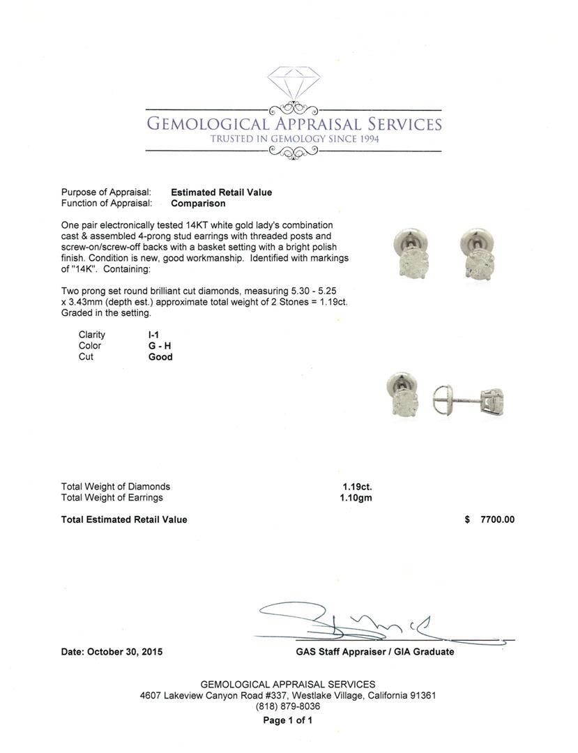 One pair electronically tested 14KT white gold lady's combination cast & assembled 4-prong stud earrings with threaded posts and screw-on/screw-off backs with a basket setting with a bright polish finish. Identified with markings of "14K". Condition is new, good workmanship. Containing: Two prong set round brilliant cut diamonds, measuring 5.30 - 5.25 x 3.43mm (depth est.) approximate total weight of 2 Stones = 1.19ct. Graded in the setting. Clarity: I-1. Color: G - Good. Total Weight of Diamonds 1.19ct. Total Weight of Earrings 1.10gm. GAS Appraised.