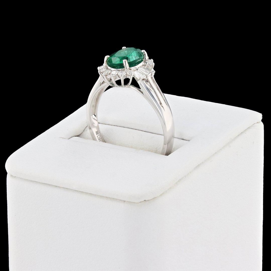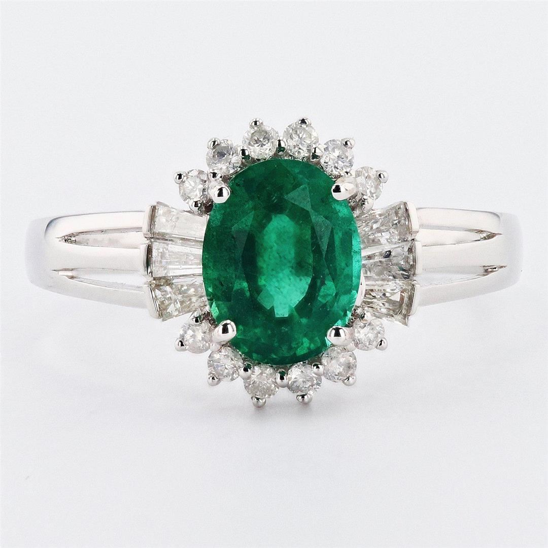 One polished, stamped, and tested 18K white gold ring with a bright finish. The ring is mounted with: I genuine emerald center stone weighing approximately 1.19 carat, and 18 genuine faceted diamonds weighing approximately 0.38 carats. This item weighs 2.