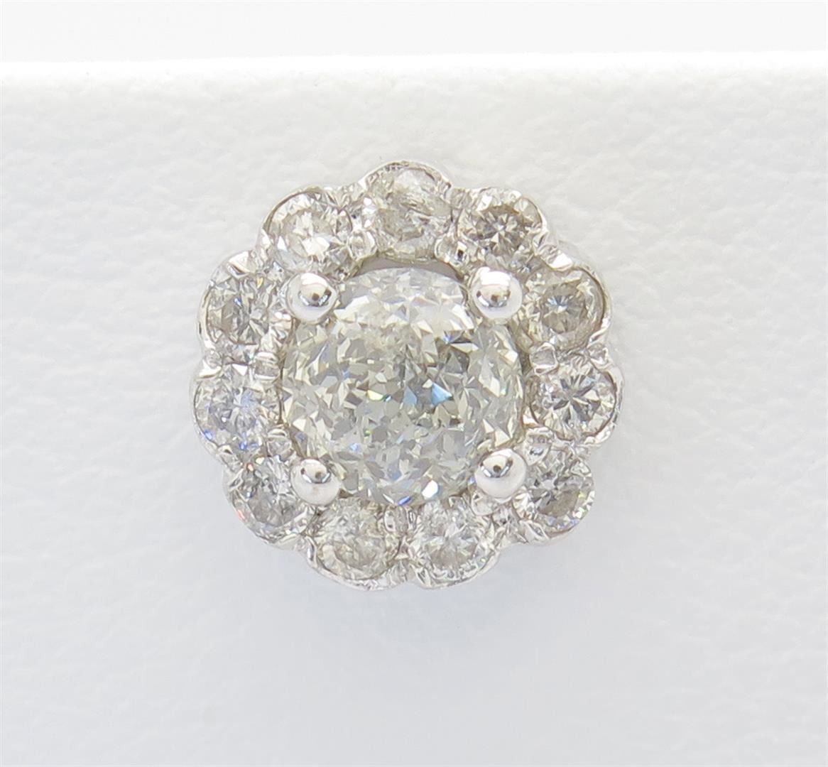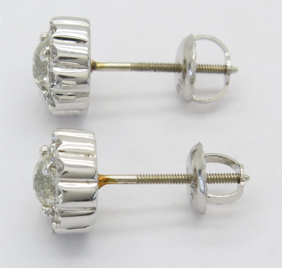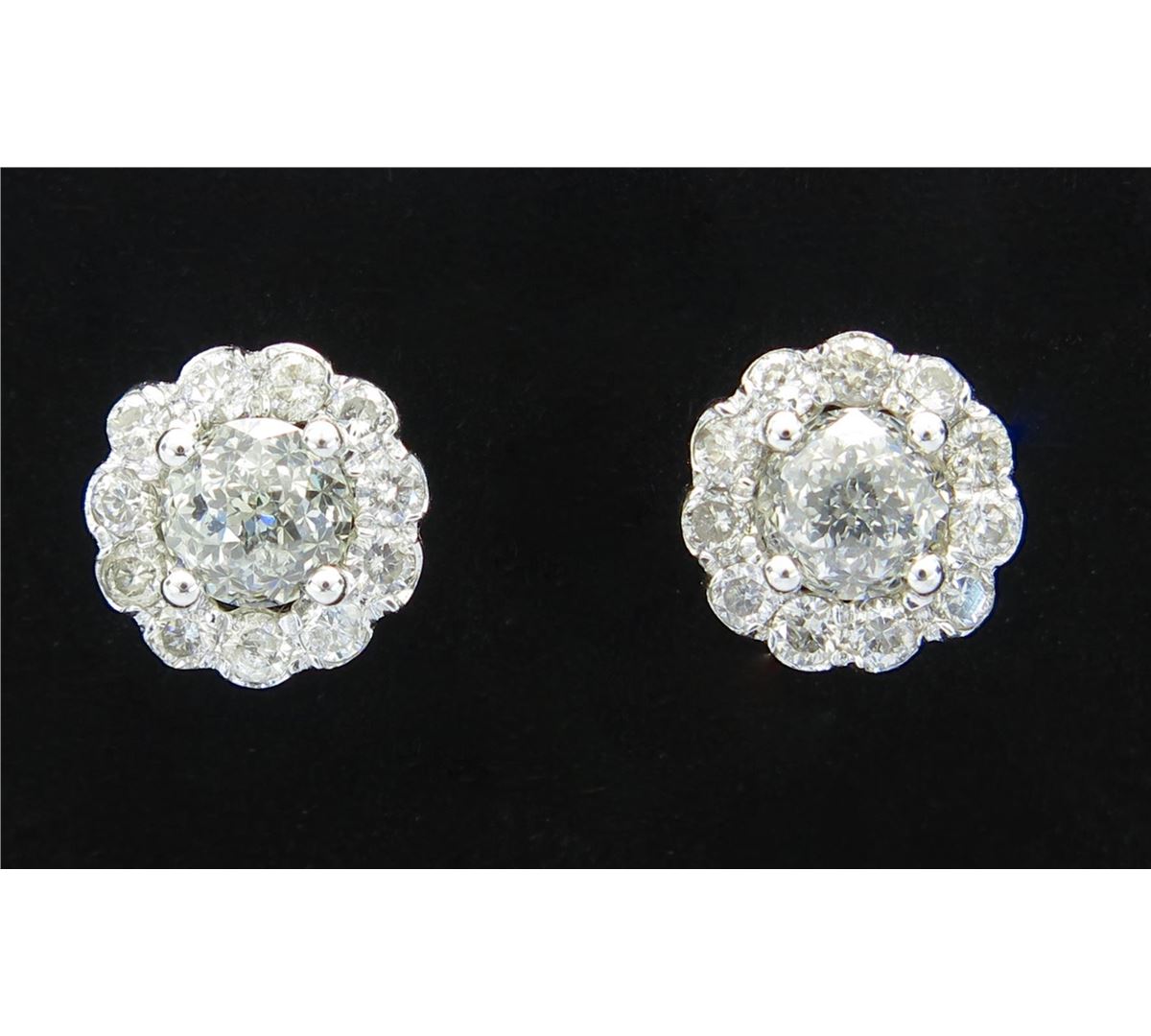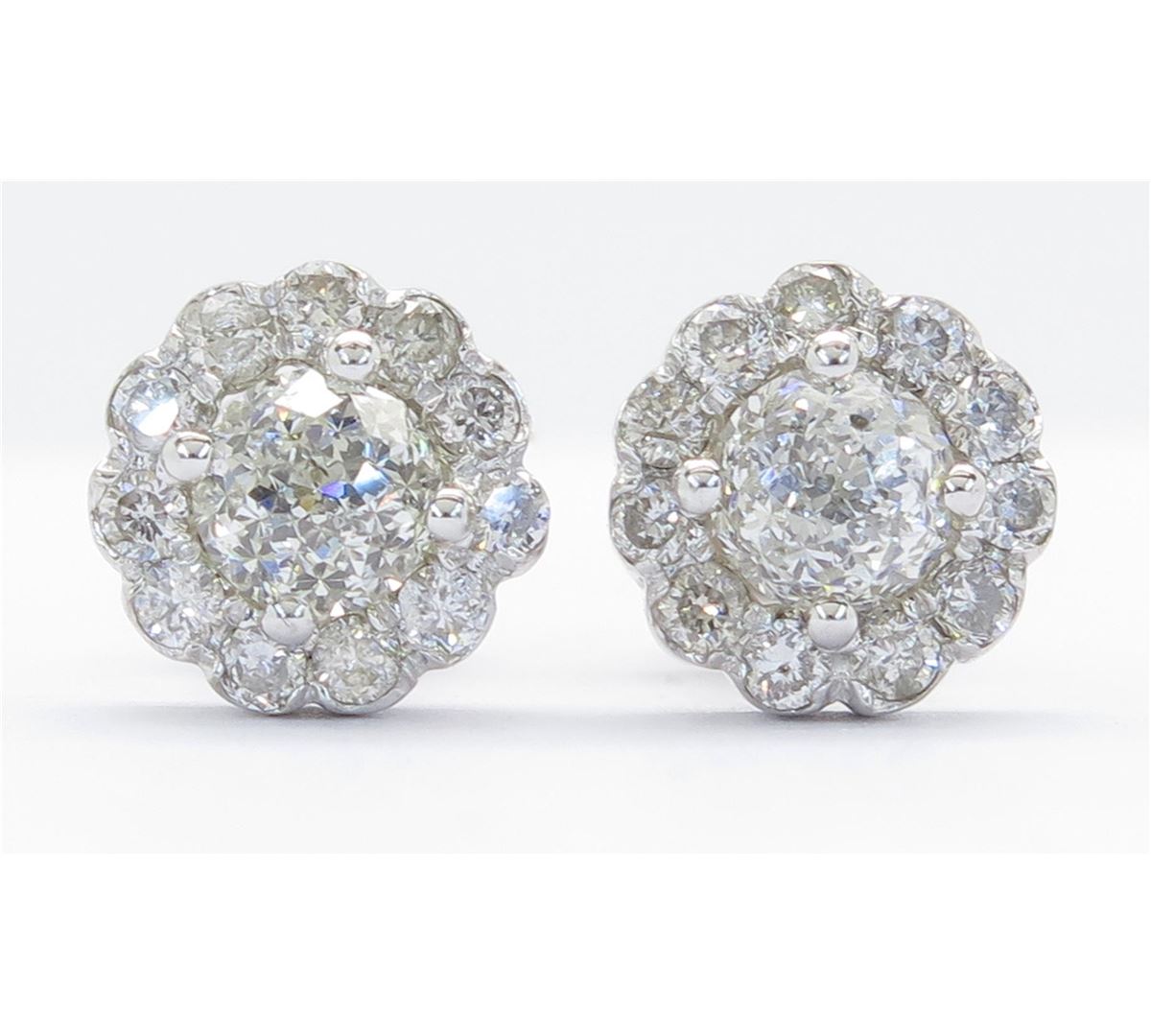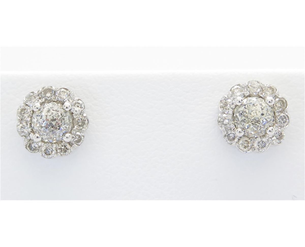 One tested pair of 14K white diamond earrings. Condition is new. Containing: Two Crown of Light Diamonds. Clarity: I, Color: I-J. Twenty-two additional Round Brilliant Cut Diamonds surround the center diamonds. Approximate total diamond weight: 1.19CTW. Diamonds are graded in the mounting, unless otherwise stated. Weight of earrings: 2.3 grams.