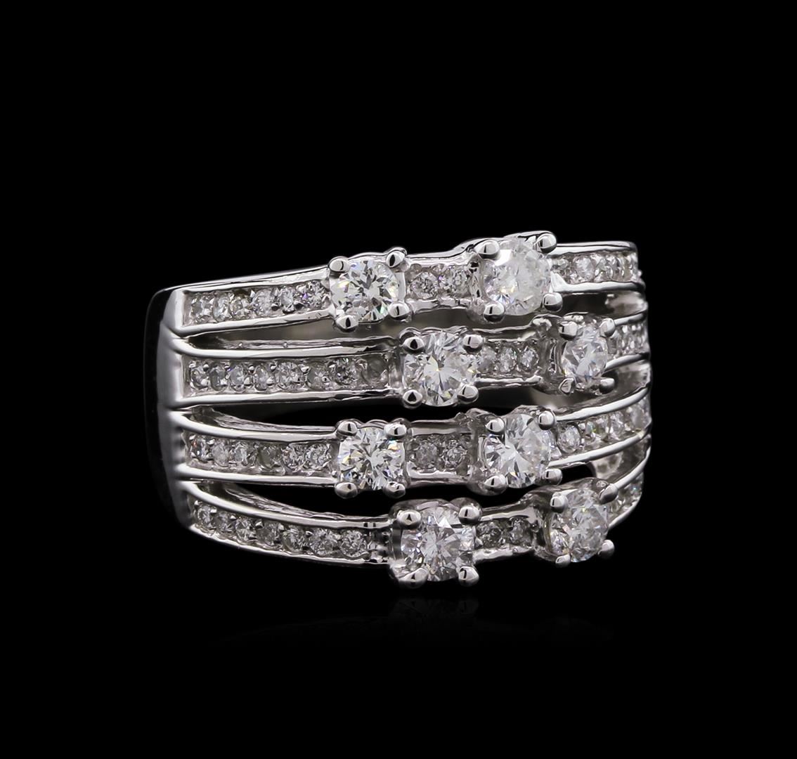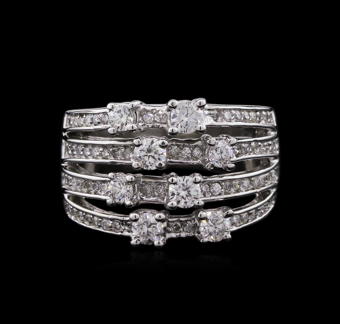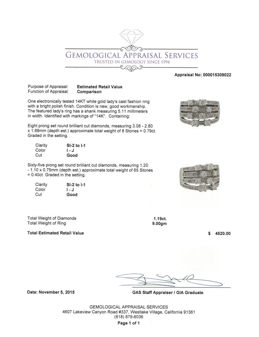 One electronically tested 14KT white gold lady's cast fashion ring with a bright polish finish. The featured lady's ring has a shank measuring 5.11 millimeters in width. Identified with markings of "14K". Condition is new, good workmanship. Containing: Eight prong set round brilliant cut diamonds, measuring 3.08 - 2.80 x 1.88mm (depth est.) approximate total weight of 8 Stones = 0.79ct. Graded in the setting. Clarity: SI-2 to I-1. Color: I - Good Sixty-Five prong set round brilliant cut diamonds, measuring 1.20 - 1.10 x 0.75mm (depth est.) approximate total weight of 65 Stones = 0.40ct. Graded in the setting. Clarity: SI-2 to I-1. Color: I - Good. Total Weight of Diamonds 1.19ct. Total Weight of Ring 9.00gm. GAS Appraised at $4,520.00.