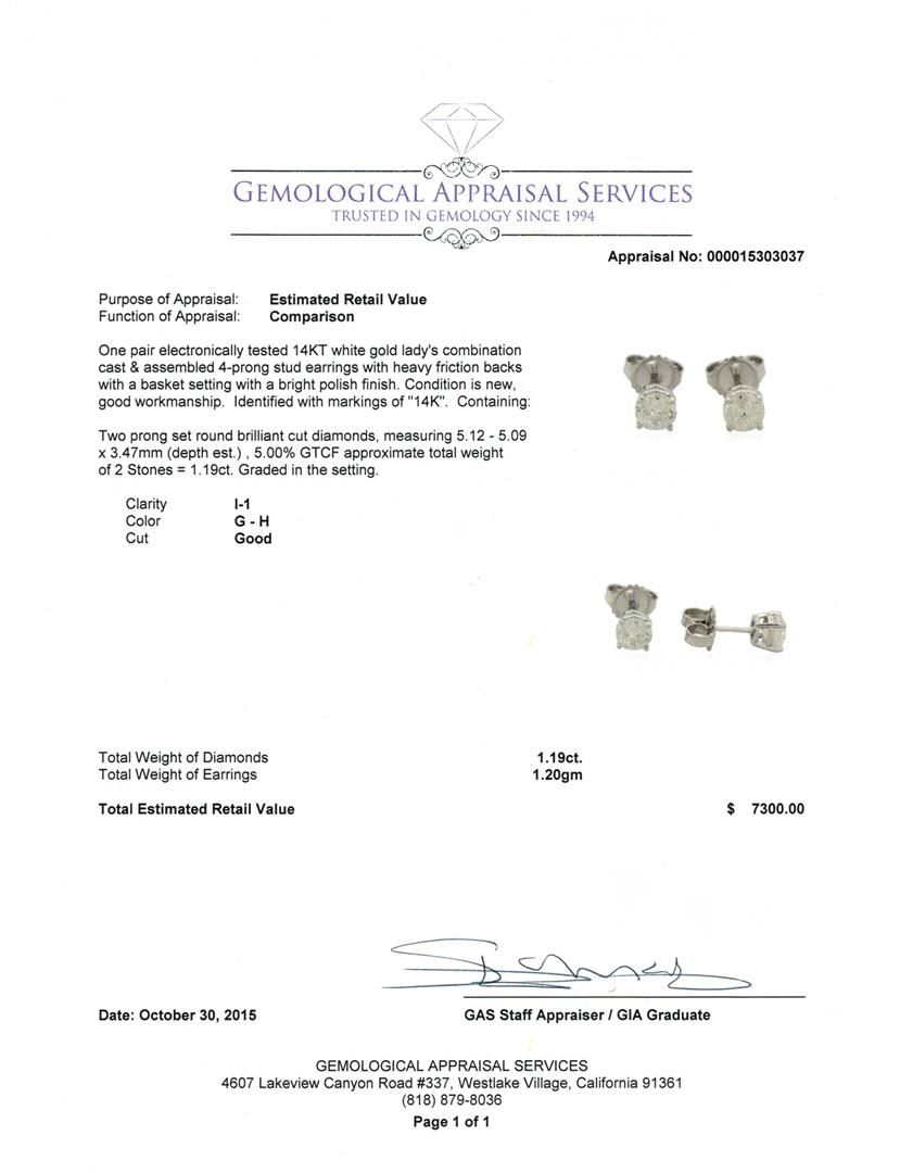 One pair electronically tested 14KT white gold lady's combination cast & assembled 4-prong stud earrings with heavy friction backs with a basket setting with a bright polish finish. Identified with markings of "14K". Condition is new, good workmanship. Containing: Two prong set round brilliant cut diamonds, measuring 5.12 - 5.09 x 3.47mm (depth est.) , 5.00% GTCF approximate total weight of 2 Stones = 1.19ct. Graded in the setting. Clarity: I-1. Color: G - Good. Total Weight of Diamonds 1.19ct. Total Weight of Earrings 1.20gm. GAS Appraised.
