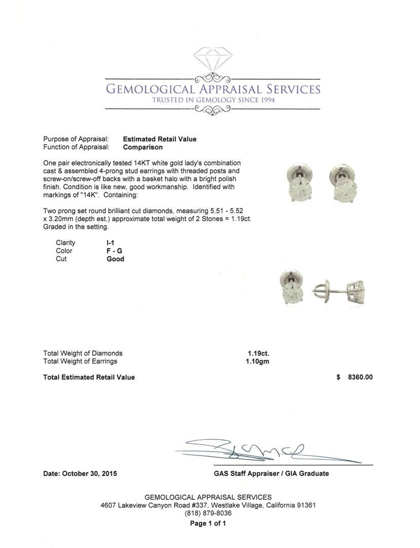 One pair electronically tested 14KT white gold lady's combination cast & assembled 4-prong stud earrings with threaded posts and screw-on/screw-off backs with a basket halo with a bright polish finish. Identified with markings of "14K". Condition is like new, good workmanship. Containing: Two prong set round brilliant cut diamonds, measuring 5.51 - 5.52 x 3.20mm (depth est.) approximate total weight of 2 Stones = 1.19ct. Graded in the setting. Clarity: I-1. Color: F - Good. Total Weight of Diamonds 1.19ct. Total Weight of Earrings 1.10gm. GAS Appraised.