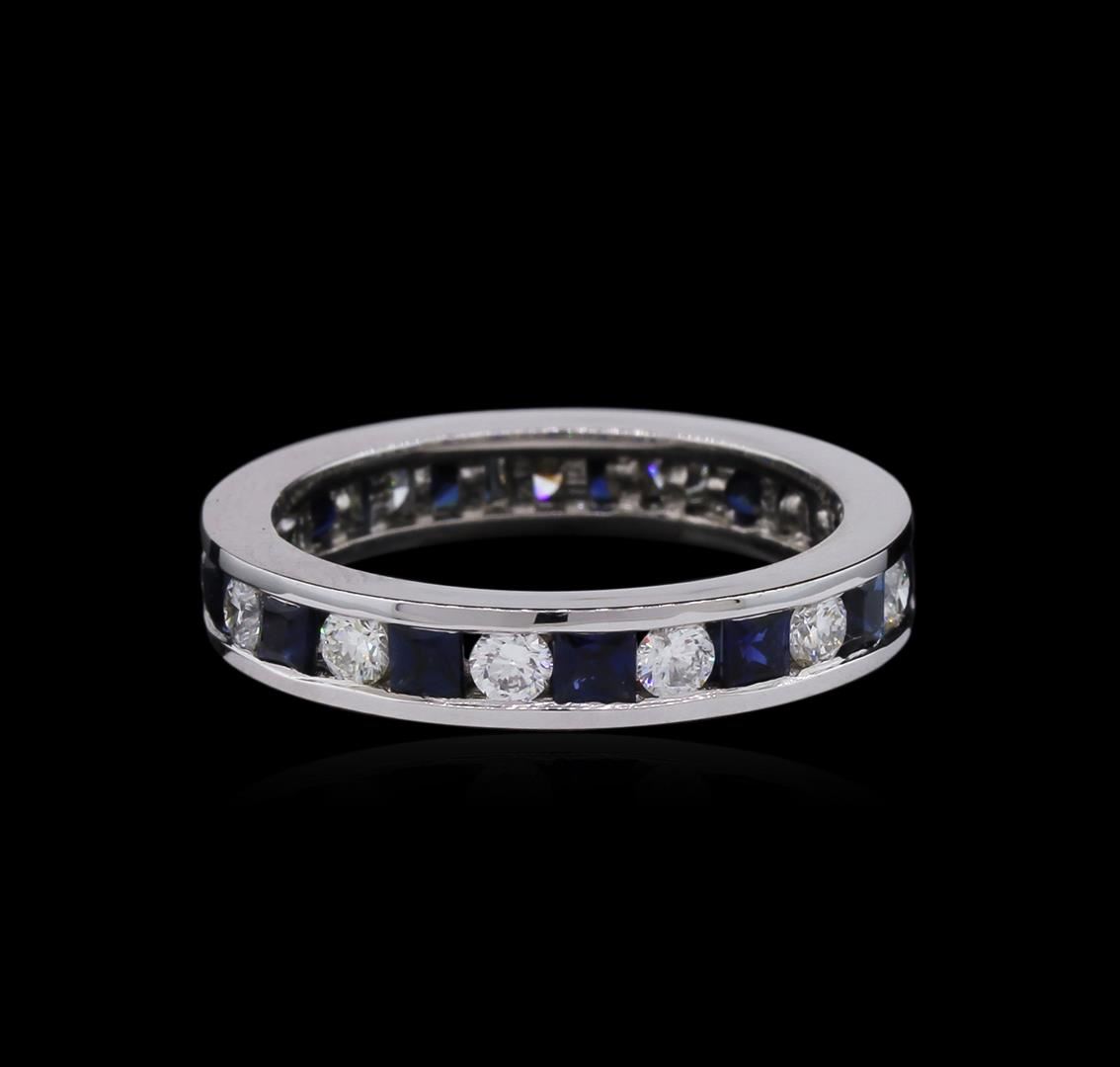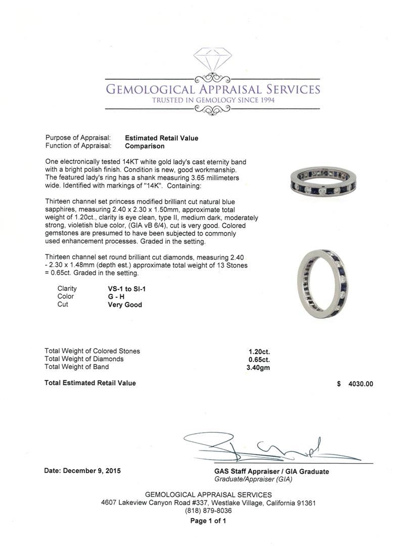 One electronically tested 14KT white gold lady's cast eternity band with a bright polish finish. The featured lady's ring has a shank measuring 3.65 millimeters wide. Identified with markings of "14K". Condition is new, good workmanship. Containing: Thirteen channel set princess modified brilliant cut natural blue sapphires, measuring 2.40 x 2.30 x 1.50mm, approximate total weight of 1.20ct., clarity is eye clean, type II, medium dark, moderately strong, violetish blue color, (GIA vB 6/4), cut is very good. Colored gemstones are presumed to have been subjected to commonly used enhancement processes. Graded in the setting. Thirteen channel set round brilliant cut diamonds, measuring 2.40 - 2.30 x 1.48mm (depth est.) approximate total weight of 13 Stones = 0.65ct. Graded in the setting. Clarity: VS-1 to SI-1. Color: G - Very Good. Total Weight of Colored Stones 1.20ct. Total Weight of Diamonds 0.65ct. Total Weight of Band 3.40gm. GAS Appraised at $4,030.00.