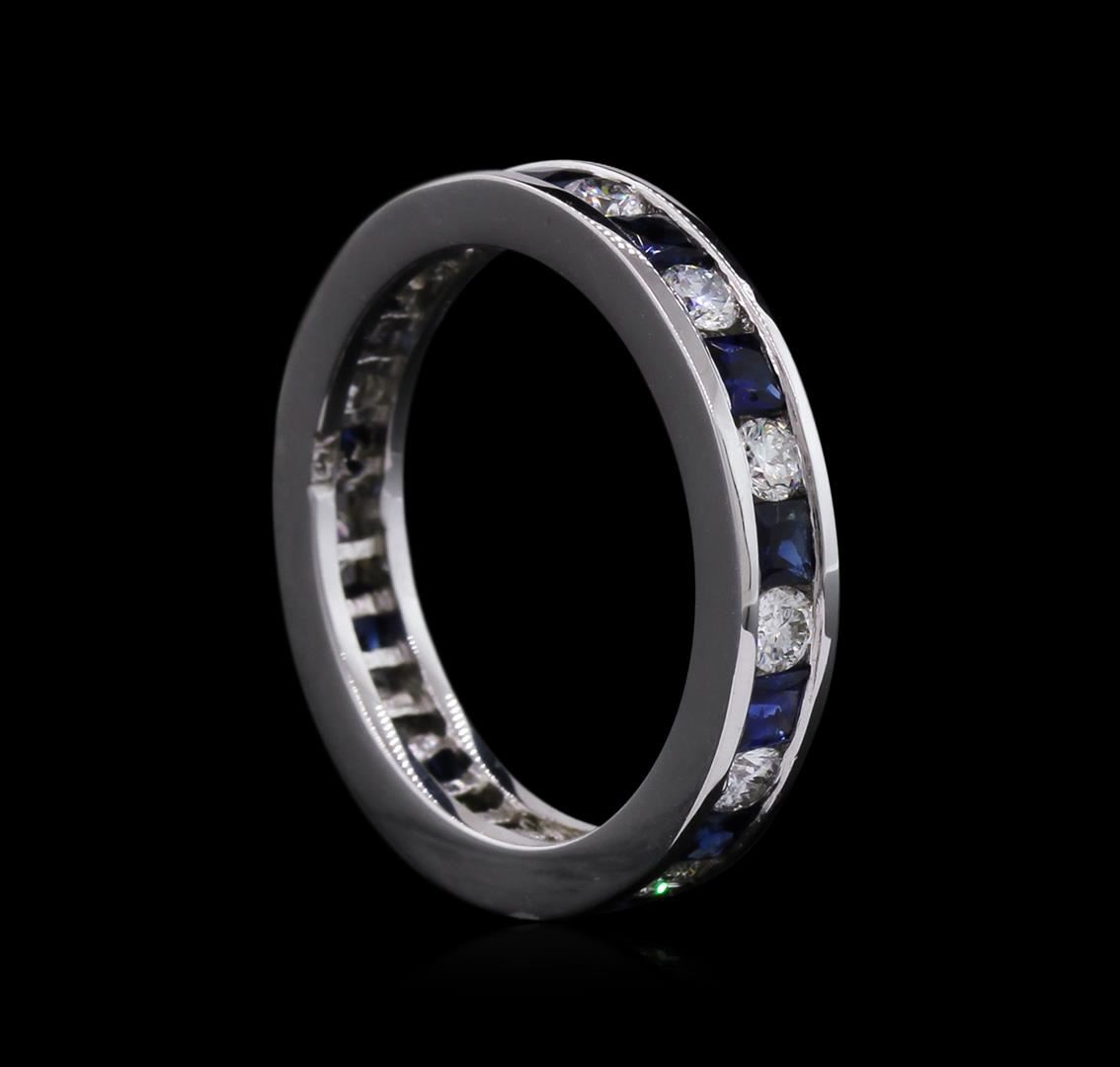 One electronically tested 14KT white gold lady's cast eternity band with a bright polish finish. The featured lady's ring has a shank measuring 3.65 millimeters wide. Identified with markings of "14K". Condition is new, good workmanship. Containing: Thirteen channel set princess modified brilliant cut natural blue sapphires, measuring 2.40 x 2.30 x 1.50mm, approximate total weight of 1.20ct., clarity is eye clean, type II, medium dark, moderately strong, violetish blue color, (GIA vB 6/4), cut is very good. Colored gemstones are presumed to have been subjected to commonly used enhancement processes. Graded in the setting. Thirteen channel set round brilliant cut diamonds, measuring 2.40 - 2.30 x 1.48mm (depth est.) approximate total weight of 13 Stones = 0.65ct. Graded in the setting. Clarity: VS-1 to SI-1. Color: G - Very Good. Total Weight of Colored Stones 1.20ct. Total Weight of Diamonds 0.65ct. Total Weight of Band 3.40gm. GAS Appraised at $4,030.00.
