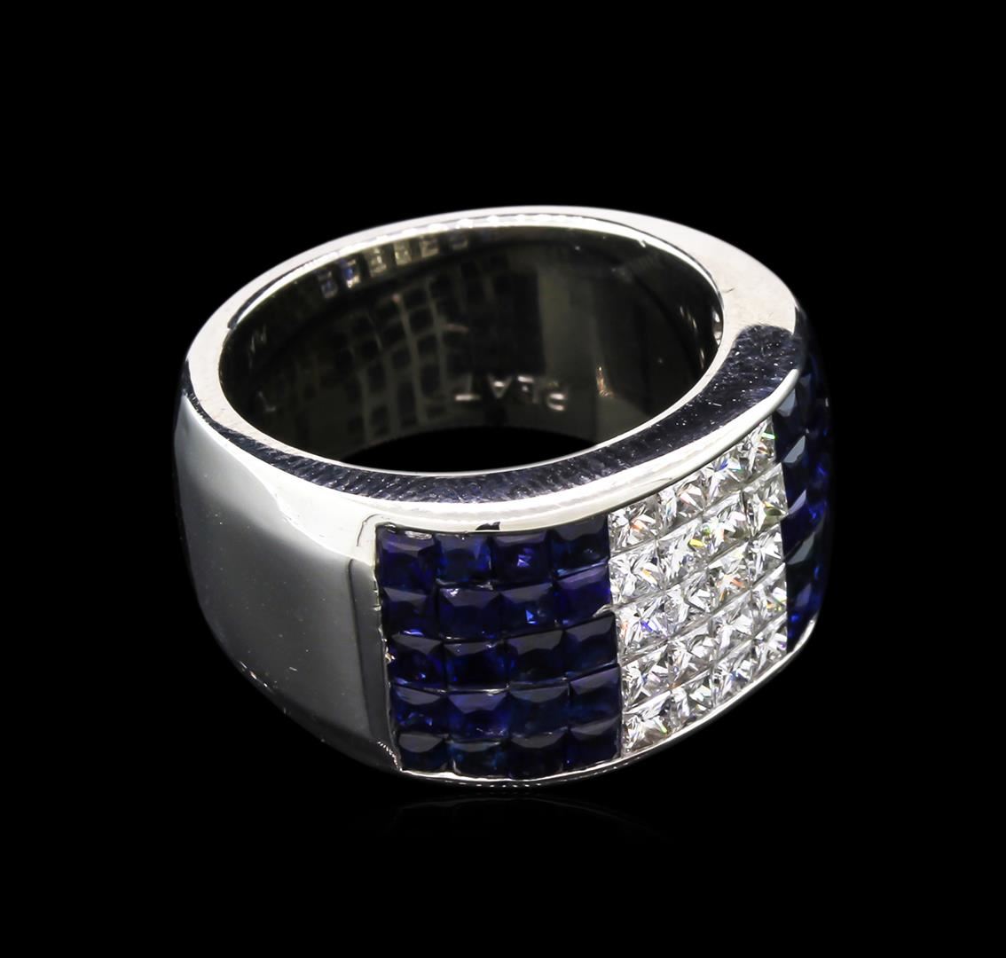One electronically tested platinum lady's cast fashion ring with a wide band with a bright polish finish. The featured lady's ring has a shank measuring 8.5 millimeters wide. Trademark is Carriere. Identified with markings of "PLAT". Condition is used, good workmanship. Containing: Forty invisible set princess modified brilliant cut natural blue sapphires, measuring 1.80 x 1.70 x 1.11mm, approximate total weight of 1.20ct., clarity is eye clean, type II, medium dark, very slightly grayish, violetish blue color, (GIA vB 6/3), cut is good. Transmitting light with a minimum of distortion, transparent. Colored gemstones are presumed to have been subjected to commonly used enhancement processes. Graded in the setting. Twenty invisible set princess cut diamonds, measuring 1.80 x 1.75 x 1.32mm (depth est.) approximate total weight of 20 Stones = 0.60ct. Graded in the setting. Clarity: VS-1 to VS-2. Color: G - I. Cut Very Good. Total Weight of Colored Stones 1.20ct. Total Weight of Diamonds 0.60ct. Total Weight of Ring 24.90gm. GAS Appraised at $8,020.00.
