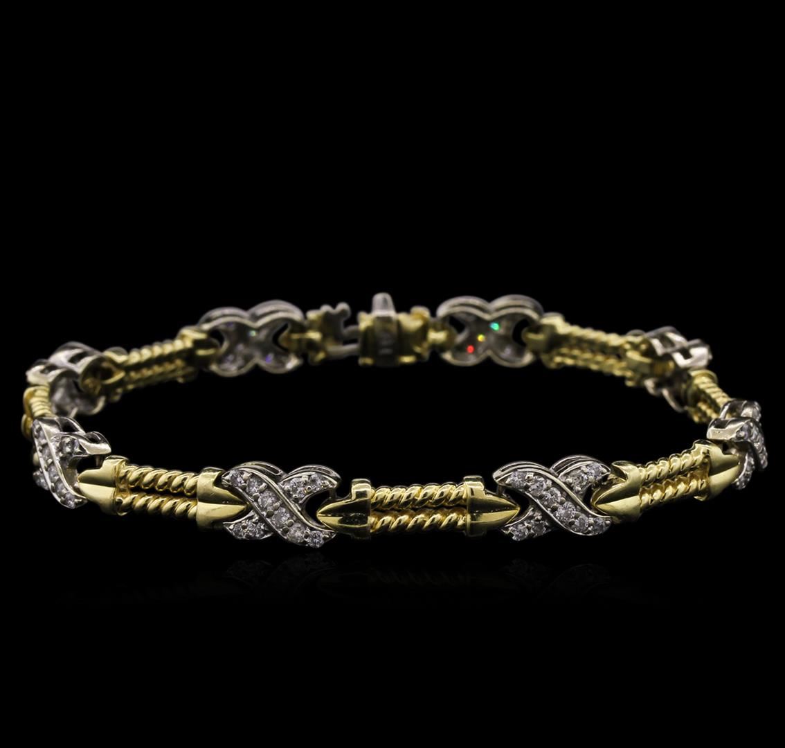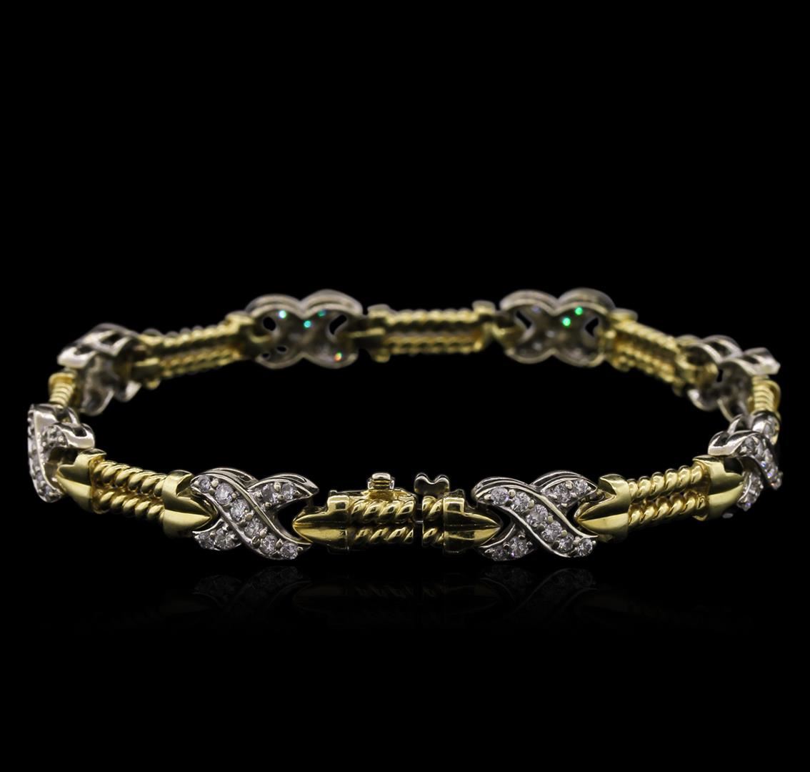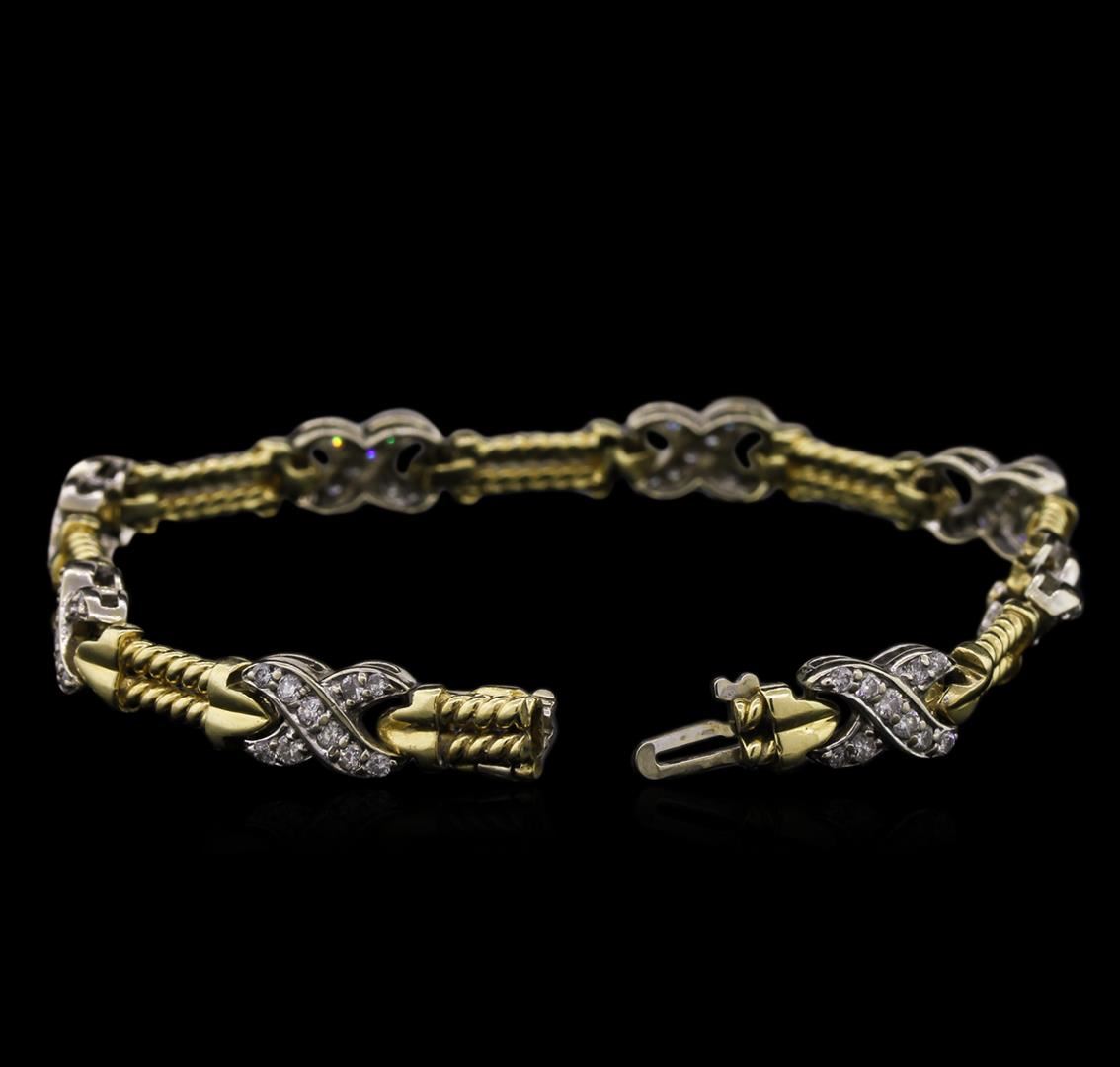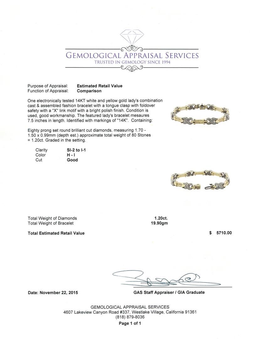 One electronically tested 14KT white and yellow gold lady's combination cast & assembled fashion bracelet with a tongue clasp with foldover safety with a "X" link motif with a bright polish finish. The featured lady's bracelet measures 7.5 inches in length. Identified with markings of "14K". Condition is used, good workmanship. Containing: Eighty prong set round brilliant cut diamonds, measuring 1.70 - 1.50 x 0.99mm (depth est.) approximate total weight of 80 Stones = 1.20ct. Graded in the setting. Clarity: SI-2 to I-1. Color: H - I. Cut Good. Total Weight of Diamonds 1.20ct. Total Weight of Bracelet 19.90gm. GAS Appraised at $5,710.00.