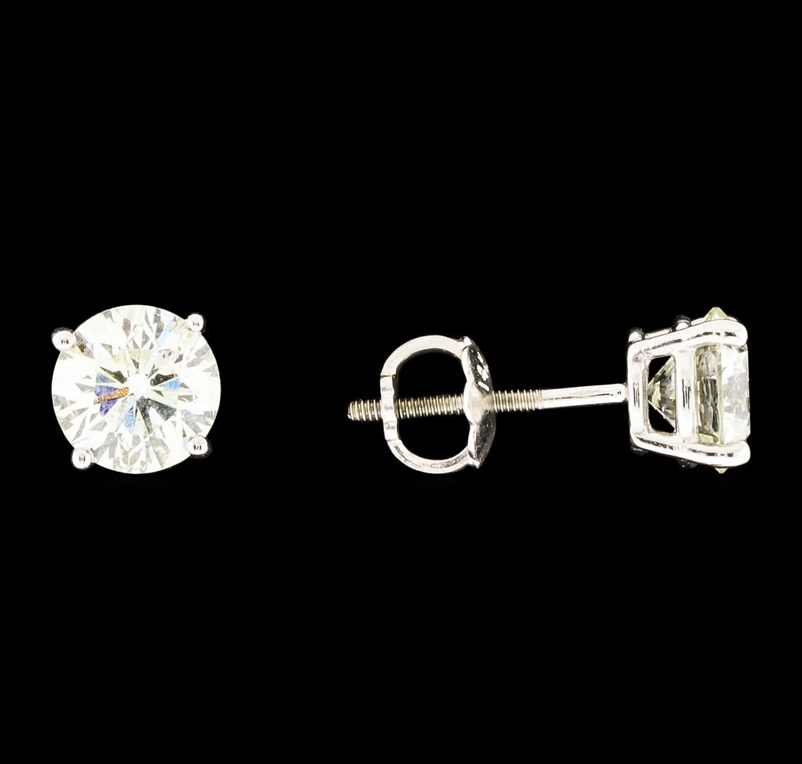 One pair electronically tested 14KT white gold cast & assembled diamond solitaire earrings with screw backs. Bright polish finish. Condition is good. Containing: One prong set round brilliant cut diamond, measuring 5.60 - 5.60 x 3.50mm (depth est.) approximate weight of 0.61ct with a strong white fluorescence. Graded in the setting. Clarity I-1. Color: L Depth 62.5%. Table: 55.4%. One prong set round brilliant cut diamond, measuring 5.60 - 5.60 x 3.50mm (depth est.) approximate weight of 0.59ct with a strong blue fluorescence. Graded in the setting. Clarity I-1. Color: L Depth 62.5%. Table: 55.4%.. Total Weight of Diamonds 1.20ct.. Total Weight of Earrings 1.07gm. AIG Appraised at $4,115.00.