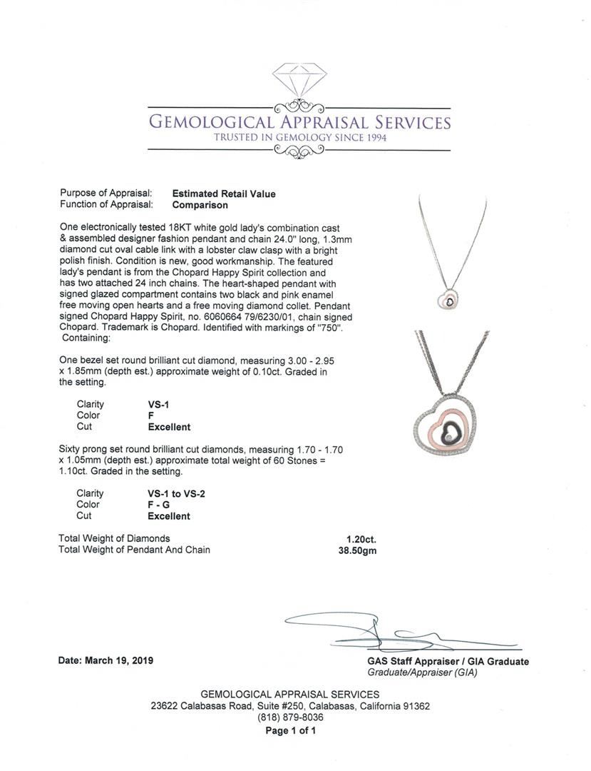 One electronically tested 18KT white gold lady's combination cast & assembled designer fashion pendant and chain 24.0' long, 1.3mm diamond cut oval cable link with a lobster claw clasp with a bright polish finish. The featured lady's pendant is from the Chopard Happy Spirit collection and has two attached 24 inch chains. The heart-shaped pendant with signed glazed compartment contains two black and pink enamel free moving open hearts and a free moving diamond collet. Pendant signed Chopard Happy Spirit, no. 6060664 79/6230/01, chain signed Chopard. Trademark is Chopard. Identified with markings of '750'. Condition is new, good workmanship. Containing: One bezel set round brilliant cut diamond, measuring 3.00 - 2.95 x 1.85mm (depth est.) approximate weight of 0.10 ct. Graded in the setting. Color F Clarity VS-1 Cut Excellent Sixty prong set round brilliant cut diamonds, measuring 1.70 - 1.70 x 1.05mm (depth est.) approximate total weight of 60 Stones = 1.10 ct. Graded in the setting. Color F - G Clarity VS-1 to VS-2 Cut Excellent. Total Weight of Diamonds 1.20 ct.. Total Weight of Pendant And Chain 38.50gm GAS Appraised at $6805.00. GAS Appraised.