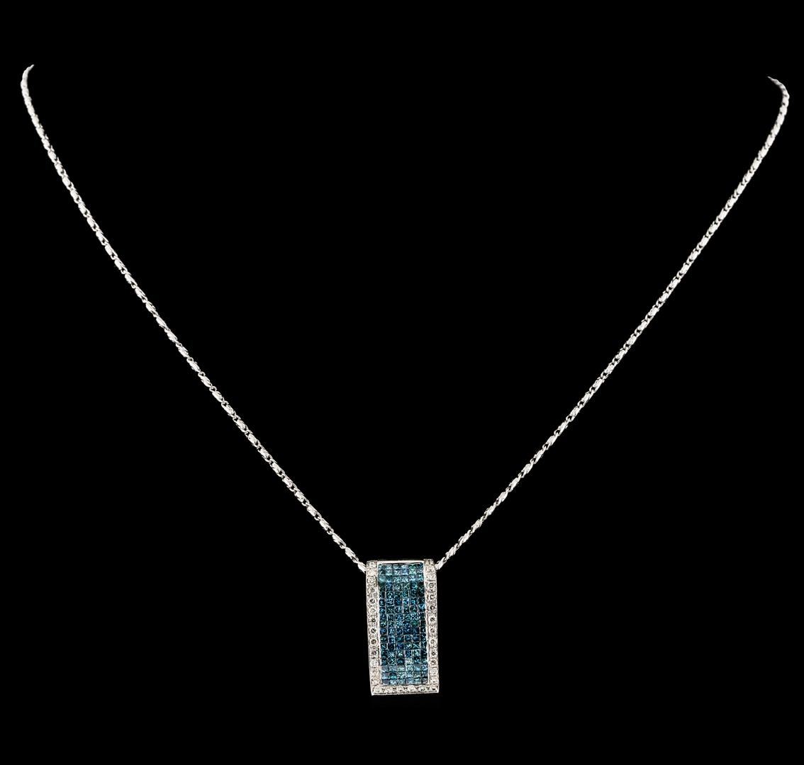One electronically tested 18KT white gold lady's combination cast & assembled fashion pendant & chain 16.0' long, 1.2mm diamond cut link with a lobster claw clasp with a bright polish finish. Identified with markings of '18K'. Condition is new, good workmanship. Containing: One Hundred Two invisible set princess cut diamonds, measuring 1.15 x 1.10 x 0.83mm (depth est.) approximate total weight of 102 Stones = 0.90ct. Colored gemstones are presumed to have been subjected to commonly used enhancement processes. Graded in the setting. Clarity VS-2 to SI-1 Cut Very Good Thirty-Two bead set round brilliant cut diamonds, measuring 1.40 - 1.30 x 0.84mm (depth est.) approximate total weight of 32 Stones = 0.30ct. Graded in the setting. Clarity SI-1 to I-1. Color: H - I Cut Good. Total Weight of Diamonds 1.20ct.. Total Weight of Pendant & Chain 8.20gm. GAS Appraised at $5,765.00.
