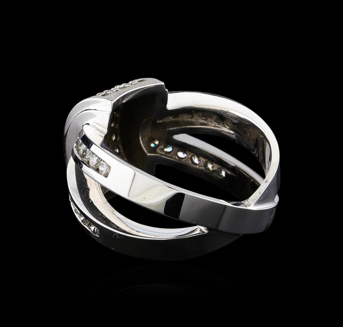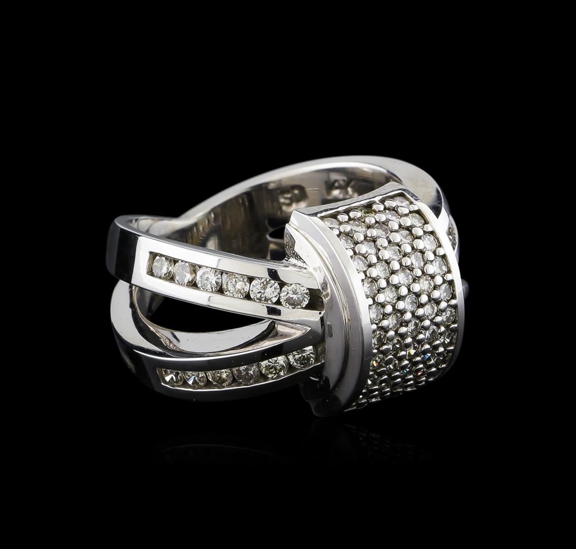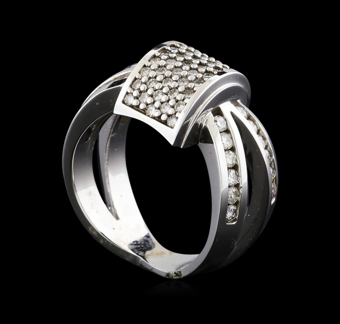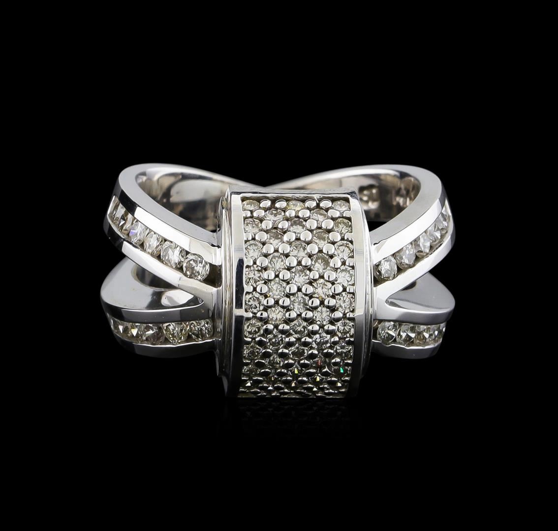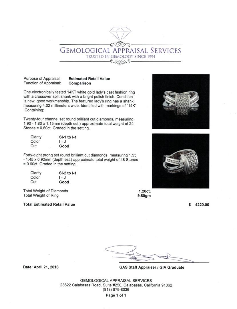 One electronically tested 14KT white gold lady's cast fashion ring with a crossover split shank with a bright polish finish. The featured lady's ring has a shank measuring 4.02 millimeters wide. Identified with markings of "14K". Condition is new, good workmanship. Containing: Twenty-Four channel set round brilliant cut diamonds, measuring 1.90 - 1.80 x 1.15mm (depth est.) approximate total weight of 24 Stones = 0.60ct. Graded in the setting. Clarity: SI-1 to I-1. Color: I - Good Forty-Eight prong set round brilliant cut diamonds, measuring 1.55 - 1.45 x 0.92mm (depth est.) approximate total weight of 48 Stones = 0.60ct. Graded in the setting. Clarity: SI-2 to I-1. Color: I - Good. Total Weight of Diamonds 1.20ct. Total Weight of Ring 9.80gm. GAS Appraised at $4,220.00.