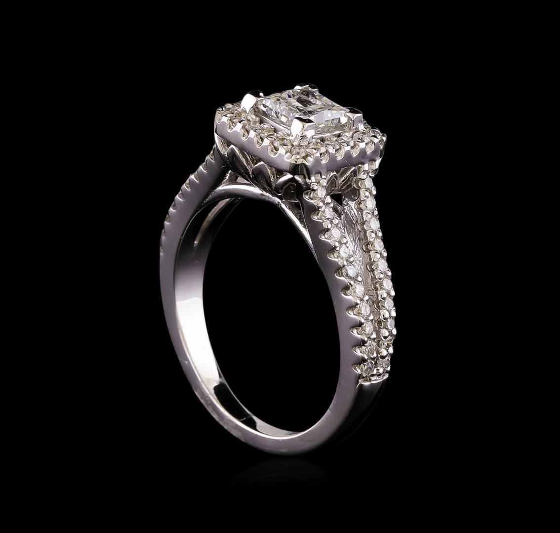 One electronically tested 14KT white gold lady's cast wedding ring with a split shank halo with a bright polish finish. The featured lady's ring has a shank measuring 1.94 millimeters wide. Identified with markings of '14K'. Condition is new, good workmanship. Containing: One prong set princess cut diamond, measuring 4.71 x 4.55 x 3.70mm (depth est.) , 10.00.%. GTCF approximate weight of 0.72ct. Graded in the setting. Clarity I-1. Color: G - H Cut Good Sixty prong set round brilliant cut diamonds, measuring 1.30 - 1.25 x 0.79mm (depth est.) approximate total weight of 60 Stones = 0.48ct. Graded in the setting. Clarity SI-1 to SI-2. Color: G - H Cut Good. Total Weight of Diamonds 1.20ct.. Total Weight of Ring 5.70gm. GAS Appraised at $6,775.00.