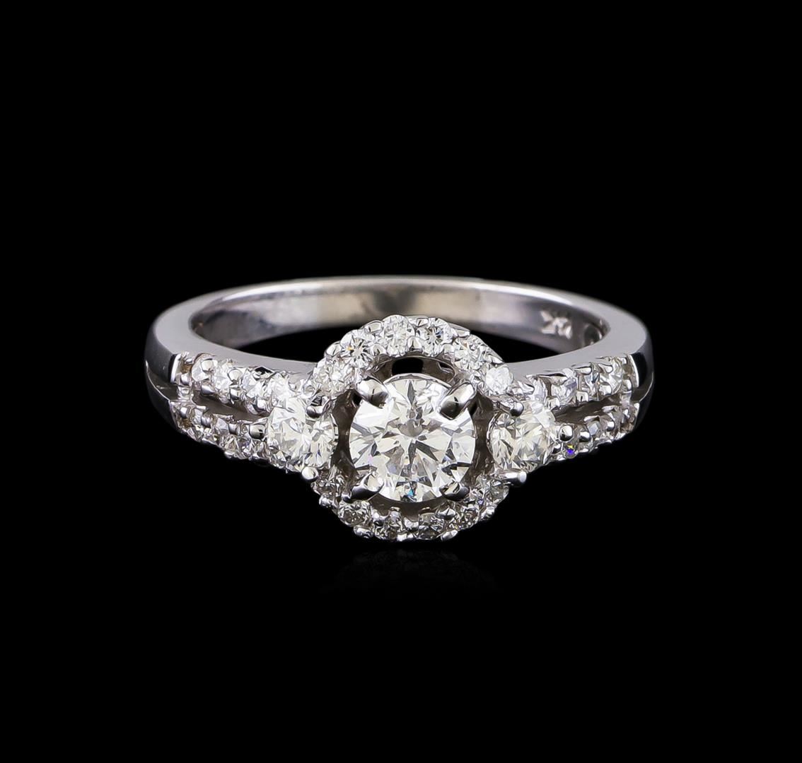 One electronically tested 14KT white gold lady's cast wedding ring split shank halo with a bright polish finish. The featured lady's ring has a shank measuring 2.13 millimeters in width. Identified with markings of "14K". Condition is new, good workmanship. Containing: One prong set round brilliant cut diamond, measuring 5.21 - 5.13 x 3.15mm (depth est.) approximate weight of 0.53ct. Graded in the setting. Clarity: SI-2. Color: Very Good Two prong set round brilliant cut diamonds, measuring 3.15 - 3.10 x 1.94mm (depth est.) approximate total weight of 2 Stones = 0.25ct. Graded in the setting. Clarity: VS-2 to SI-1. Color: H - I. Cut Very Good Twenty-Eight prong set round brilliant cut diamonds, measuring 1.60 - 1.50 x 0.96mm (depth est.) approximate total weight of 28 Stones = 0.42ct. Graded in the setting. Clarity: SI-1 to SI-2. Color: G - Good. Total Weight of Diamonds 1.20ct. Total Weight of Split Shank Halo 3.50gm. GAS Appraised at $6,185.00.