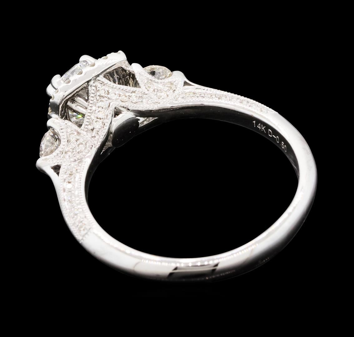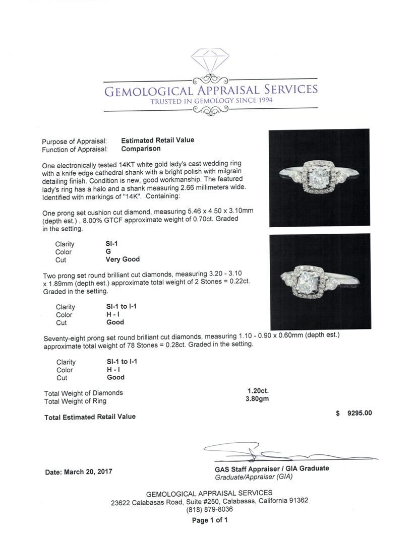 One electronically tested 14KT white gold lady's cast wedding ring with a knife edge cathedral shank with a bright polish with milgrain detailing finish. The featured lady's ring has a halo and a shank measuring 2.66 millimeters wide. Identified with markings of '14K'. Condition is new, good workmanship. Containing: One prong set cushion cut diamond, measuring 5.46 x 4.50 x 3.10mm (depth est.) , 8.00.%. GTCF approximate weight of 0.70ct. Graded in the setting. Color G Clarity SI-1 Cut Very Good Two prong set round brilliant cut diamonds, measuring 3.20 - 3.10 x 1.89mm (depth est.) approximate total weight of 2 Stones = 0.22ct. Graded in the setting. Color H - I Clarity SI-1 to I-1 Cut Good Seventy-Eight prong set round brilliant cut diamonds, measuring 1.10 - 0.90 x 0.60mm (depth est.) approximate total weight of 78 Stones = 0.28ct. Graded in the setting. Color H - I Clarity SI-1 to I-1 Cut Good. Total Weight of Diamonds 1.20ct.. Total Weight of Ring 3.80gm GAS Appraised at $9,295.00.