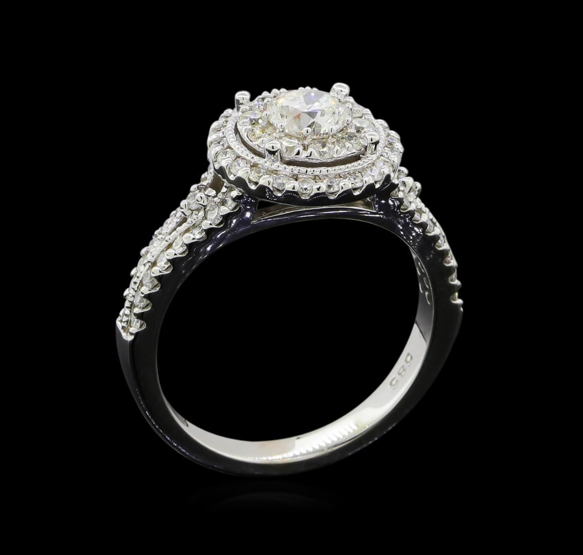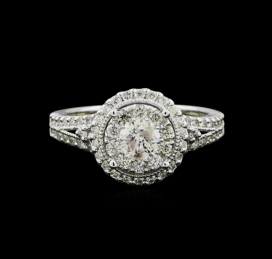 One electronically tested 14KT white gold lady's cast wedding ring with a double halo with a bright polish with milgrain detailing finish. The featured lady's ring has a shank measuring 2.63 millimeters wide. Identified with markings of '585'. Condition is new, good workmanship. Containing: One prong set round brilliant cut diamond, measuring 5.15 - 5.12 x 3.21mm (depth est.) approximate weight of 0.51ct. Graded in the setting. Clarity I-1. Color: F - G Cut Very Good Ten prong set round brilliant cut diamonds, measuring 1.90 - 1.80 x 1.11mm (depth est.) approximate total weight of 10 Stones = 0.23ct. Graded in the setting. Clarity VS-2 to SI-2. Color: G - H Cut Good Fifty-Six prong set round brilliant cut diamonds, measuring 1.35 - 1.25 x 0.79mm (depth est.) approximate total weight of 56 Stones = 0.46ct. Graded in the setting. Clarity SI-1 to I-1. Color: H - I Cut Good. Total Weight of Diamonds 1.20ct.. Total Weight of Ring 5.00gm. GAS Appraised at $6,240.00.
