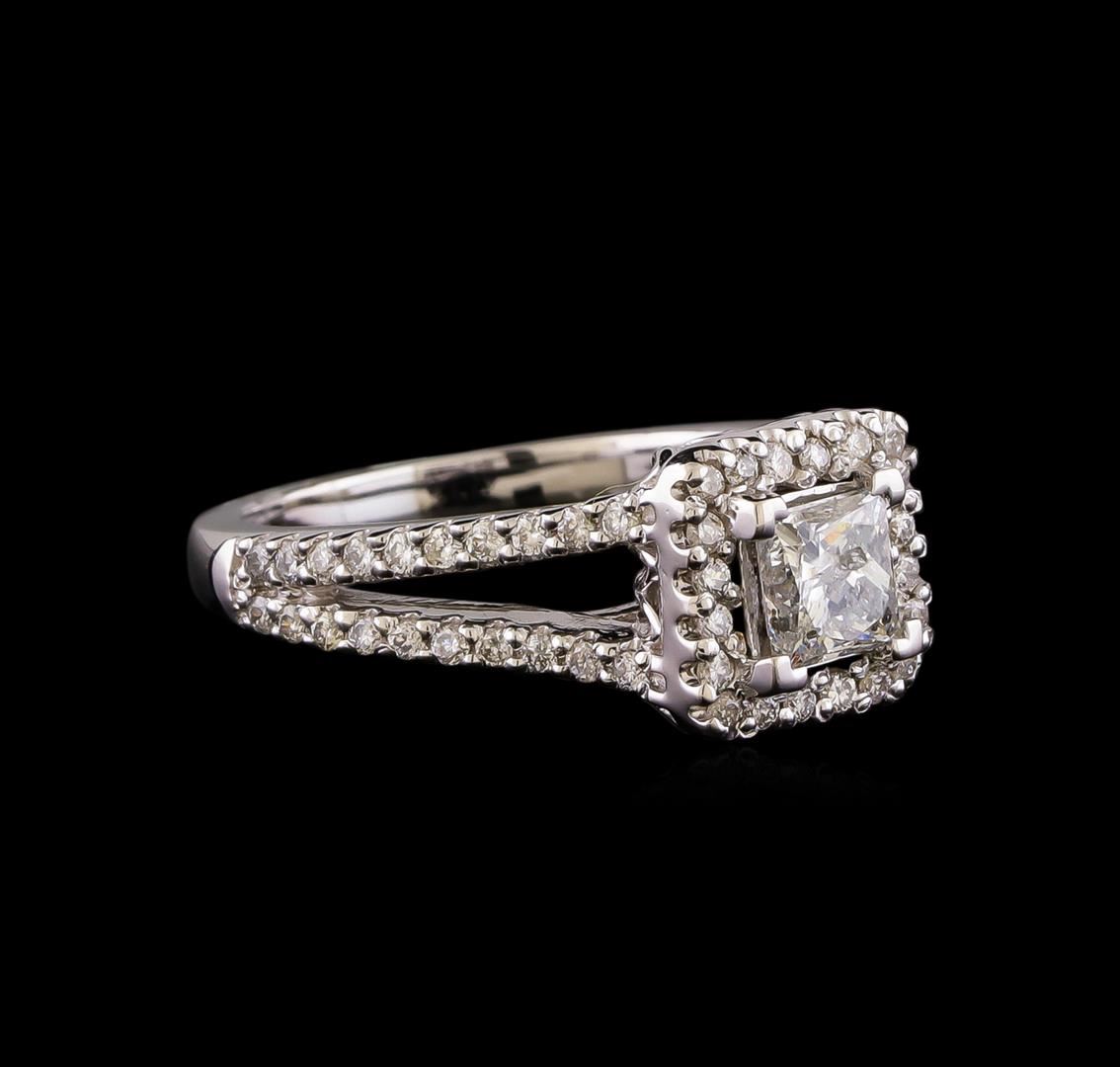 One electronically tested 14KT white gold lady's cast wedding ring with a split shank halo with a bright polish finish. The featured lady's ring has a shank measuring 1.94 millimeters wide. Identified with markings of '14K'. Condition is new, good workmanship. Containing: One prong set princess cut diamond, measuring 4.71 x 4.55 x 3.70mm (depth est.) , 10.00.%. GTCF approximate weight of 0.72ct. Graded in the setting. Clarity I-1. Color: G - H Cut Good Sixty prong set round brilliant cut diamonds, measuring 1.30 - 1.25 x 0.79mm (depth est.) approximate total weight of 60 Stones = 0.48ct. Graded in the setting. Clarity SI-1 to SI-2. Color: G - H Cut Good. Total Weight of Diamonds 1.20ct.. Total Weight of Ring 5.70gm. GAS Appraised at $6,775.00.